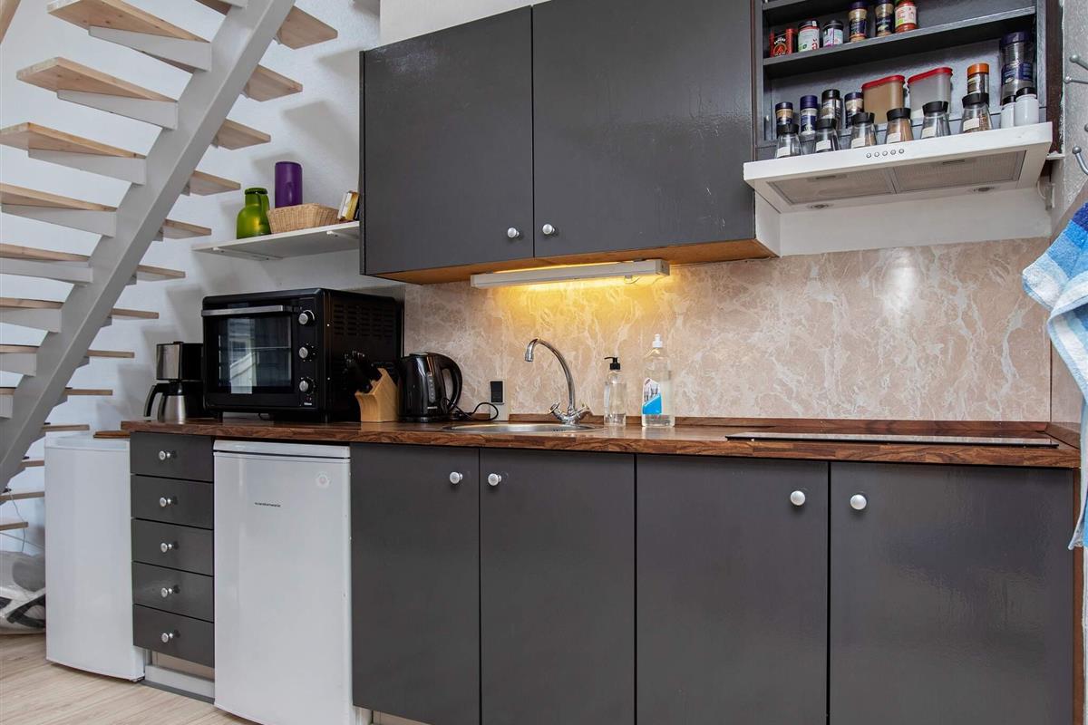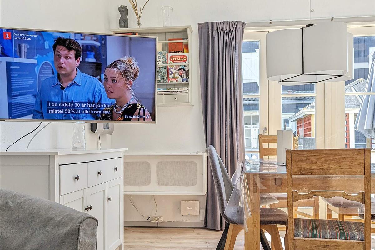 Das Ferienhaus ist zweckmäßig eingerichtet und hat einen Küchen-/Wohnbereich. In der Küche gibt es Herdplatten, Mini-Ofen und Kühlschrank mit Gefrierfach sowie einen kleineren 70l Gefrierschrank mit drei Fächern. Wohnzimmer mit Stereoanlage und TV mit dänischen und einigen deutschen Sendern zur Auswahl. Im Parterre befindet sich zudem ein Schlafzimmer mit zwei Einzelbetten. Die beiden anderen Schlafzimmer sind im 1. Stock untergebracht.