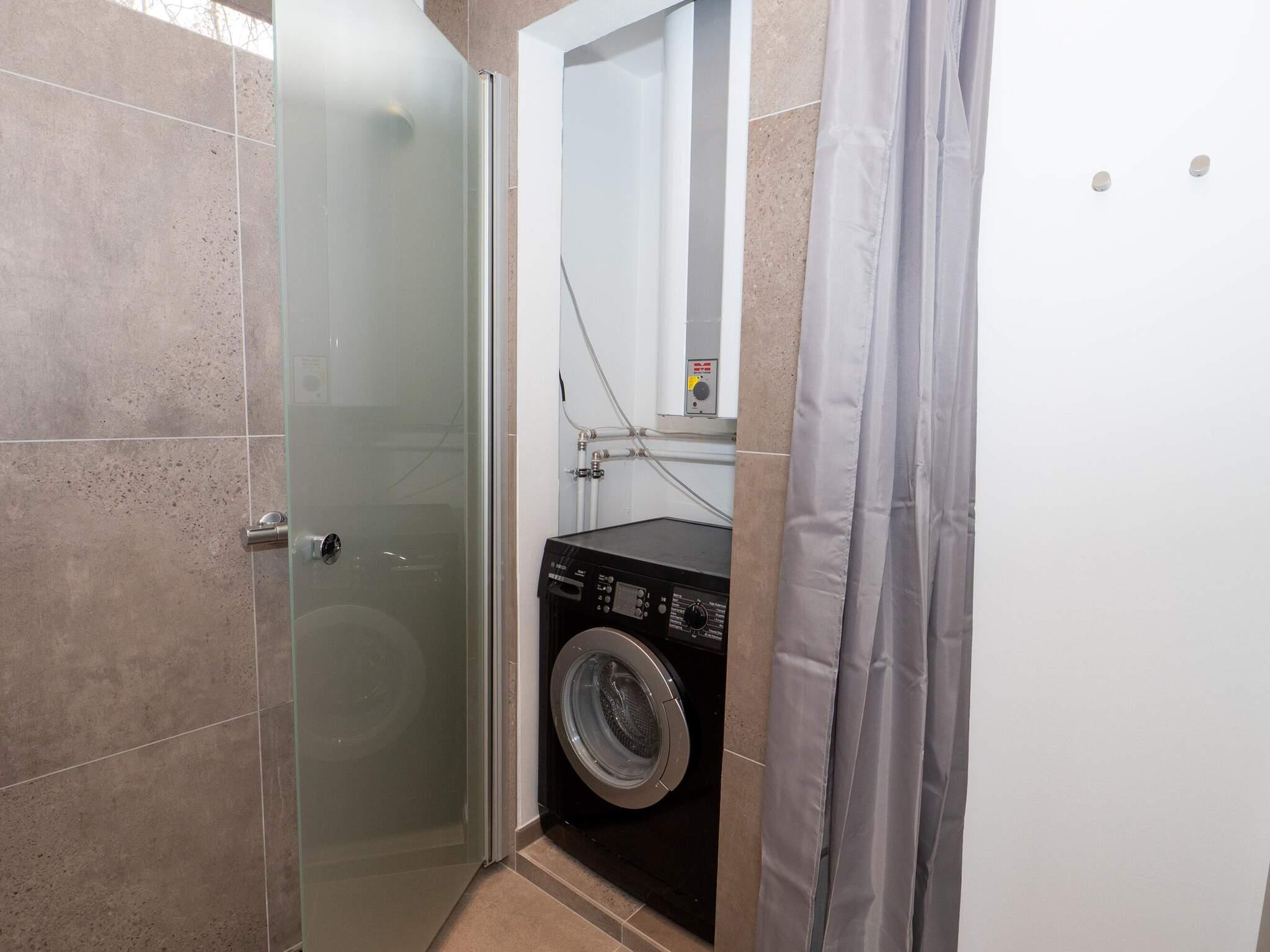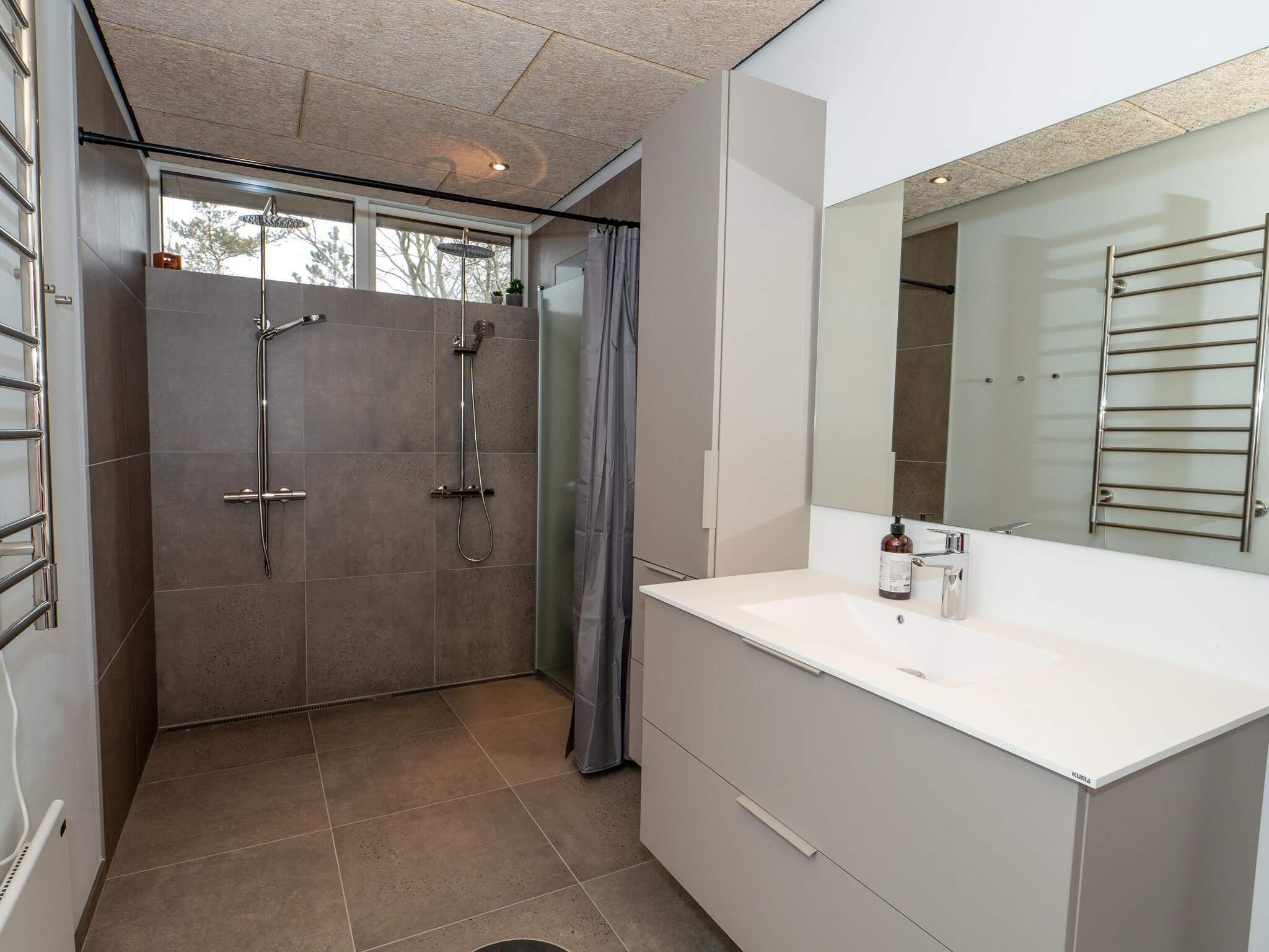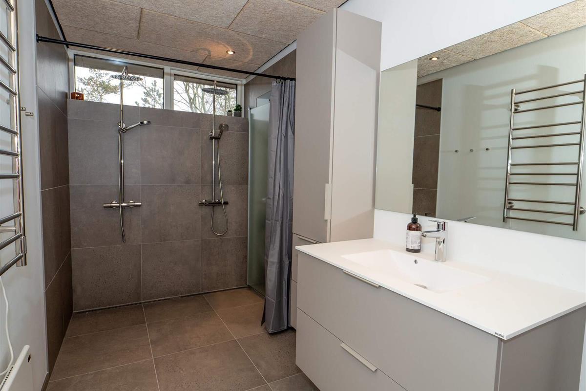 Es gibt zwei Badezimmer – eines mit Dusche, WC, Waschbecken und Fußbodenheizung, das andere mit Dusche, WC, Waschbecken, Fußbodenheizung und Waschmaschine.