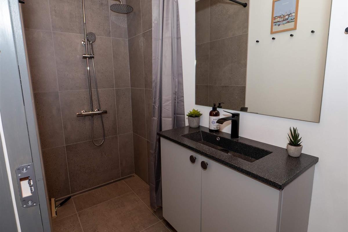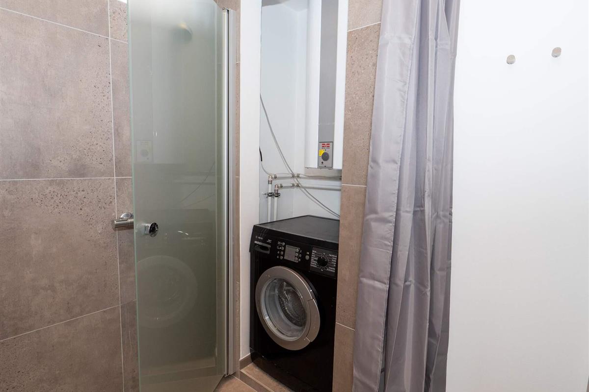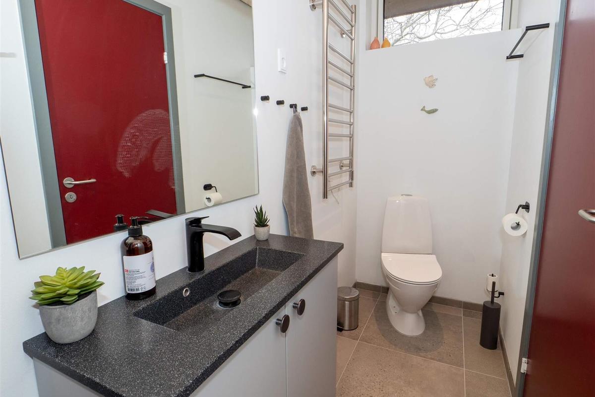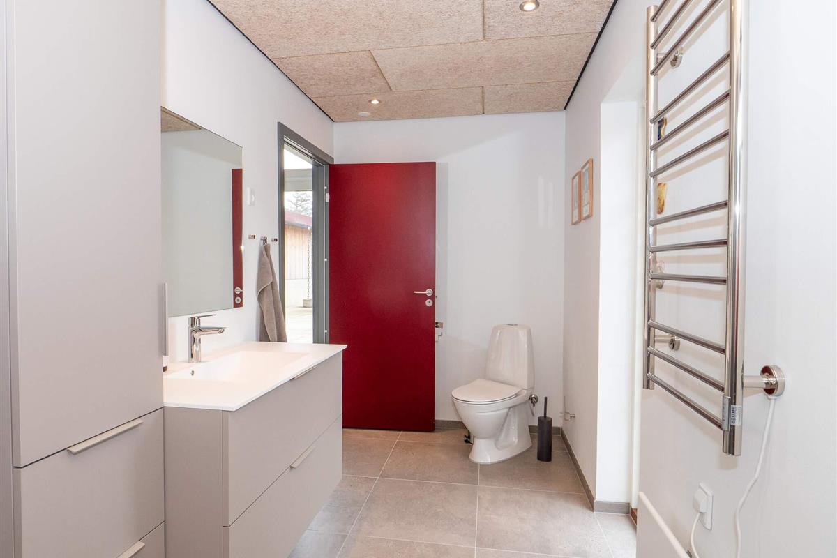 Es gibt zwei Badezimmer – eines mit Dusche, WC, Waschbecken und Fußbodenheizung, das andere mit Dusche, WC, Waschbecken, Fußbodenheizung und Waschmaschine.