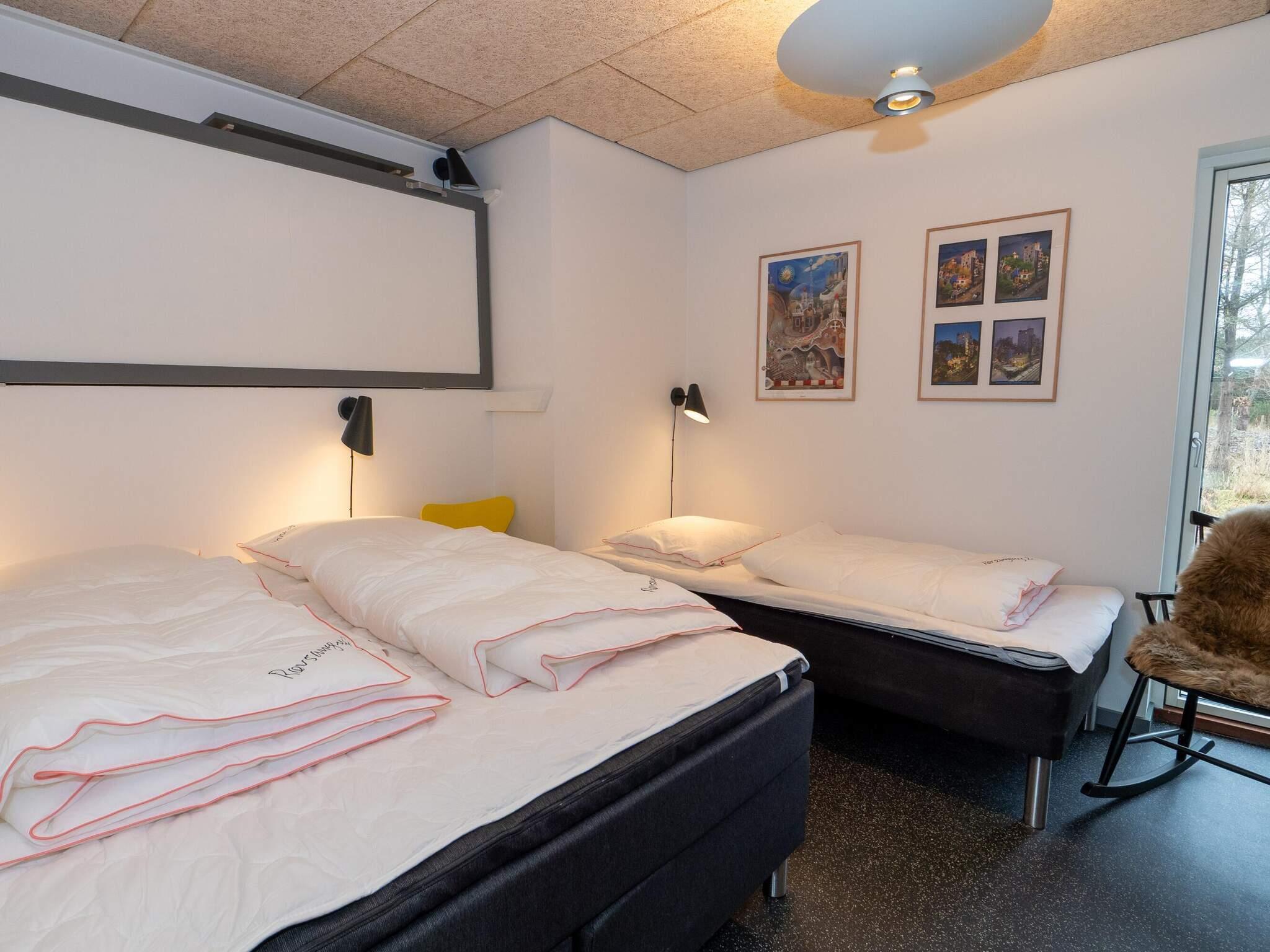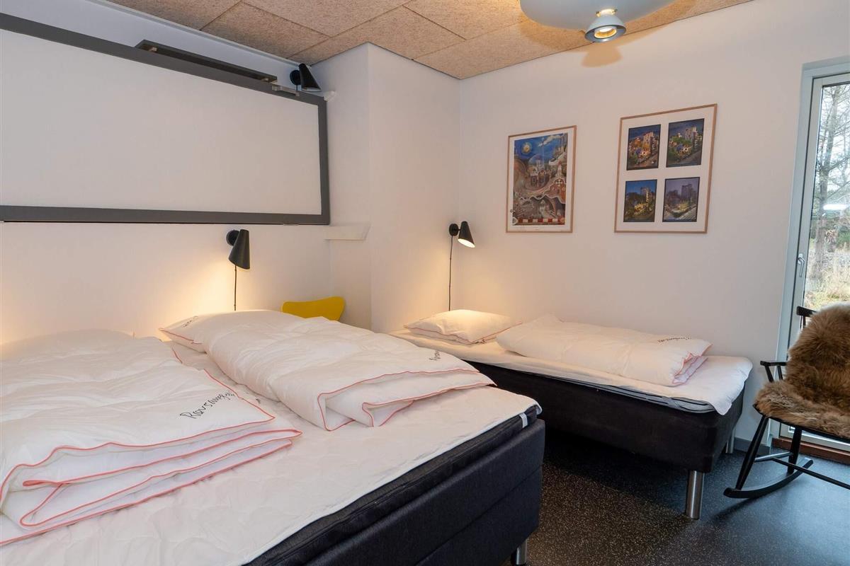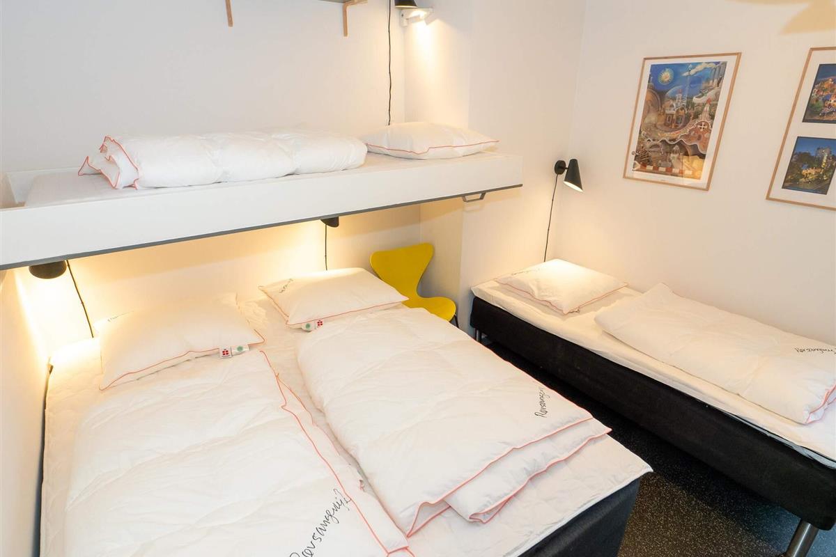 ein Schlafzimmer mit einem Doppelbett, einem Einzelbett und einem Hochbett – ideal für Familien mit Kindern.