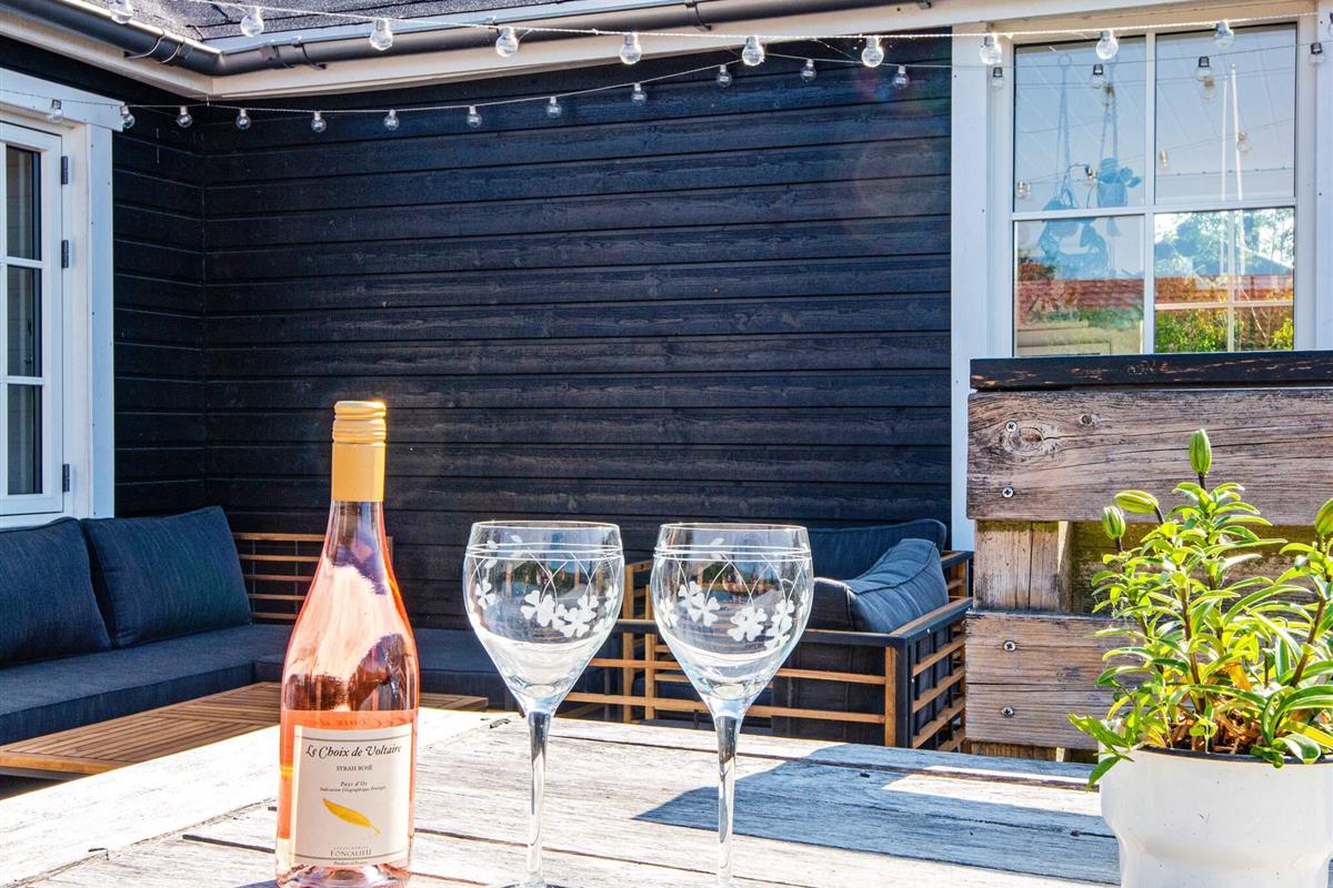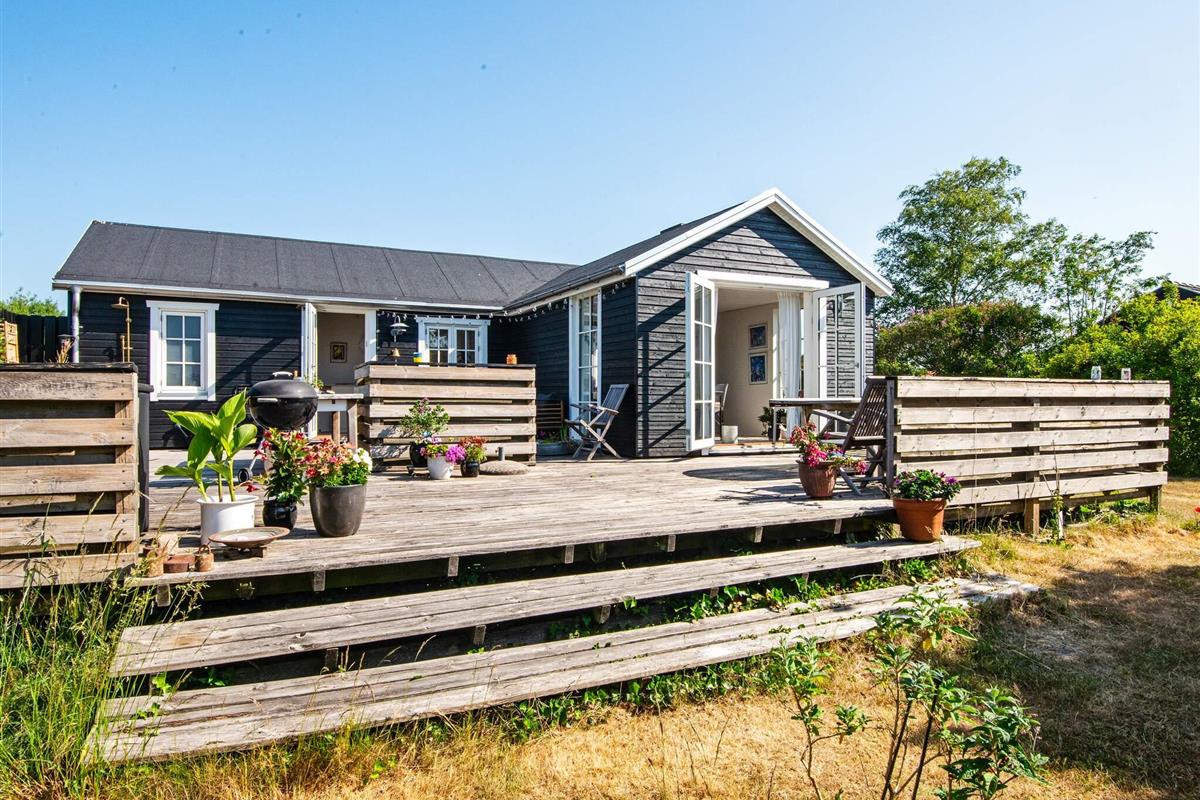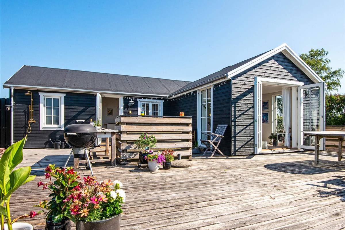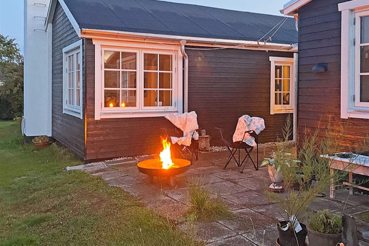 Im Außenbereich lädt die große, offene Terrasse zum Sonnenbaden ein, während die Kinder im Garten spielen. Das Anwesen verfügt außerdem über eine Feuerstelle für gesellige Abende im Freien und eine praktische Außendusche mit Warmwasser auf der Terrasse – ideal nach einem Tag am Strand.