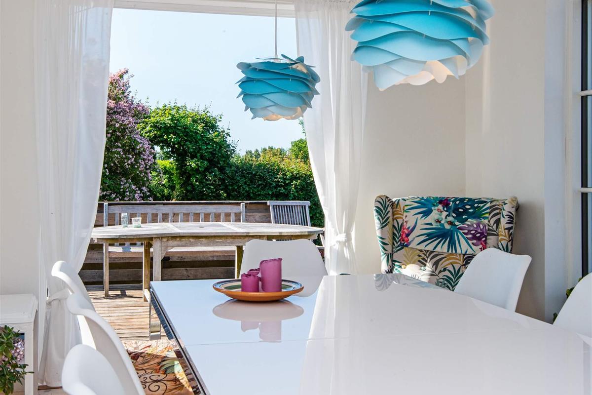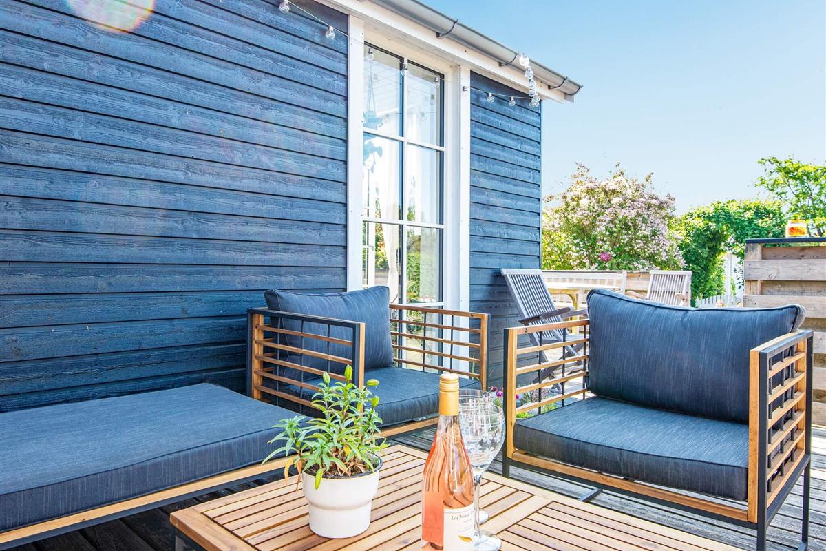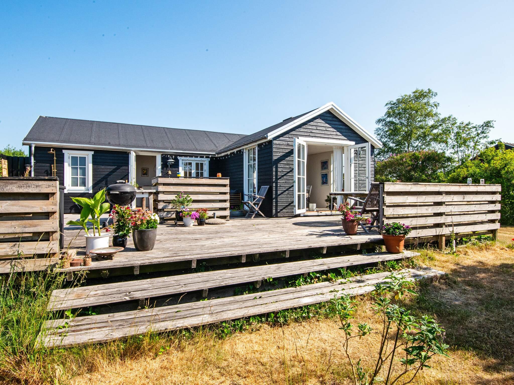 Im Außenbereich lädt die große, offene Terrasse zum Sonnenbaden ein, während die Kinder im Garten spielen. Das Anwesen verfügt außerdem über eine Feuerstelle für gesellige Abende im Freien und eine praktische Außendusche mit Warmwasser auf der Terrasse – ideal nach einem Tag am Strand.