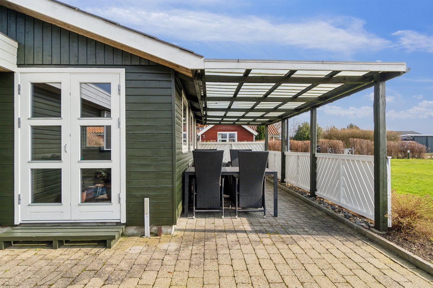 De vakantiewoning is gelegen op een 680 m² groot aangelegde tuin. Afstand tot de zee 175 m. Dichtstbijzijnde winkel 3000 m. Bij de vakantiewoning hoort terras. Daarnaast is er een overdekt terras. Gereedschapsruimte. Barbecue. Parkeerplaats bij het huis.