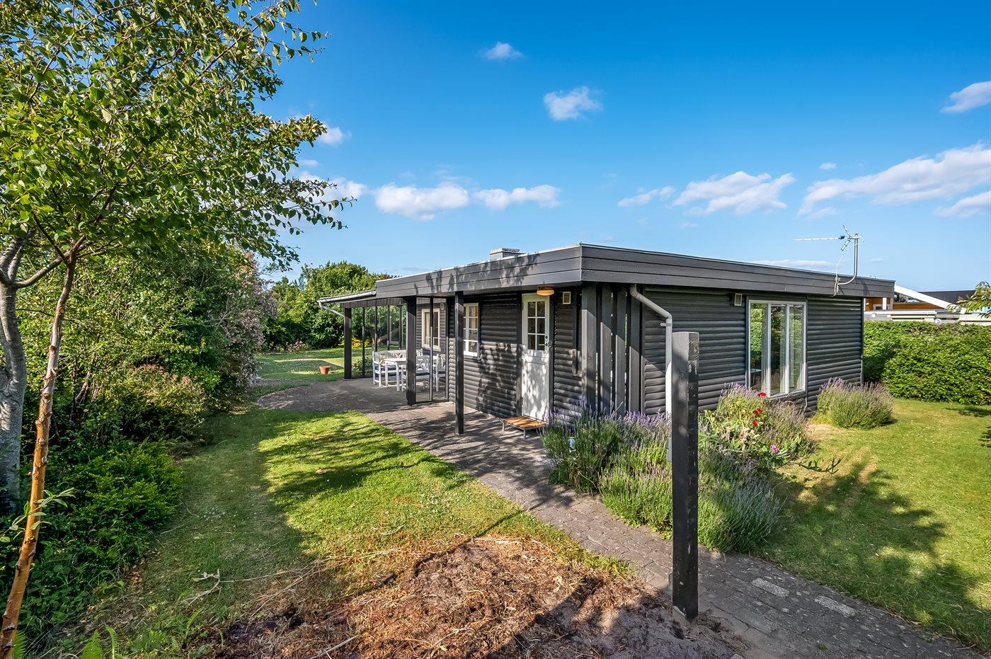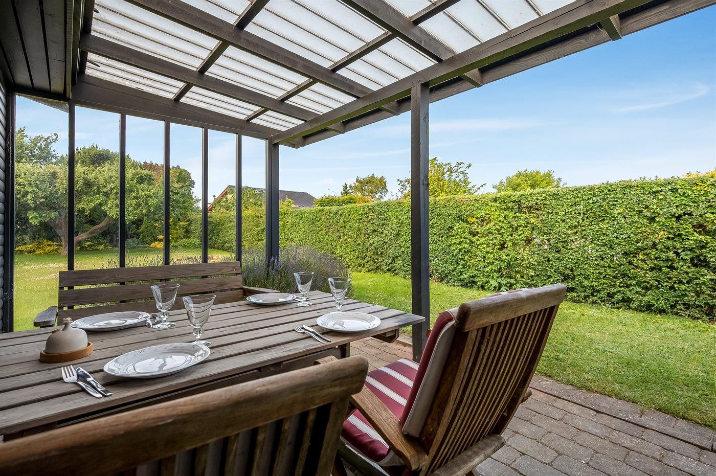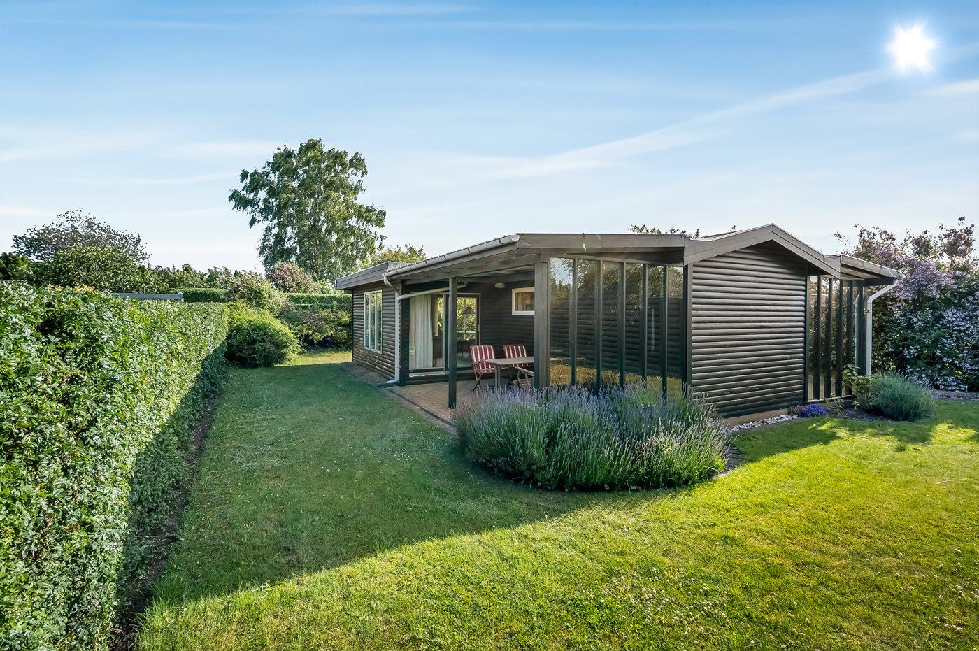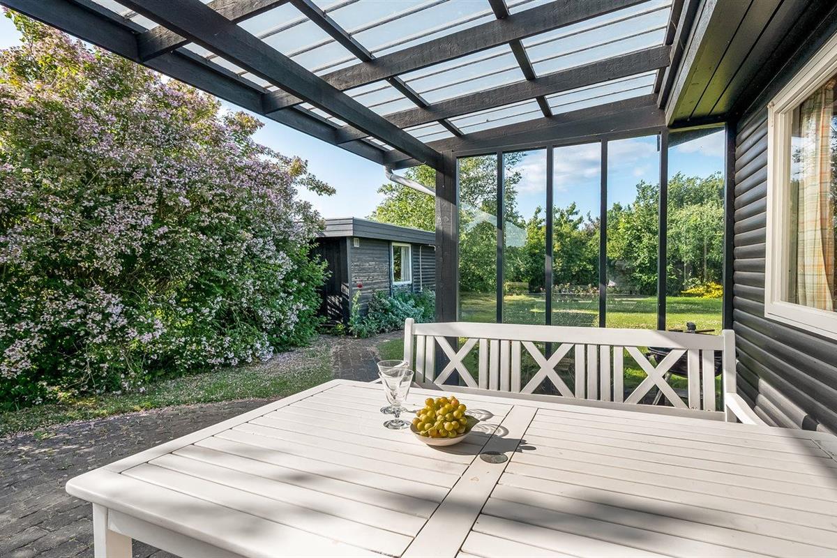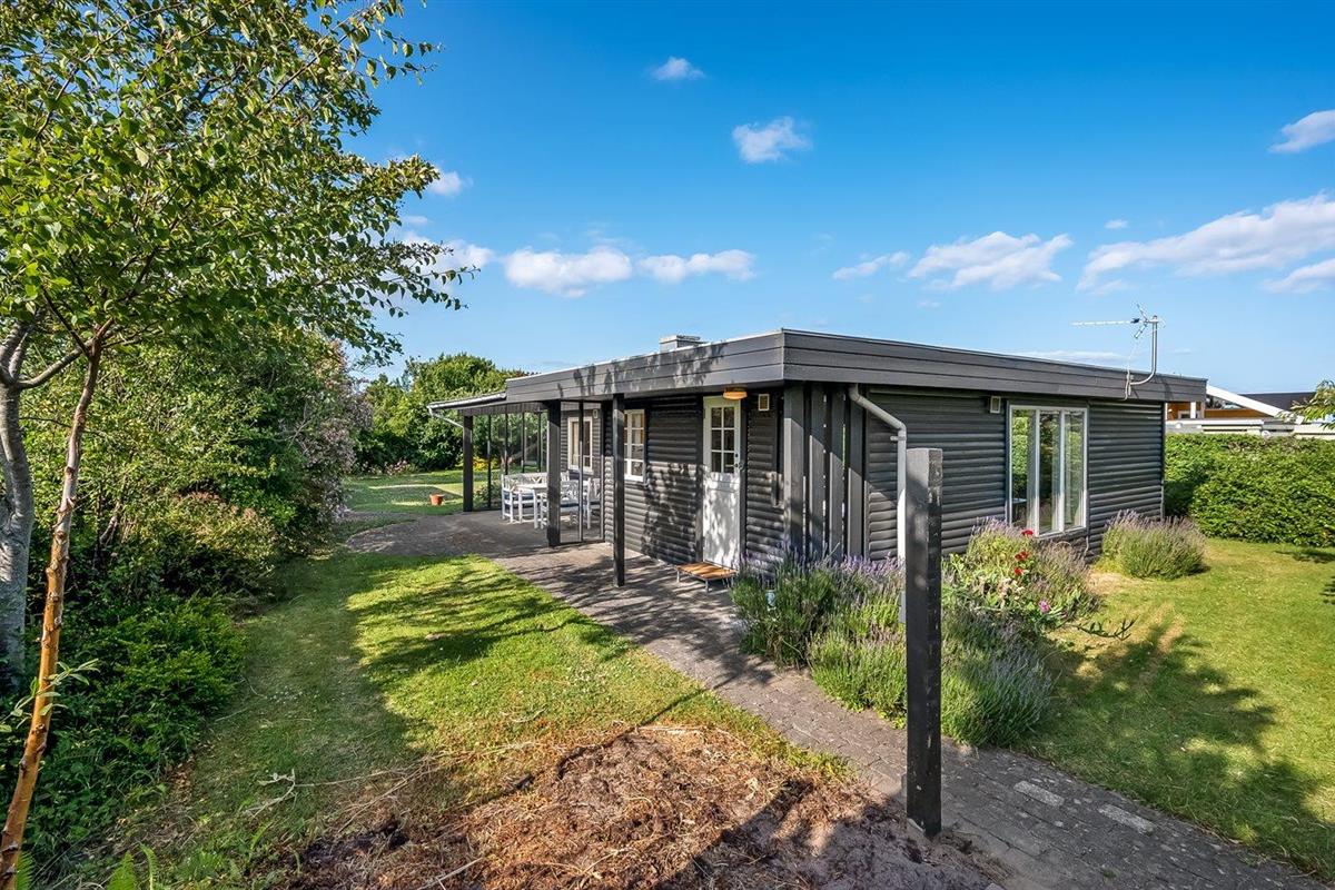 Knus vakantiehuisje met tuin en overdekt terras, slechts 75 m van zee in Malling, Denemarken.