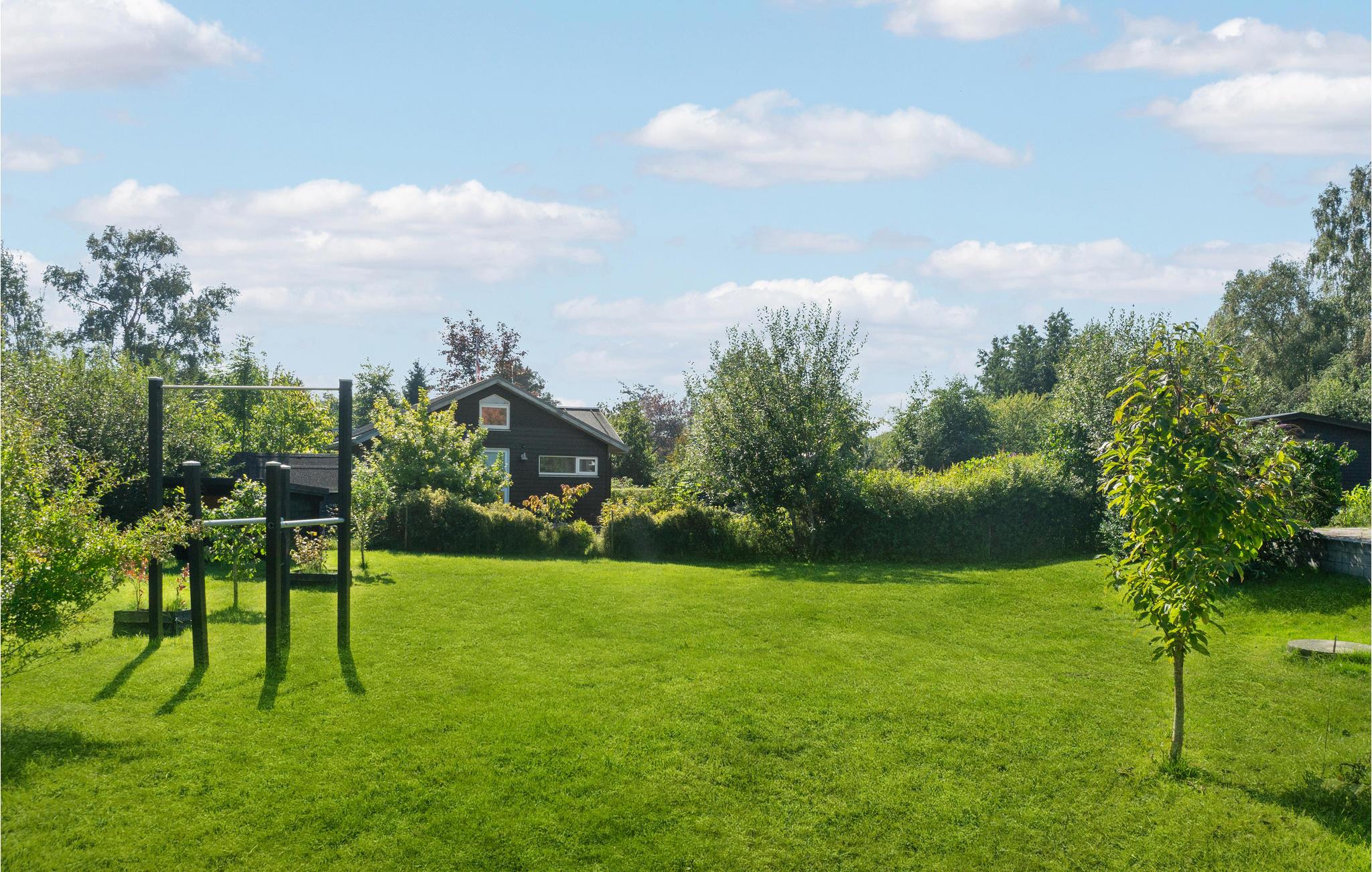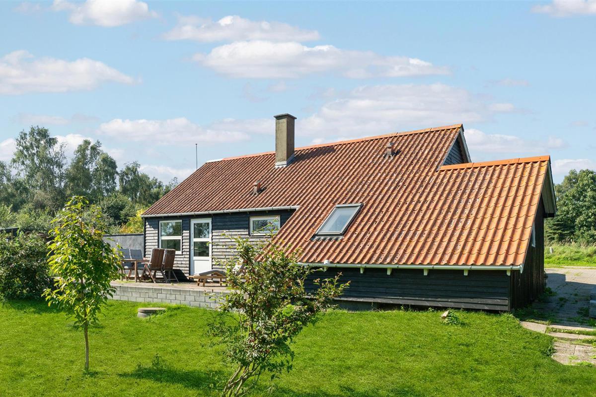 Dit modern houten vakantiehuis in Ajstrup Strand ligt op 350 m van het strand en biedt comfort met open haard en grote tuin.