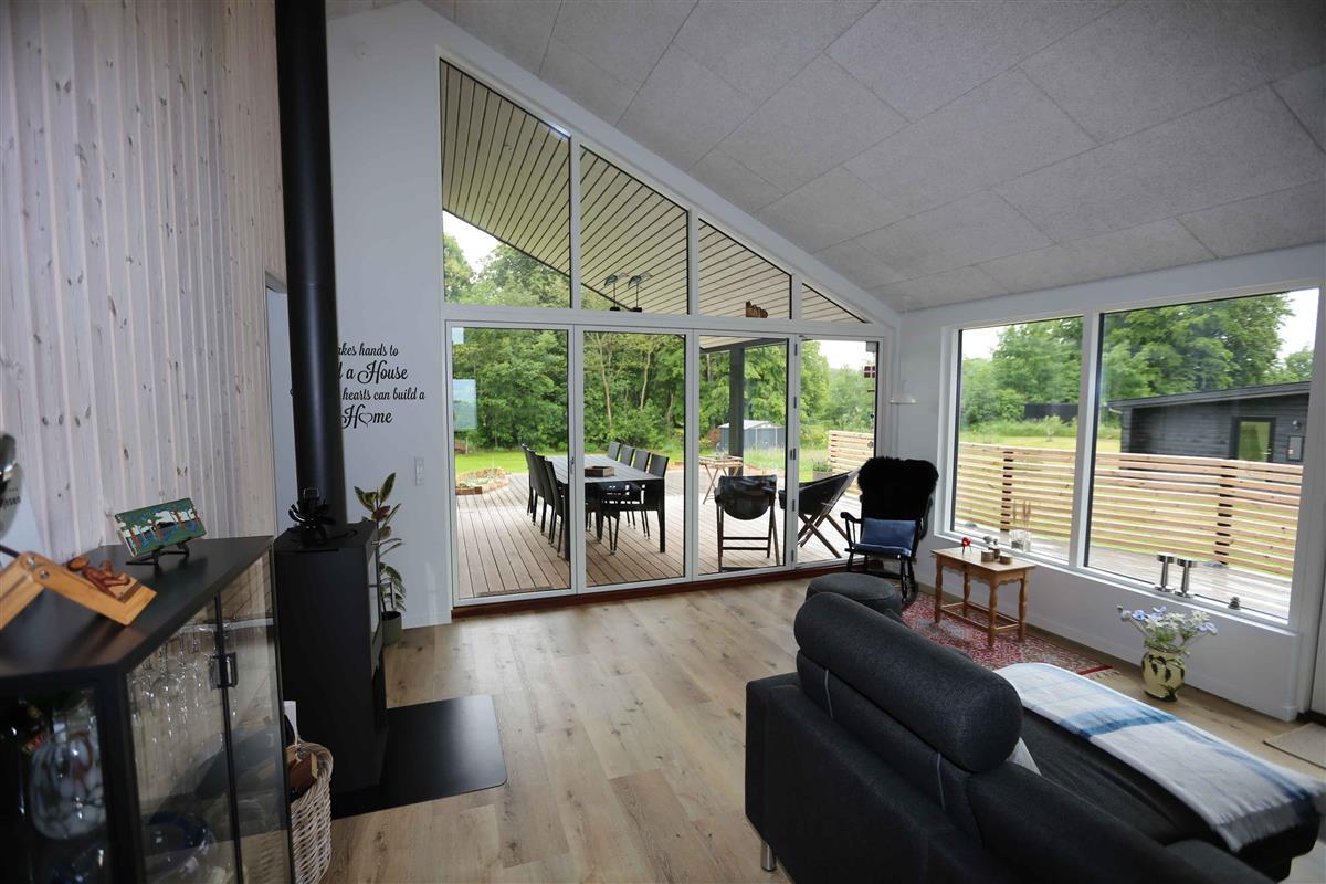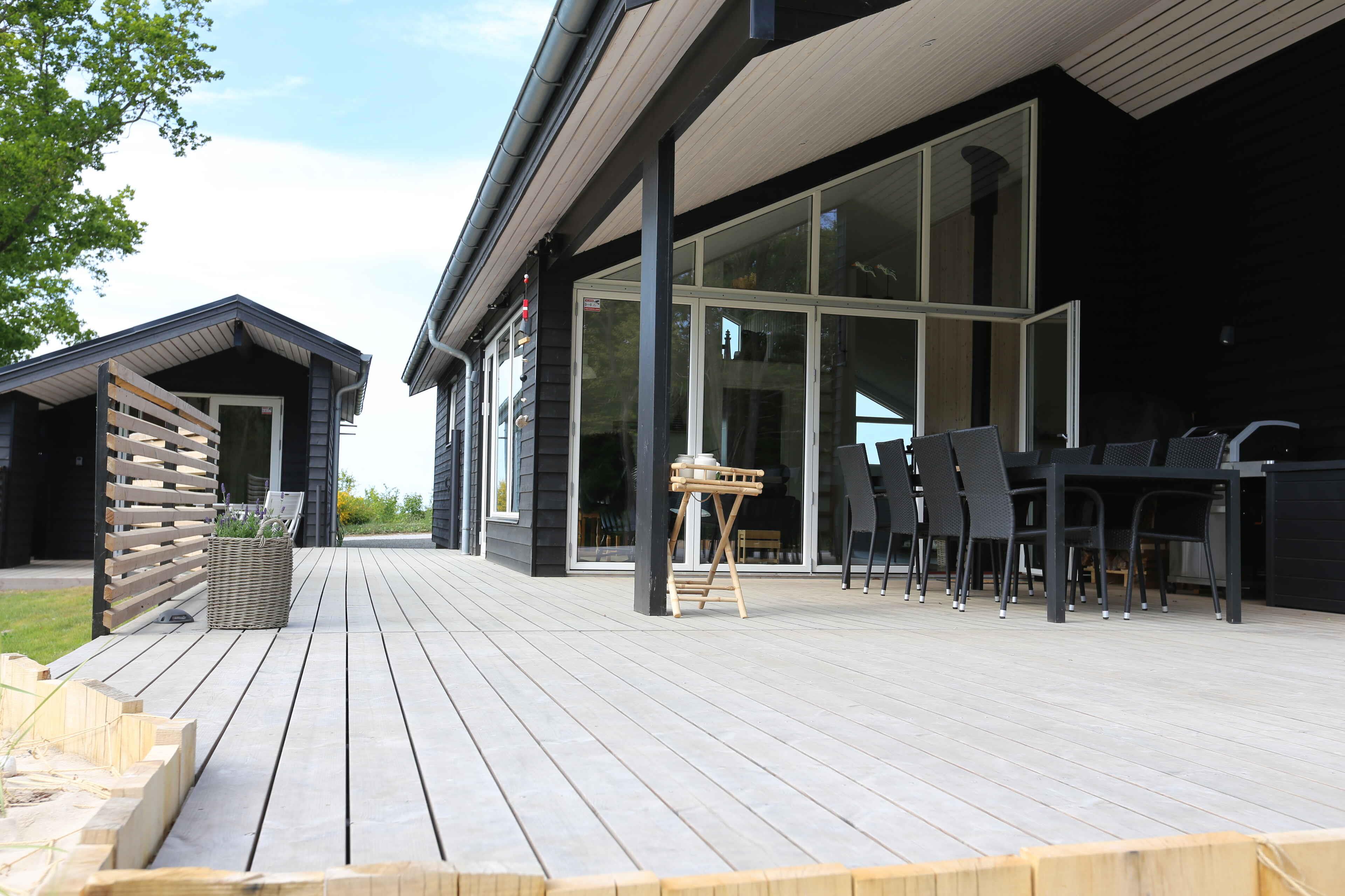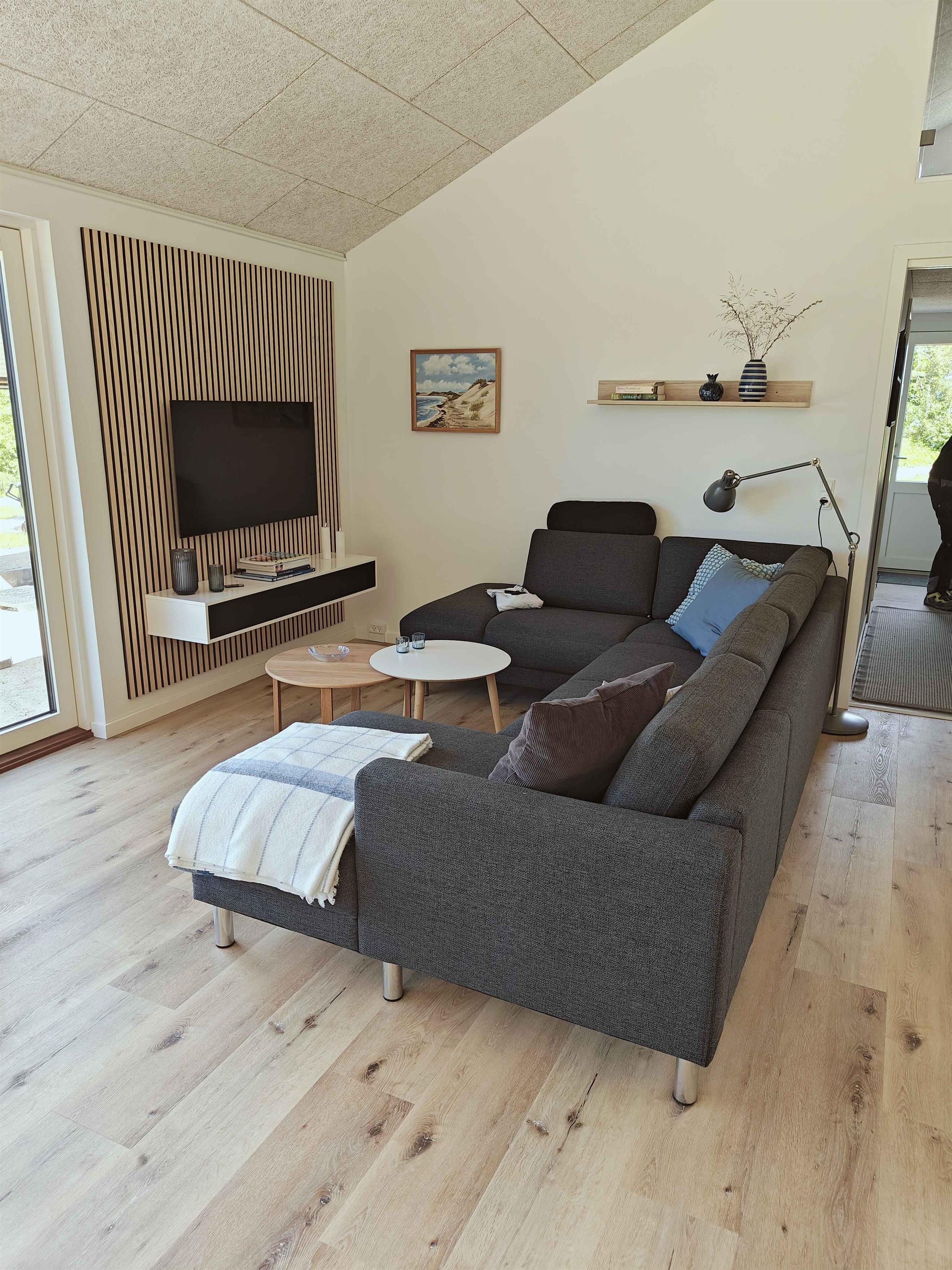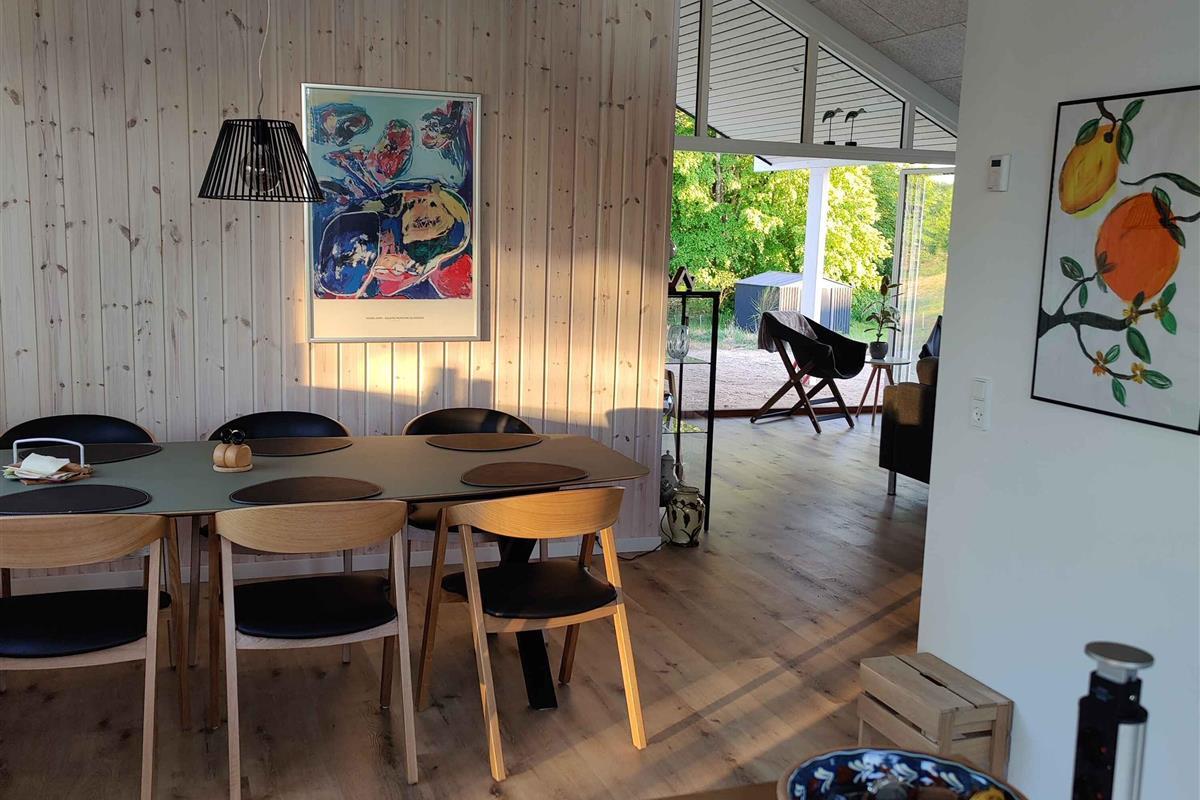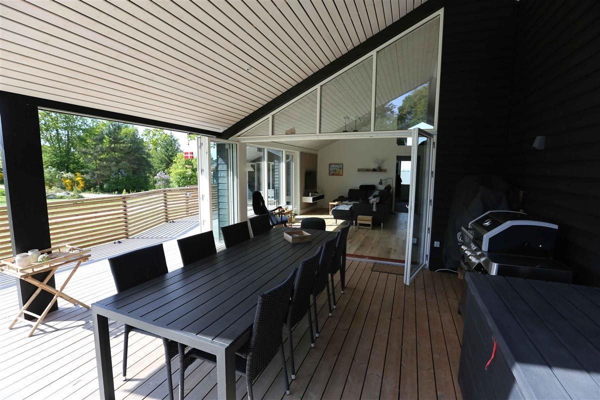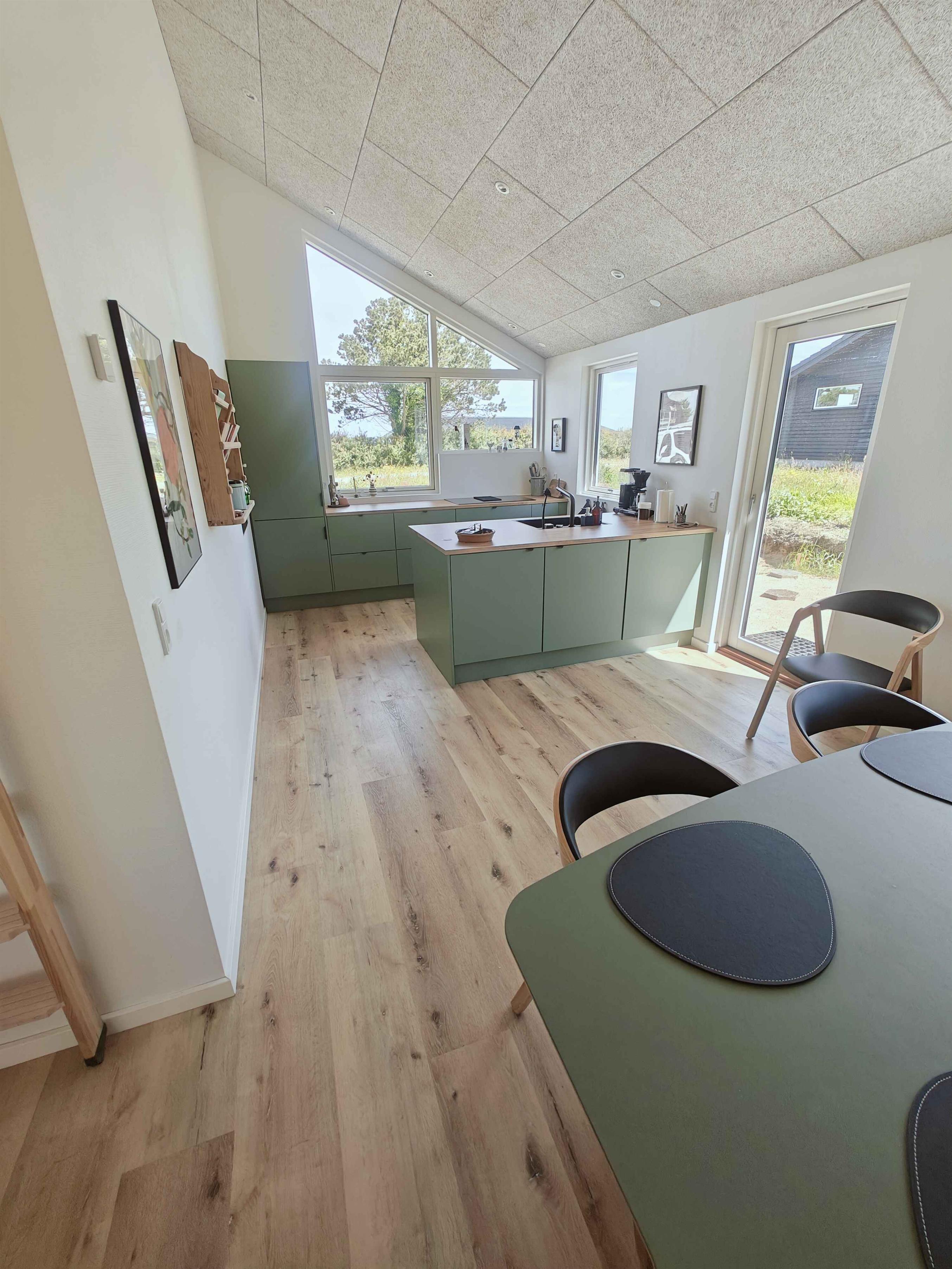 Welkom in een vakantiehuis dat zich onderscheidt door unieke, doordachte en elegante architectonische details. De eenvoudige, stijlvolle inrichting opent prachtig op met hoge plafonds en een formidabele lichtinval, die de uitzichtservaring vanuit de keuken-woonruimte naar het water toe compleet maakt. Hier kunnen jullie genieten van livet og tiden samen boven op de heuvel, slechts 250 meter van de zee. De grote, lichte leefruimte van het vakantiehuis met hoge plafonds biedt volop ruimte voor gezelligheid met spelletjes en gesprekken aan de eettafel, in het keukengedeelte dat superpraktisch is ingericht terwijl jullie genieten van het fantastische zeezicht door de grote raampartijen in de gevel. In de woonkamer is een ruime zithoek voor ontspanning, waar je je voeten kunt warmen bij de houtkachel of kunt genieten van het uitzicht naar het zuiden, waar een enorme raampartij het landschap buiten prachtig omlijst. Je kunt ook de brede vouwdeur openen zodat de natuur volledig de woonkamer wordt binnengehaald. Het vakantiehuis is stijlvol ingericht met oog voor kwaliteit en intelligente oplossingen, wat onder meer zichtbaar is in de twee goed ingerichte badkamers met hun mooie details. Moderne designmeubels geven een unieke charme en persoonlijkheid en creëren een heerlijke ontspannen sfeer. Wanneer de zon schijnt, kunnen jullie de deuren openen en naar buiten gaan om de dag door te brengen op meer dan 120 m² houten terras, en genieten van de zon of schaduw vinden onder de 25 m² overdekte veranda. Door de verspringende gevels is er altijd een plek te vinden met beschutting, schaduw of juist een zonnige plek. Wanneer de avond valt, kunnen jullie genieten van een glas wijn in de schemering en voelen hoe de rust zich nestelt terwijl de sterren verschijnen boven het water. De ligging van het huis in Skovgårde bij Fjellerup in Norddjurs is centraal en gunstig, dicht bij de culturele mogelijkheden van Mols en zijn gevarieerde landschappen, en slechts 20 minuten rijden van Djurs Sommerland. De zin in buitenleven kan gemakkelijk worden vervuld in de tuin, die op meerdere niveaus is aangelegd. De op het zuiden en westen gelegen grastuin ligt achter het huis, zodat je privé van de zon kunt genieten gedurende de hele dag, die kan worden afgesloten met het bereiden van het avondeten op de grote gasbarbecue. Op het hooggelegen plateau in de voortuin kun je vanaf het bankje genieten van de zonsondergang met uitzicht naar het noorden over zee en een koel drankje in de hand. Let op: Niet te huur voor commercieel gebruik.