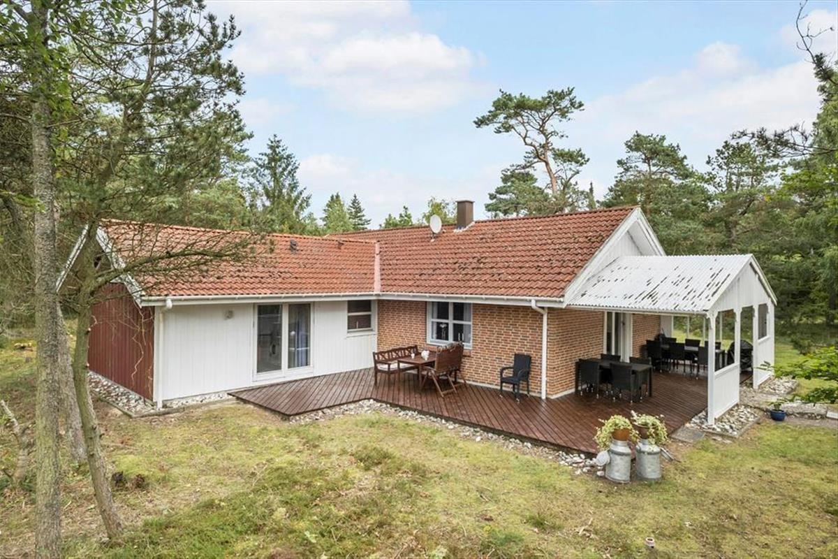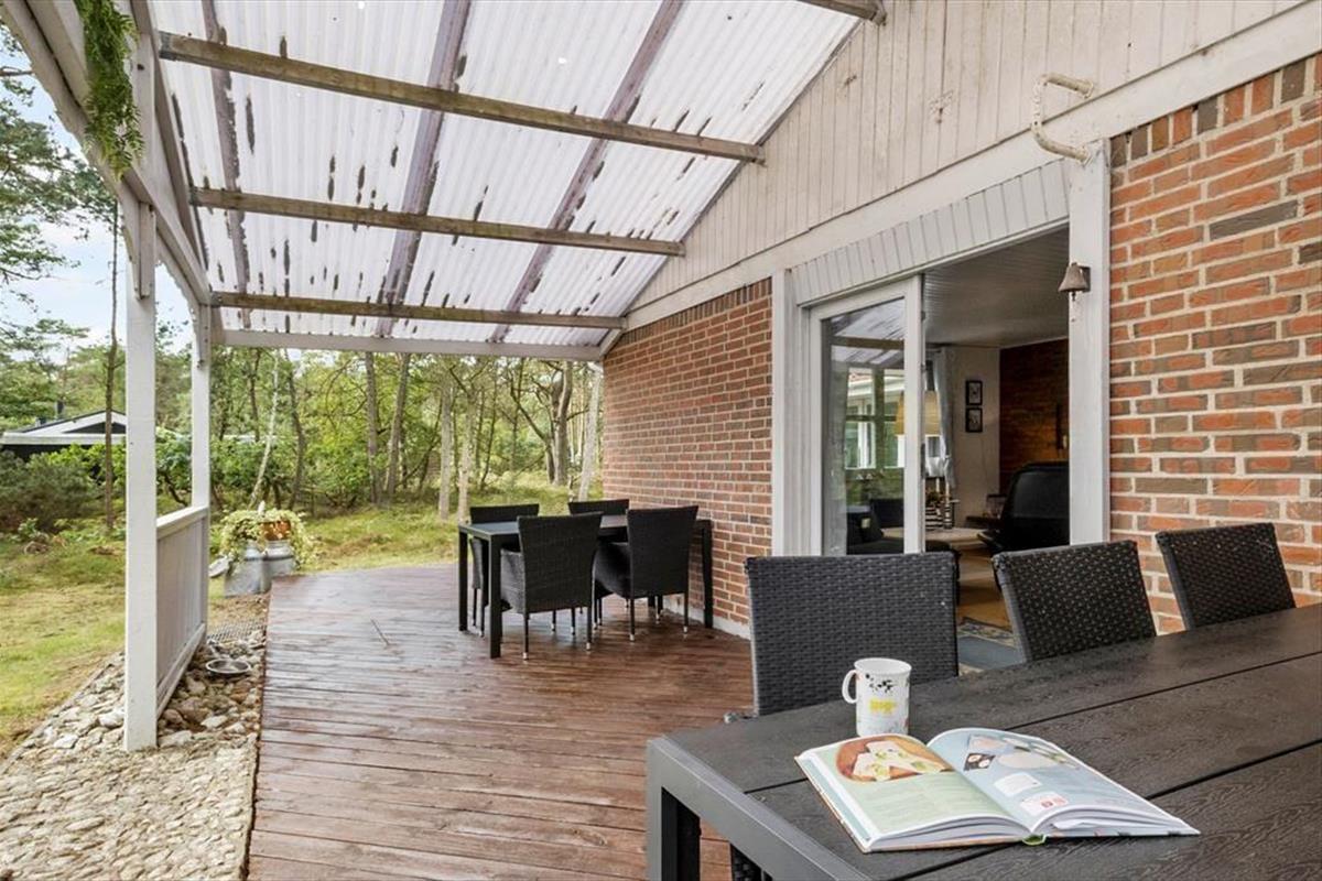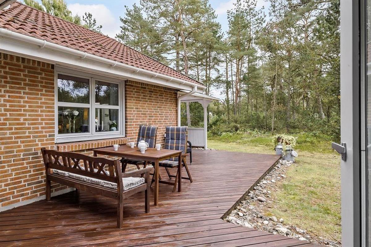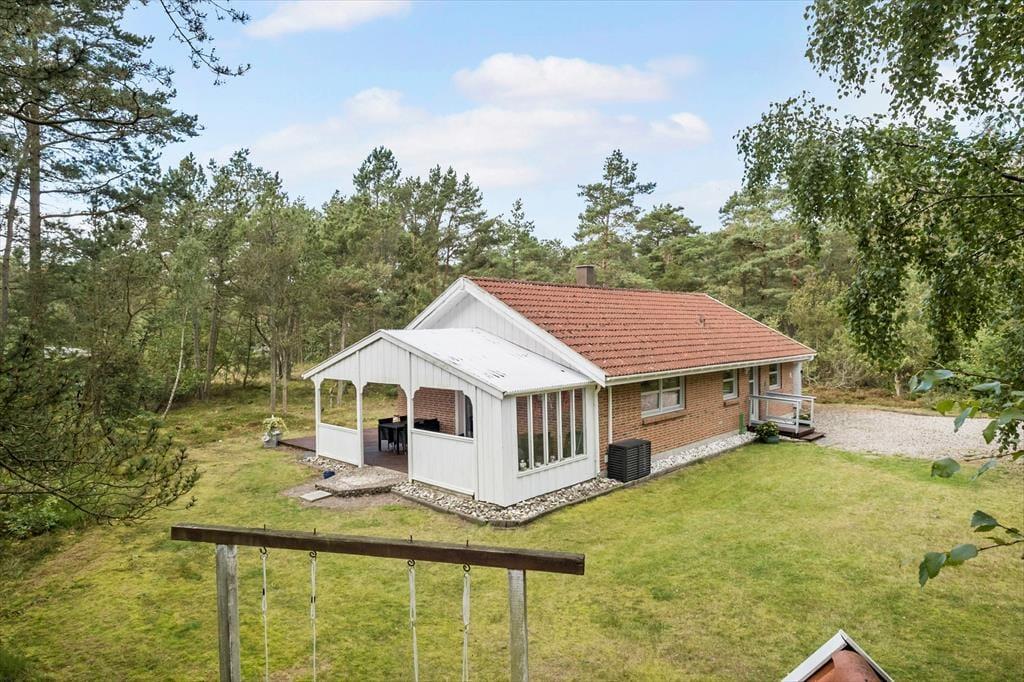 Auch unter freiem Himmel hat der Hauseigentümer einen gemütlichen und praktischen Rahmen für herrliche Urlaubstage geschaffen. Rund um das Haus erstrecken sich offene und überdachte Terrassenbereiche. Der Grill und der Außenkamin laden während der hellen, langen Sommerabende zu geselligen Runden ein. Während Sie sich im Tagesverlauf von der Sonne verwöhnen lassen oder den kühlen Schatten auf der Terrasse genießen, werden Ihre Kinder vergnügt schaukeln, im Spielhaus spielen oder ausgelassen auf der Grasfläche umhertollen. Das Naturgrundstück überzeugt mit einem üppigen Randbewuchs, wodurch Sie sich völlig frei und ungestört entfalten können.