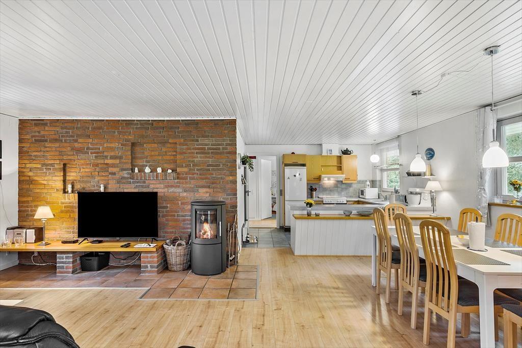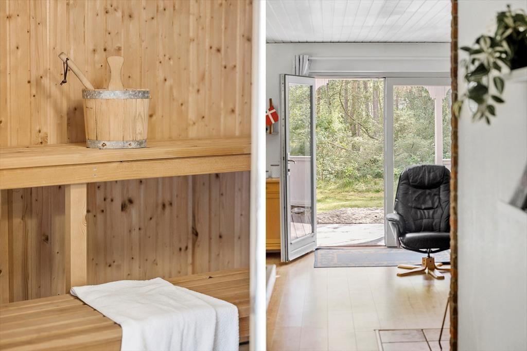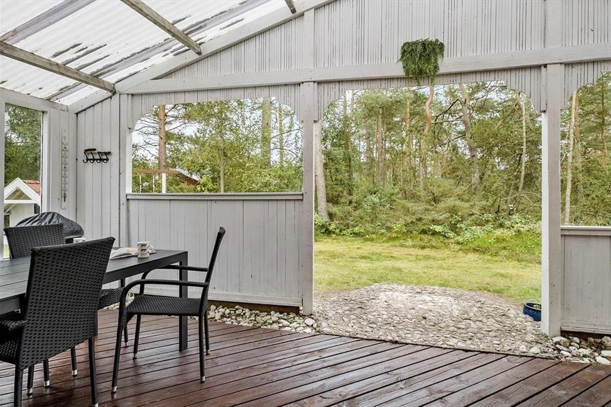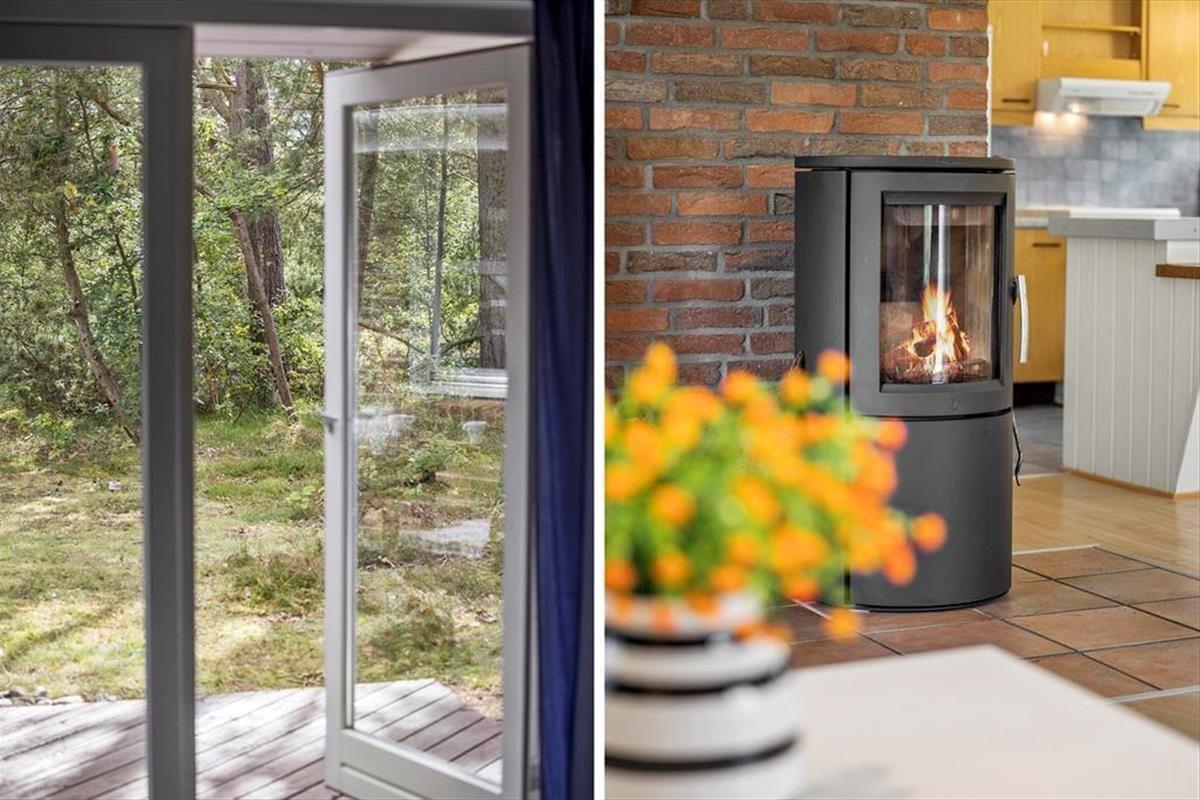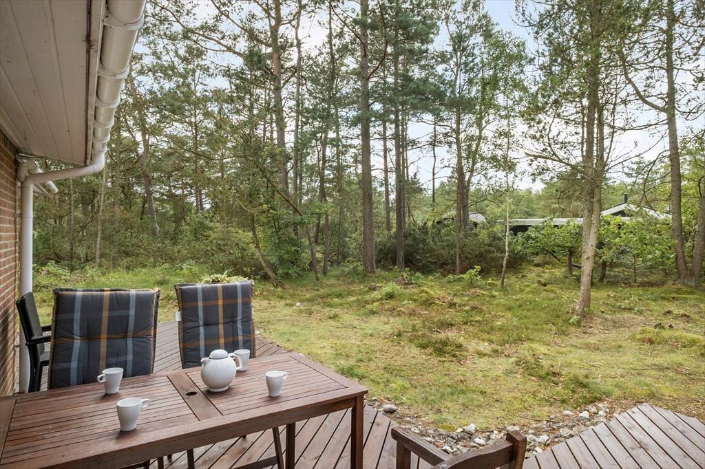 Auch unter freiem Himmel hat der Hauseigentümer einen gemütlichen und praktischen Rahmen für herrliche Urlaubstage geschaffen. Rund um das Haus erstrecken sich offene und überdachte Terrassenbereiche. Der Grill und der Außenkamin laden während der hellen, langen Sommerabende zu geselligen Runden ein. Während Sie sich im Tagesverlauf von der Sonne verwöhnen lassen oder den kühlen Schatten auf der Terrasse genießen, werden Ihre Kinder vergnügt schaukeln, im Spielhaus spielen oder ausgelassen auf der Grasfläche umhertollen. Das Naturgrundstück überzeugt mit einem üppigen Randbewuchs, wodurch Sie sich völlig frei und ungestört entfalten können.