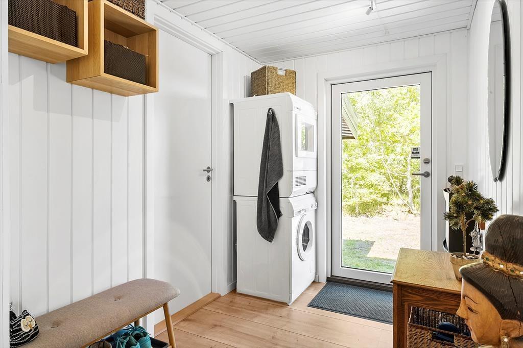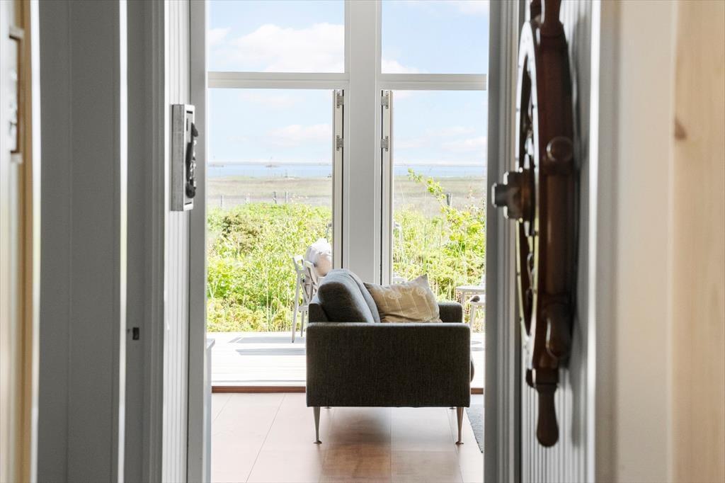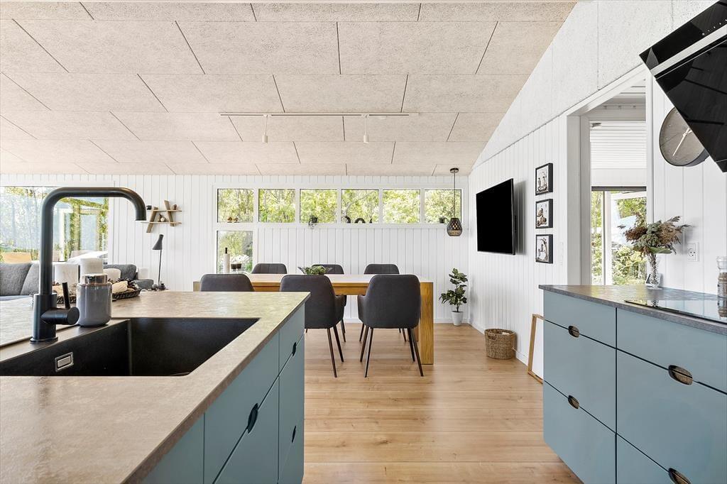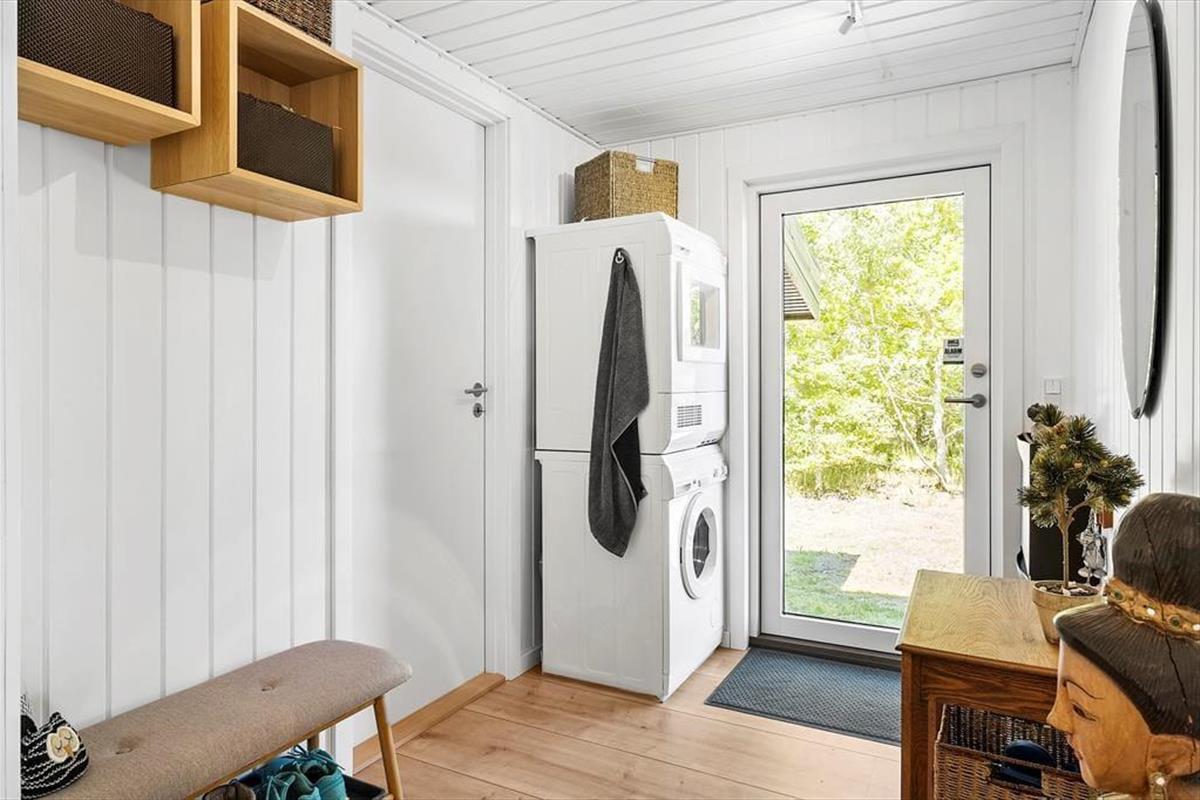 Das Ferienhaus wurde im Jahr 1974 errichtet aber wurde im 2023 vollständig renoviert, und verfügt über einen authentischen Charme mit holzverkleideten Fassaden und der besonders idyllischen Lage am Waldrand. Hier haben Sie Wald zur einen und eine schöne Aussicht über das Wasser zur anderen Seite. Die attraktive Umgebung können Sie vom gemütlichen Wohnzimmer aus genießen, welches in offener Verbindung zur Küche steht. Es erwartet Sie ein ansehnlicher Essbereich in der Nähe der Küche, darüber hinaus verfügen Sie über ein Sofa und Leseecken - dank der großen Fenster ist der Wohnbereich mit ausreichend Tageslicht und mit einer attraktiven Aussicht auf die Umgebung versorgt. Vom Wohnzimmer aus haben Sie Zugang zur Terrasse, die an wärmeren und sonnigen Tagen den Wohnbereich erweitert. Es gibt zwei Schlafzimmer - beide mit einem Doppelbett. Ein Badezimmer gibt es natürlich auch.