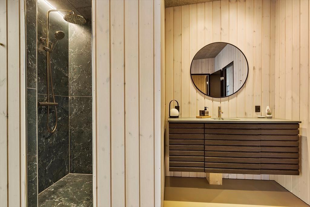 Das Cottage ist mit Stil und Sorgfalt eingerichtet und sobald Sie es betreten, spüren Sie die einladende Atmosphäre. Helle Farben, hochwertige Materialien und moderne Möbel schaffen eine ruhige und harmonische Atmosphäre, in der Sie sich sofort wohlfühlen. Das große Wohnzimmer dient als natürlicher Treffpunkt des Hauses und verfügt über eine offene Küche und einen gemütlichen Essbereich, wo Sie Ihre Mahlzeiten mit Blick auf die umliegende Natur genießen können. In der Sitzecke können Sie mit einem guten Buch in einem weichen Sessel versinken oder bei einer Tasse Kaffee den Blick über die Landschaft genießen. Ein cleveres Detail des Hauses ist der separate Schlafbereich, der gemeinsam reisenden Familien oder Paaren zusätzliche Privatsphäre bietet. Hier finden Sie geräumige Schlafzimmer und ein Badezimmer, sodass sich jeder nach einem Tag voller Abenteuer in seine eigene ruhige Ecke zurückziehen kann.