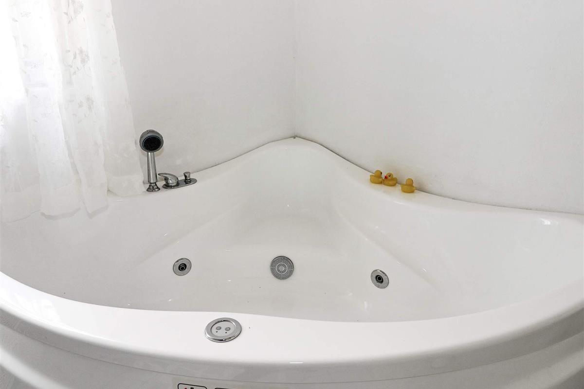 Im Inneren befindet sich ein großes Schlafzimmer mit einem Doppelbett und Zugang zu einem kleineren Zimmer mit einem Einzelbett und direktem Zugang zum Garten – ideal für Kinder oder Gäste. Darüber hinaus gibt es ein weiteres Zimmer mit zwei Einzelbetten und ein helles Badezimmer mit Whirlpool und Dusche, das nach einem Tag in der Natur oder am Strand für zusätzlichen Komfort sorgt.