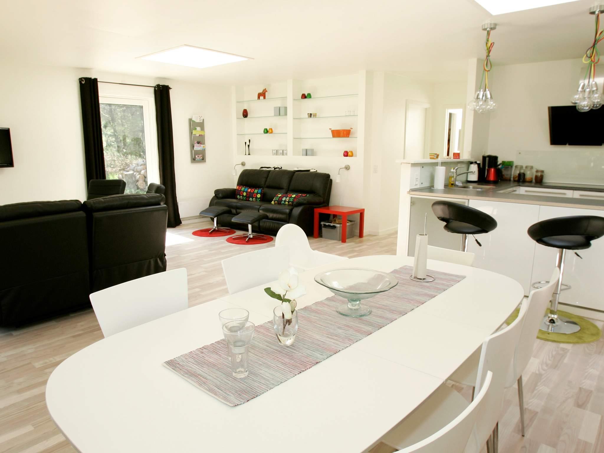 Das Haus ist hell und einladend gestaltet und verfügt über einen gut gestalteten offenen Küchen- und Wohnbereich, der das Herzstück des Hauses bildet. Der Wohnbereich verfügt über einen gemütlichen Holzofen, der eine warme und einladende Atmosphäre für Familientreffen oder ruhige Abende schafft. Für zusätzliche Entspannung sorgt die private Infrarotsauna, die nach einem Tag voller Erkundungen in der Umgebung einen wohltuenden Rückzugsort bietet.