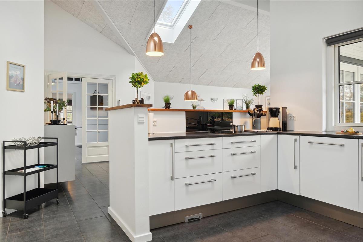 Dit ruime vakantiehuis aan het strand van Helbserskov is ideaal voor een grote groep vrienden of meerdere gezinnen. Het samenspel van lichte en donkere kleuren zorgt voor een elegante sfeer waarin spelen, plezier en ontspanning niet worden verwaarloosd. Laat de hobbykoks aan de slag gaan in de prachtige keuken terwijl de kinderen tafeltennissen of een stel zichzelf trakteert op een rustig bad in het bubbelbad.