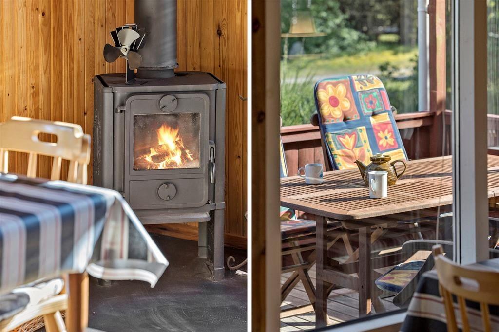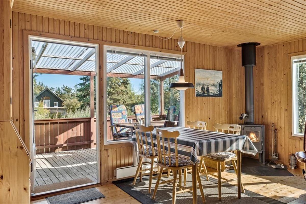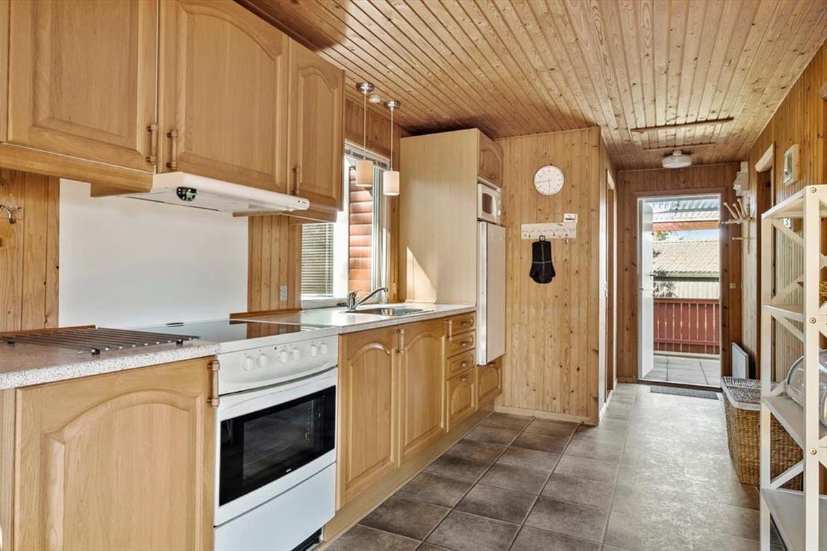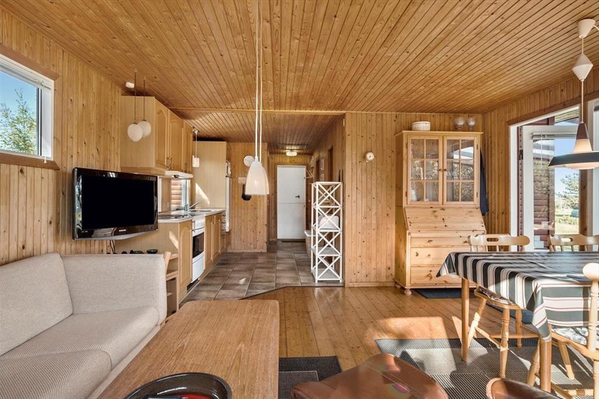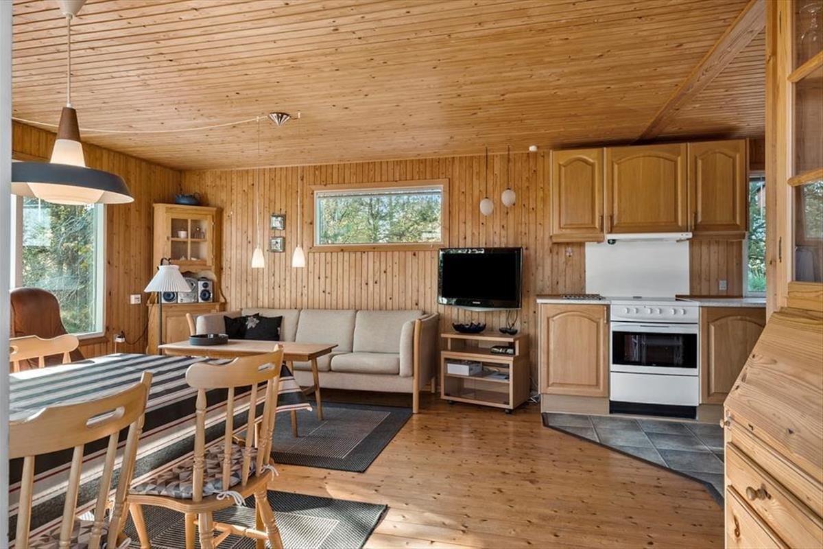 Das Haus strahlt sowohl innen als auch außen klassischen Sommerhaus-Charme aus. Sie können sich darauf freuen, Ihre Ferientage in einem einfachen und unprätentiösen Ferienhaus zu verbringen, in dem es leicht und unkompliziert ist, das gemütliche Beisammensein mit der Familie in den Fokus zu rücken. Wohnbereich und Küche sind in einem zusammenhängenden Wohnraum integriert, in dem der Kaminofen an dunklen Abenden für zusätzliche Gemütlichkeit sorgt. Tagsüber gibt es ein herrliches natürliches Licht aus drei Himmelsrichtungen, und die Fensterpartien holen die grüne Umgebung direkt ins Haus. Vom Wohnraum aus gibt es außerdem Zugang zur Terrasse und zum Garten. Das Haus verfügt zudem über zwei Schlafzimmer und ein Badezimmer – perfekt für die Familie mit zwei Kindern.