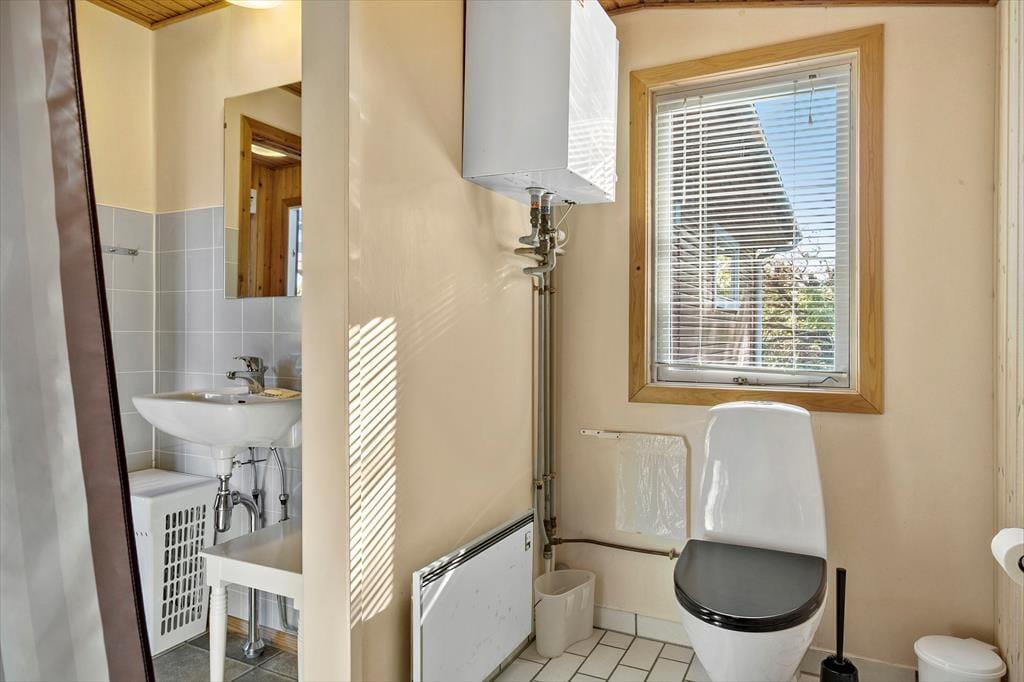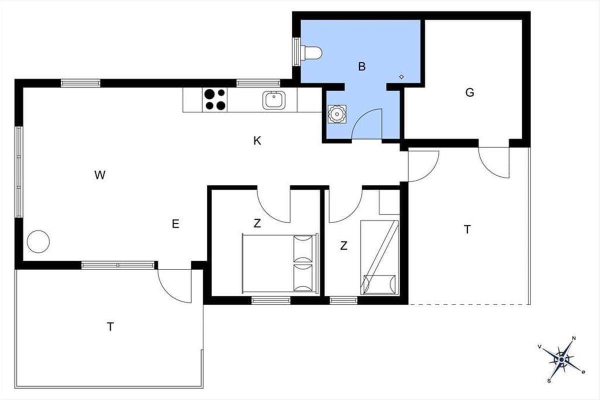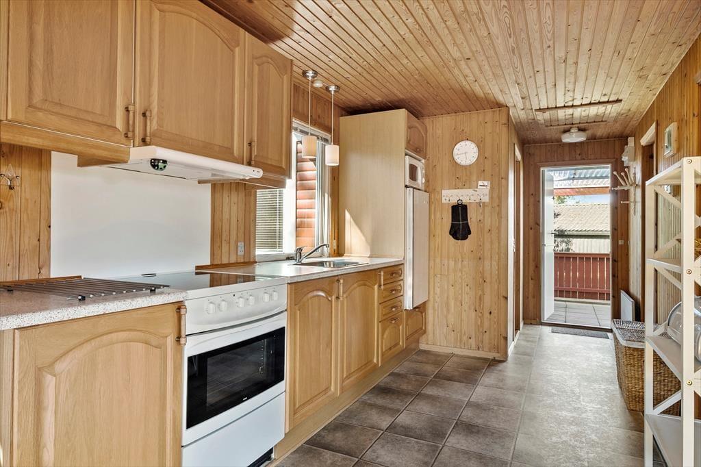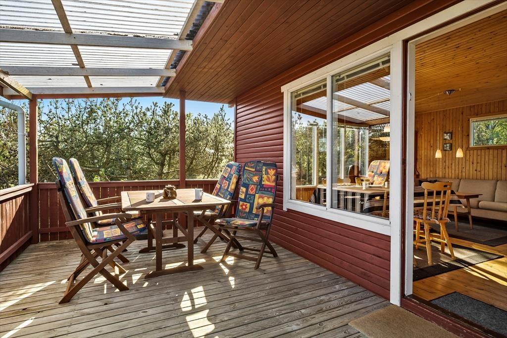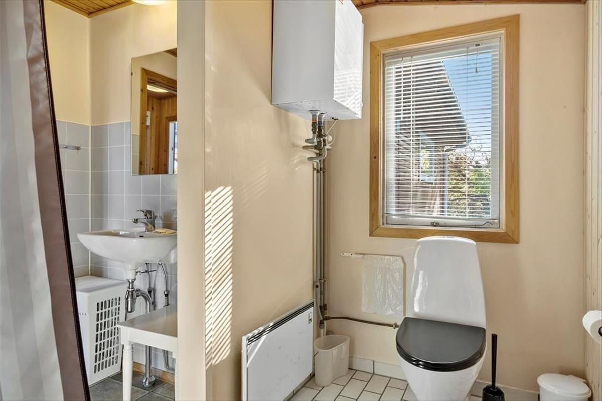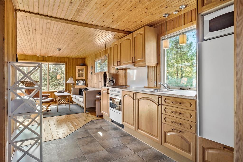 Das Haus strahlt sowohl innen als auch außen klassischen Sommerhaus-Charme aus. Sie können sich darauf freuen, Ihre Ferientage in einem einfachen und unprätentiösen Ferienhaus zu verbringen, in dem es leicht und unkompliziert ist, das gemütliche Beisammensein mit der Familie in den Fokus zu rücken. Wohnbereich und Küche sind in einem zusammenhängenden Wohnraum integriert, in dem der Kaminofen an dunklen Abenden für zusätzliche Gemütlichkeit sorgt. Tagsüber gibt es ein herrliches natürliches Licht aus drei Himmelsrichtungen, und die Fensterpartien holen die grüne Umgebung direkt ins Haus. Vom Wohnraum aus gibt es außerdem Zugang zur Terrasse und zum Garten. Das Haus verfügt zudem über zwei Schlafzimmer und ein Badezimmer – perfekt für die Familie mit zwei Kindern.