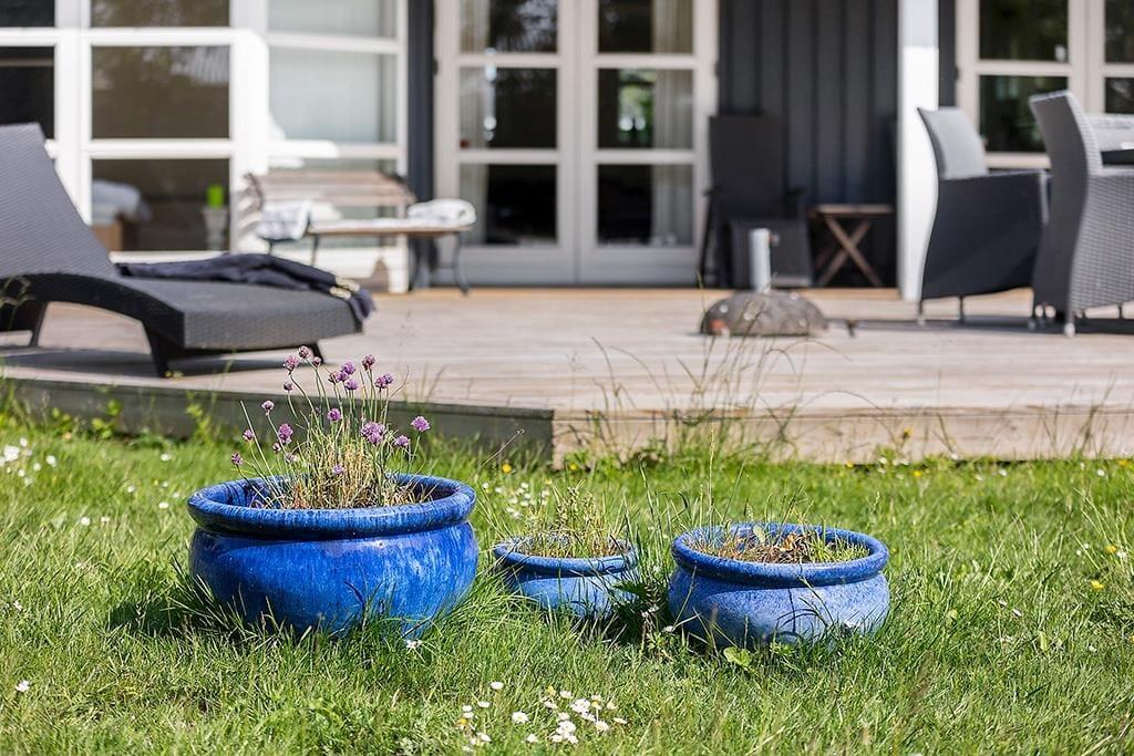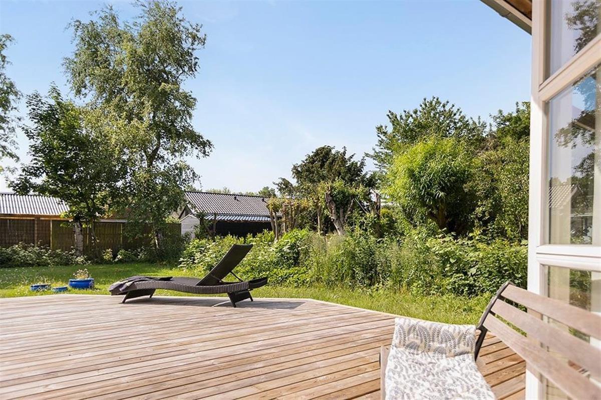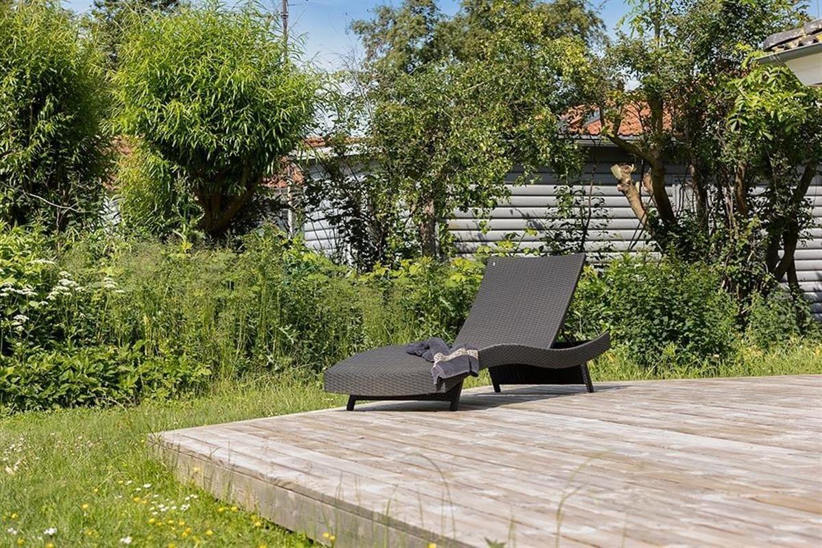Draußen erwartet dich ein schöner Garten mit einer großen Holzterrasse, auf der du den ganzen Tag die Sonne genießen kannst. Die Terrasse ist teilweise überdacht, was es ermöglicht, auch bei wechselhaftem Wetter draußen zu sitzen. Der grüne Rasen ist ideal zum Spielen und Entspannen, und die ruhige Lage sorgt für eine friedliche Atmosphäre. Am Abend kannst du den Grill anzünden und eine Mahlzeit unter freiem Himmel genießen, während du dem Gesang der Vögel lauschst und die frische Luft spürst.