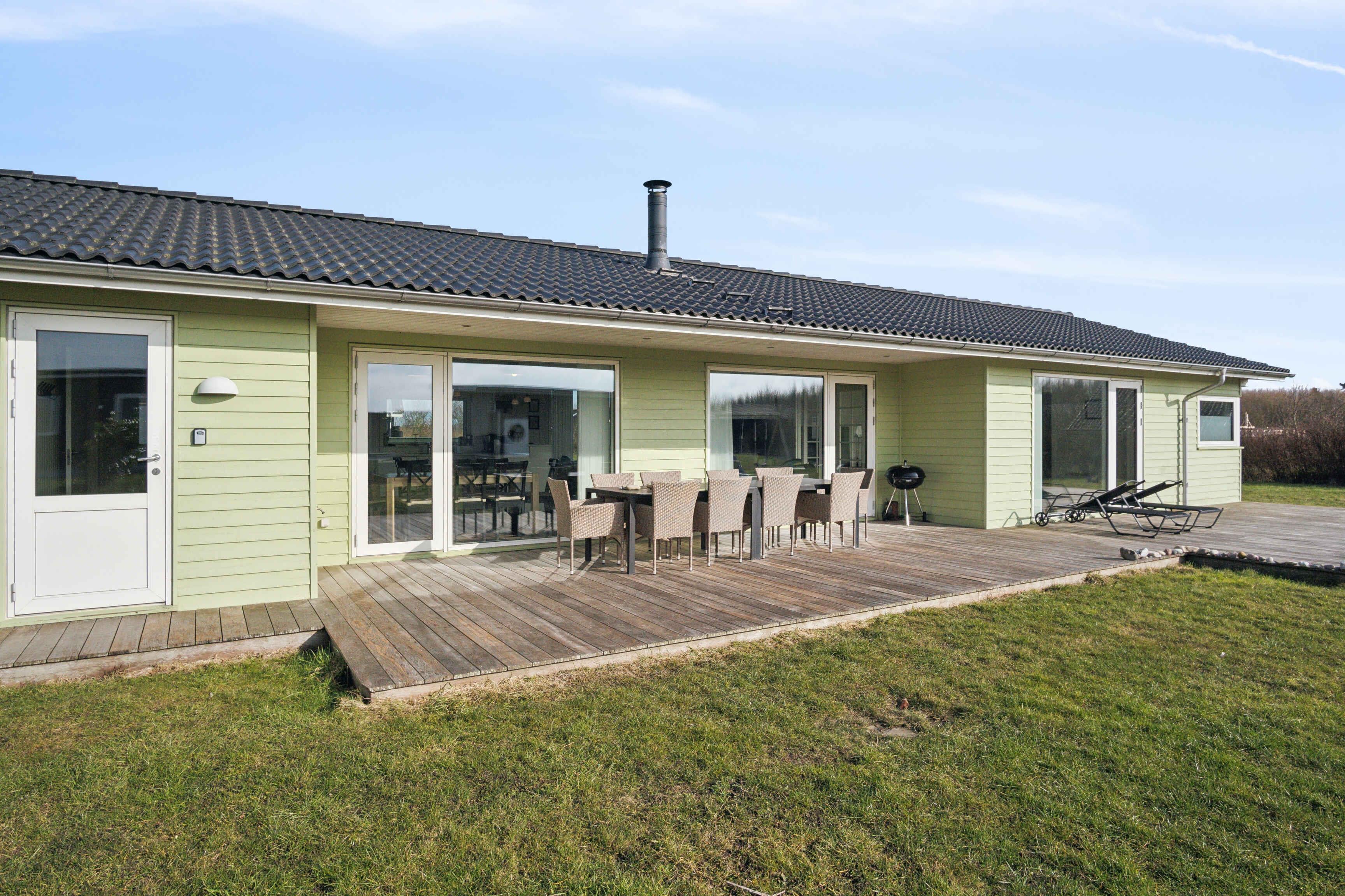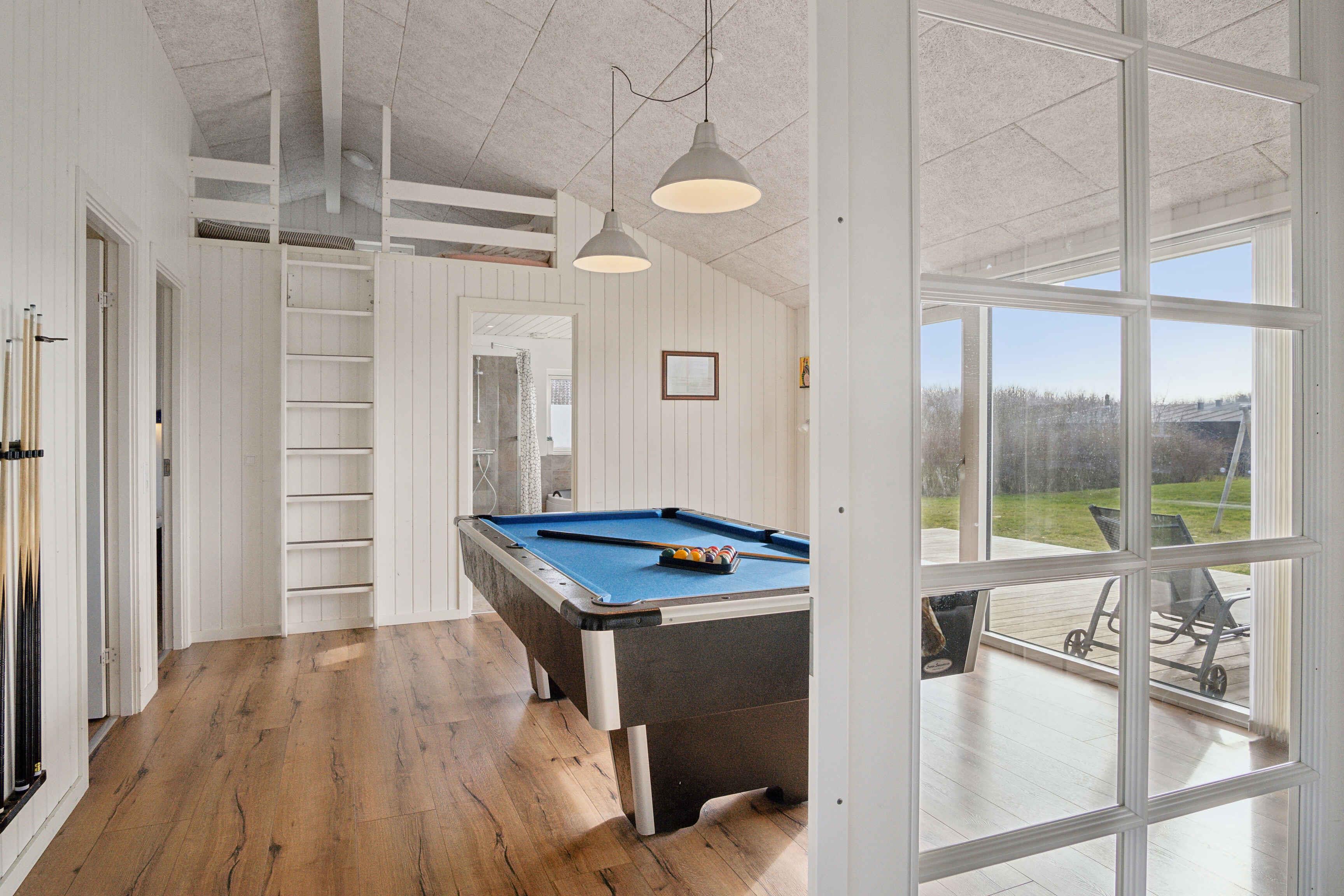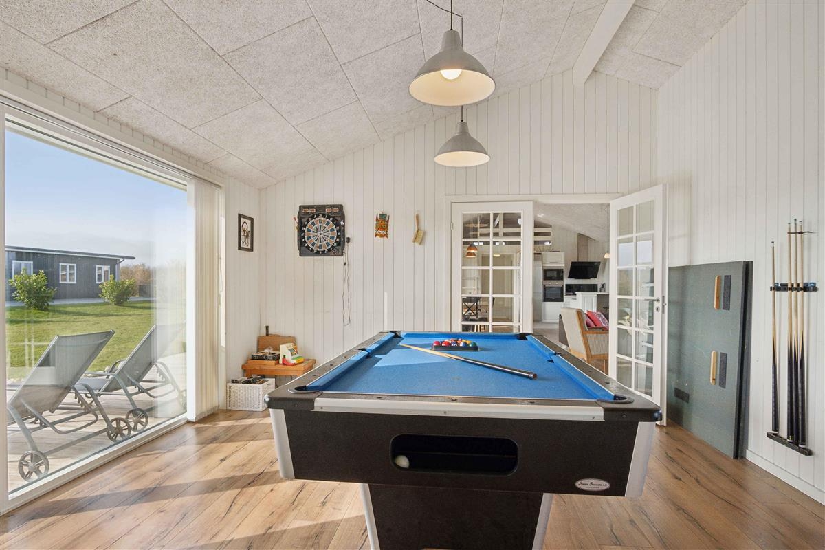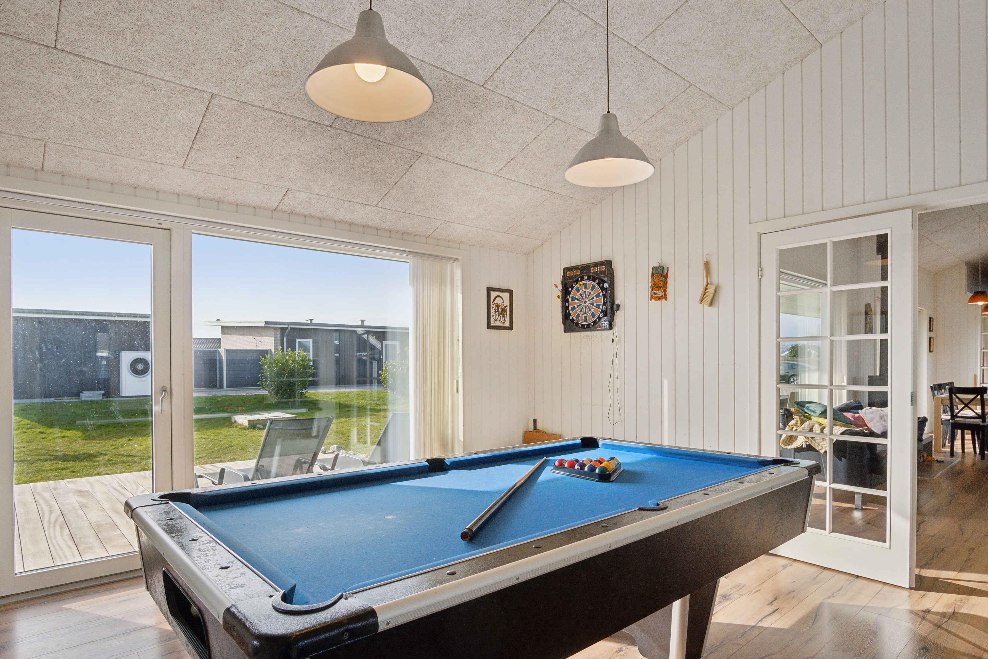 Deze ruime vakantiewoning van 141 m² biedt plaats aan maximaal 12 personen. Er zijn vier slaapkamers, twee slaapzolders en twee badkamers, waardoor het ideaal is voor grote gezinnen of meerdere vriendengroepen. De woning is goed ingedeeld met twee aparte slaapgedeeltes, elk met een eigen badkamer. De slaapzolders met matrassen bieden extra slaapplaatsen en zijn vooral geschikt voor kinderen die van een knusse ruimte houden. De grote woonkamer heeft een houtkachel, die op koele dagen voor een gezellige sfeer zorgt. Een lucht/lucht-warmtepomp garandeert het hele jaar door een aangenaam binnenklimaat. Internet biedt gemakkelijke toegang tot streaming en werk. De grote activiteitenruimte biedt vermaak voor alle leeftijden. Hier kun je tafelvoetballen, tafeltennissen of darten. De ruimte is perfect voor gezellige avonden met spel en competitie. Het huis ligt op 1500 meter van een kindvriendelijk zandstrand. Het ondiepe water en de goede zwemomstandigheden maken het ideaal voor gezinnen met jonge kinderen. De omgeving biedt uitstekende vismogelijkheden. Vanaf de kust kun je platvis, kabeljauw en zeeforel vangen, terwijl sportvissers ook nabijgelegen meren en havens kunnen verkennen. Natuurpaden en fietsroutes maken dit gebied perfect voor buitenactiviteiten. De omliggende bossen en open landschappen nodigen uit tot lange wandelingen, terwijl de kust prachtige uitzichten over de zee biedt. Hier geniet je van een vakantie in een rustige omgeving met volop ruimte, activiteiten en mooie ervaringen dicht bij de natuur. Een huis waar zowel volwassenen als kinderen kunnen ontspannen en spelen.