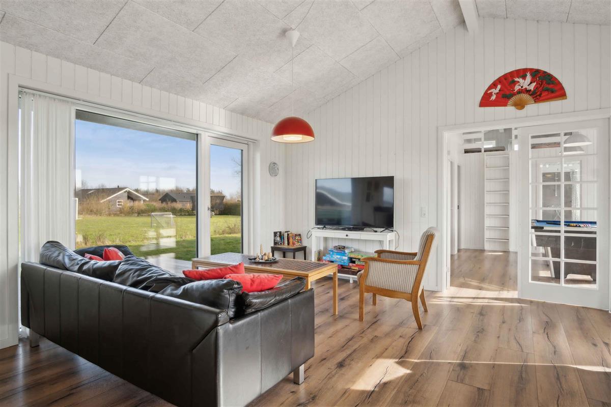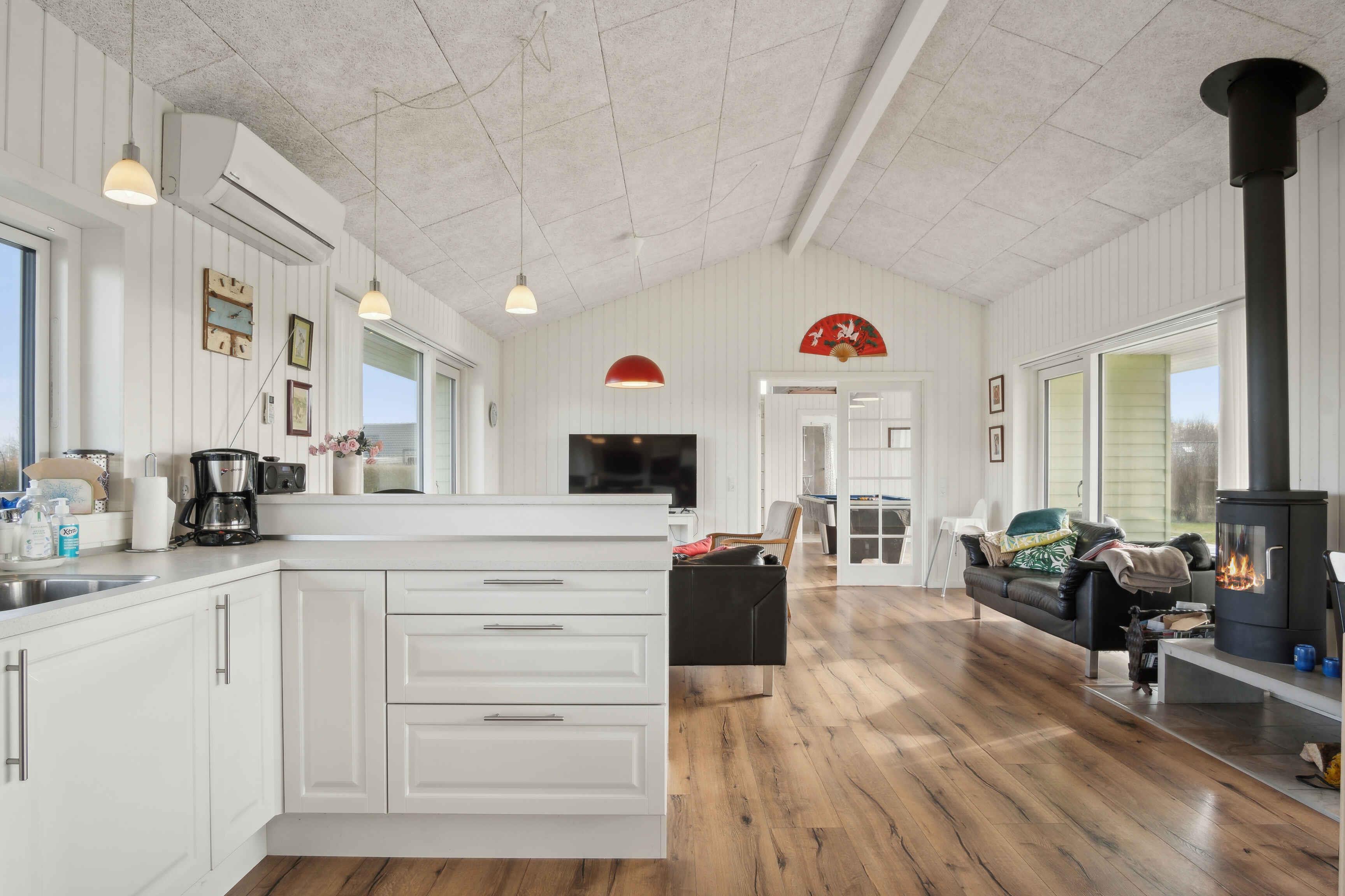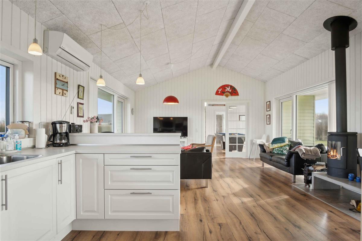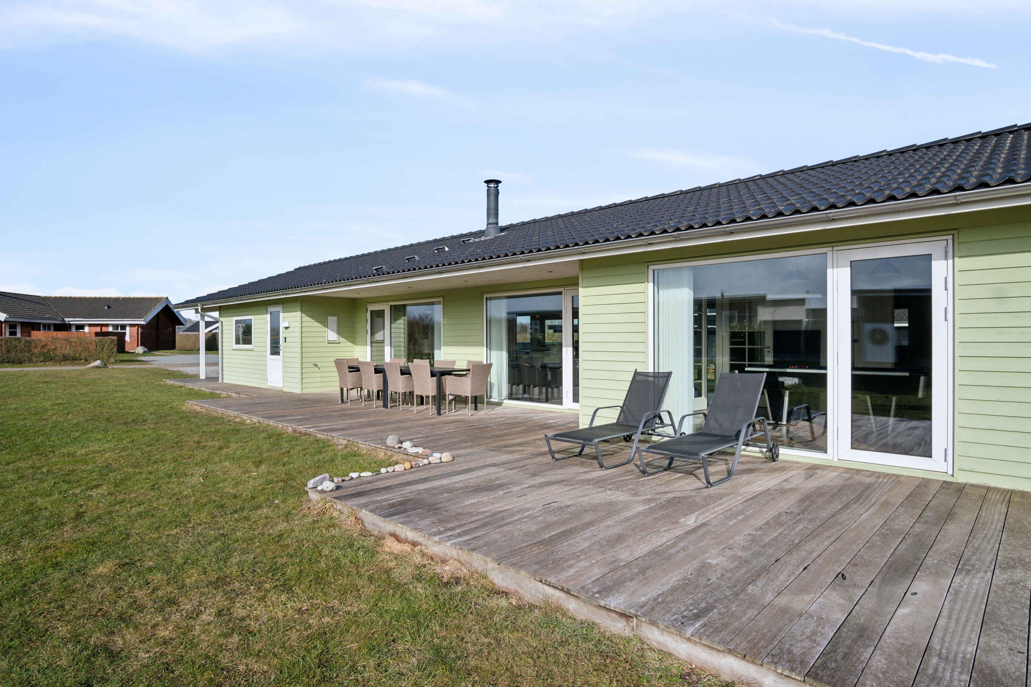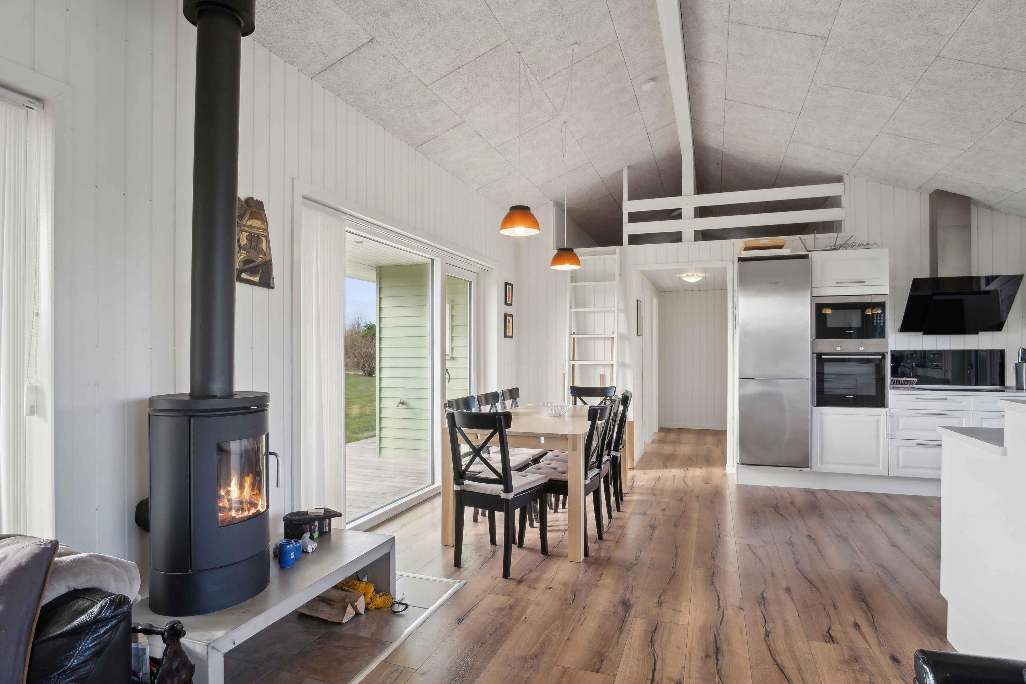 Deze ruime vakantiewoning van 141 m² biedt plaats aan maximaal 12 personen. Er zijn vier slaapkamers, twee slaapzolders en twee badkamers, waardoor het ideaal is voor grote gezinnen of meerdere vriendengroepen. De woning is goed ingedeeld met twee aparte slaapgedeeltes, elk met een eigen badkamer. De slaapzolders met matrassen bieden extra slaapplaatsen en zijn vooral geschikt voor kinderen die van een knusse ruimte houden. De grote woonkamer heeft een houtkachel, die op koele dagen voor een gezellige sfeer zorgt. Een lucht/lucht-warmtepomp garandeert het hele jaar door een aangenaam binnenklimaat. Internet biedt gemakkelijke toegang tot streaming en werk. De grote activiteitenruimte biedt vermaak voor alle leeftijden. Hier kun je tafelvoetballen, tafeltennissen of darten. De ruimte is perfect voor gezellige avonden met spel en competitie. Het huis ligt op 1500 meter van een kindvriendelijk zandstrand. Het ondiepe water en de goede zwemomstandigheden maken het ideaal voor gezinnen met jonge kinderen. De omgeving biedt uitstekende vismogelijkheden. Vanaf de kust kun je platvis, kabeljauw en zeeforel vangen, terwijl sportvissers ook nabijgelegen meren en havens kunnen verkennen. Natuurpaden en fietsroutes maken dit gebied perfect voor buitenactiviteiten. De omliggende bossen en open landschappen nodigen uit tot lange wandelingen, terwijl de kust prachtige uitzichten over de zee biedt. Hier geniet je van een vakantie in een rustige omgeving met volop ruimte, activiteiten en mooie ervaringen dicht bij de natuur. Een huis waar zowel volwassenen als kinderen kunnen ontspannen en spelen.