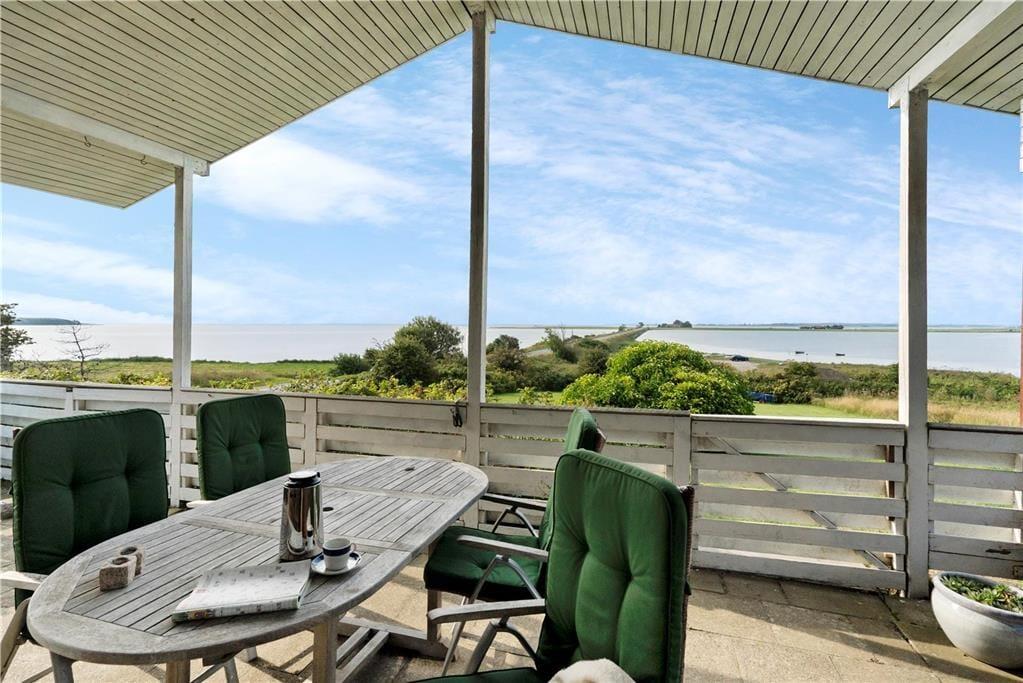 Von der großen überdachten Terrasse genießen Sie die tolle Aussicht auf den Damm zur Insel Alrø und auf den Horsens Fjord. Darüber hinaus gibt es eine offene Terrasse nach Süd-West und eine dritte schöne Terrasse direkt vor den Schlafzimmern des Nebengebäudes.