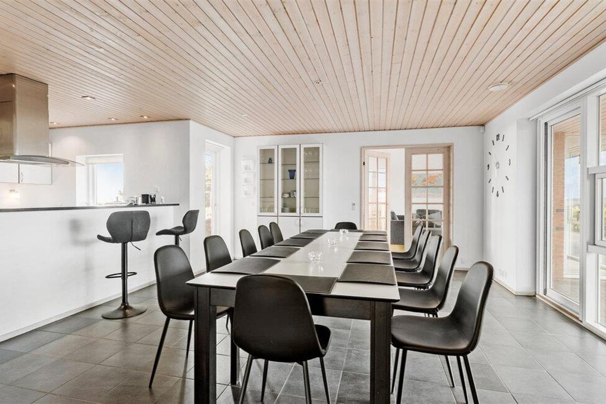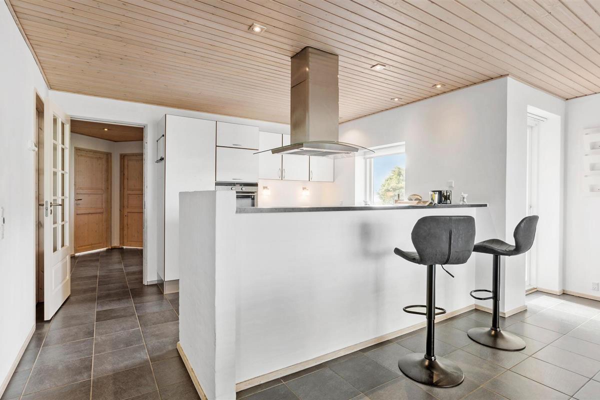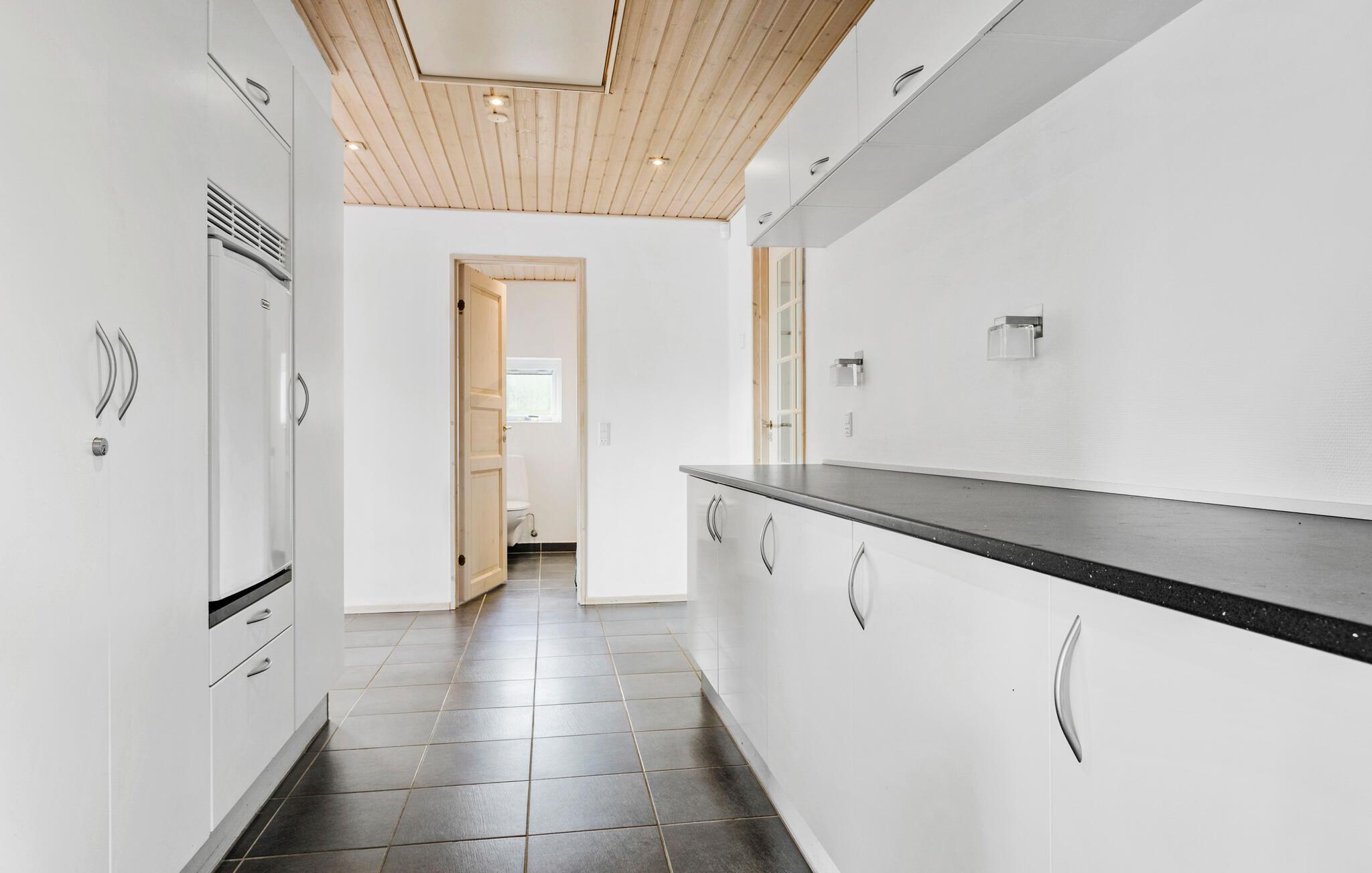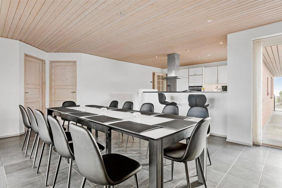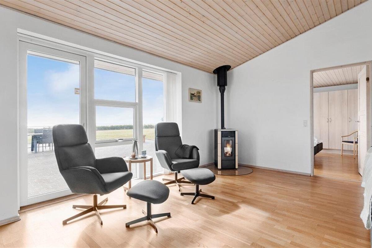 Een verblijf in je vakantiehuis in de buurt van het prachtige Limfjord belooft jou en je familie een gezellige en ontspannen sfeer. De ruime eethoek met de lange eettafel biedt de ideale ruimte voor gezamenlijke maaltijden, bordspellen en ontspannende uren na een bewogen dag. De open, praktisch ingerichte keuken nodigt u uit om samen heerlijke maaltijden te bereiden. Op koelere dagen kun je genieten van de gezellige warmte van de houtkachel.