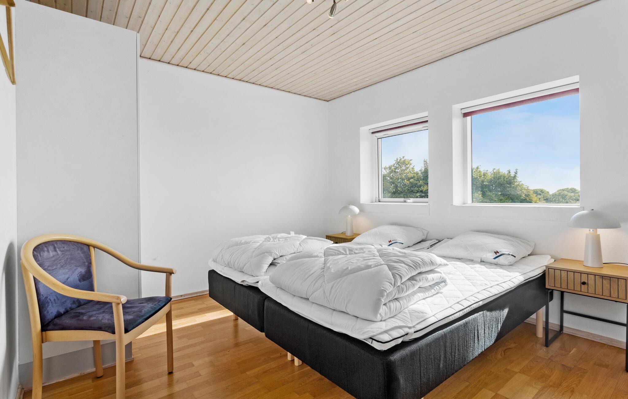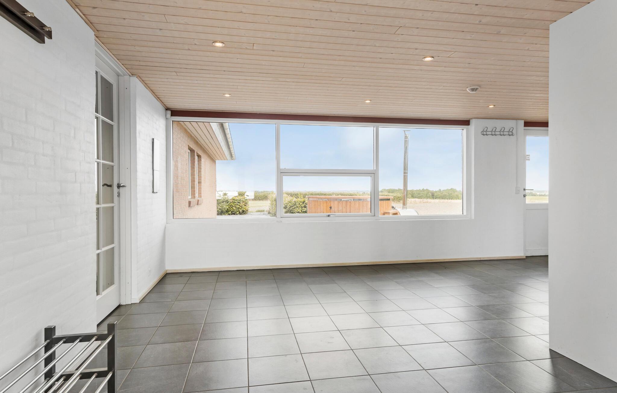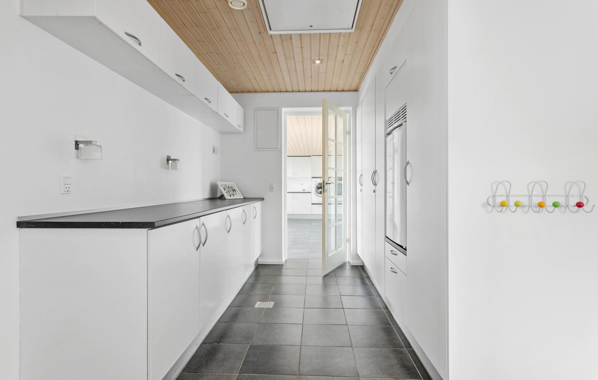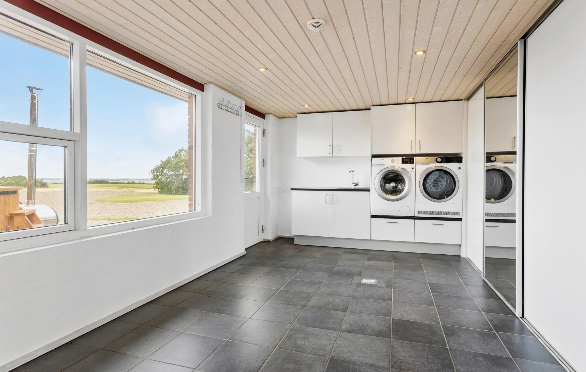 Een verblijf in je vakantiehuis in de buurt van het prachtige Limfjord belooft jou en je familie een gezellige en ontspannen sfeer. De ruime eethoek met de lange eettafel biedt de ideale ruimte voor gezamenlijke maaltijden, bordspellen en ontspannende uren na een bewogen dag. De open, praktisch ingerichte keuken nodigt u uit om samen heerlijke maaltijden te bereiden. Op koelere dagen kun je genieten van de gezellige warmte van de houtkachel.