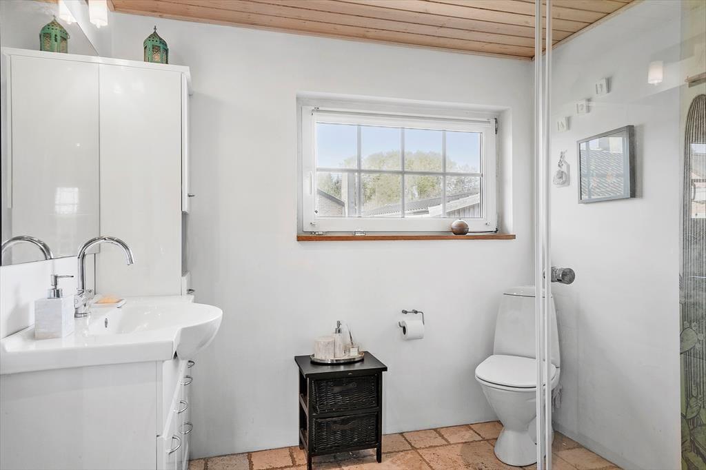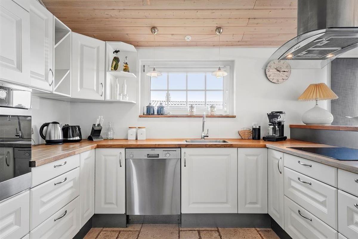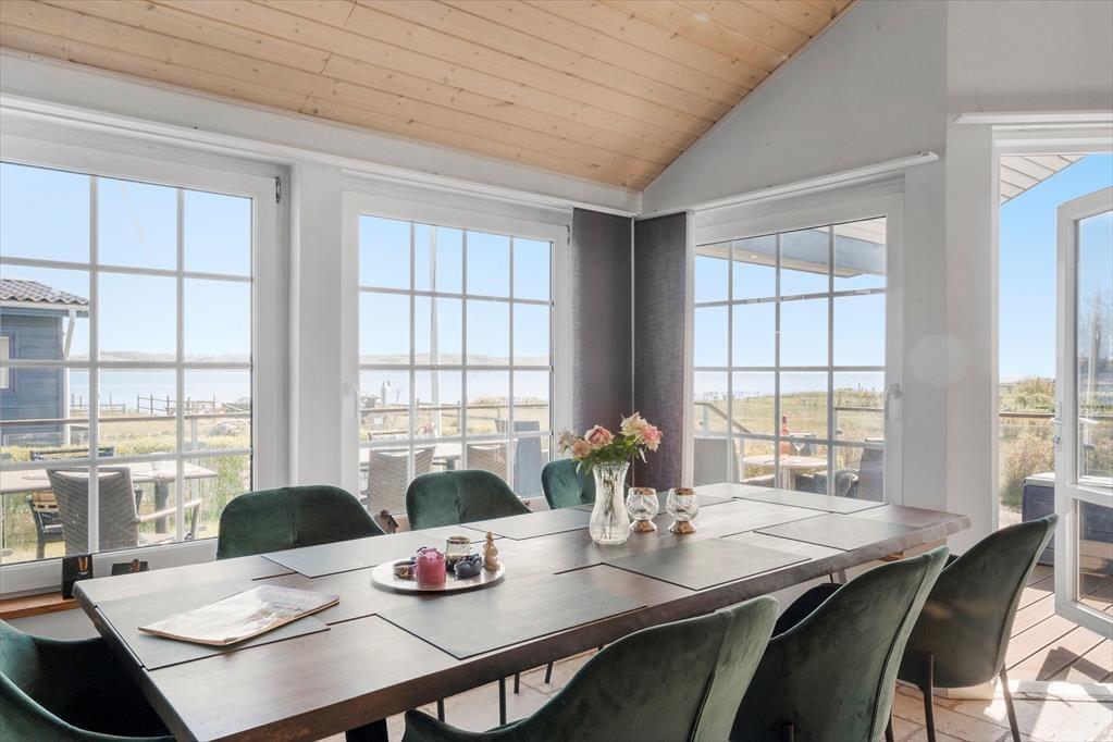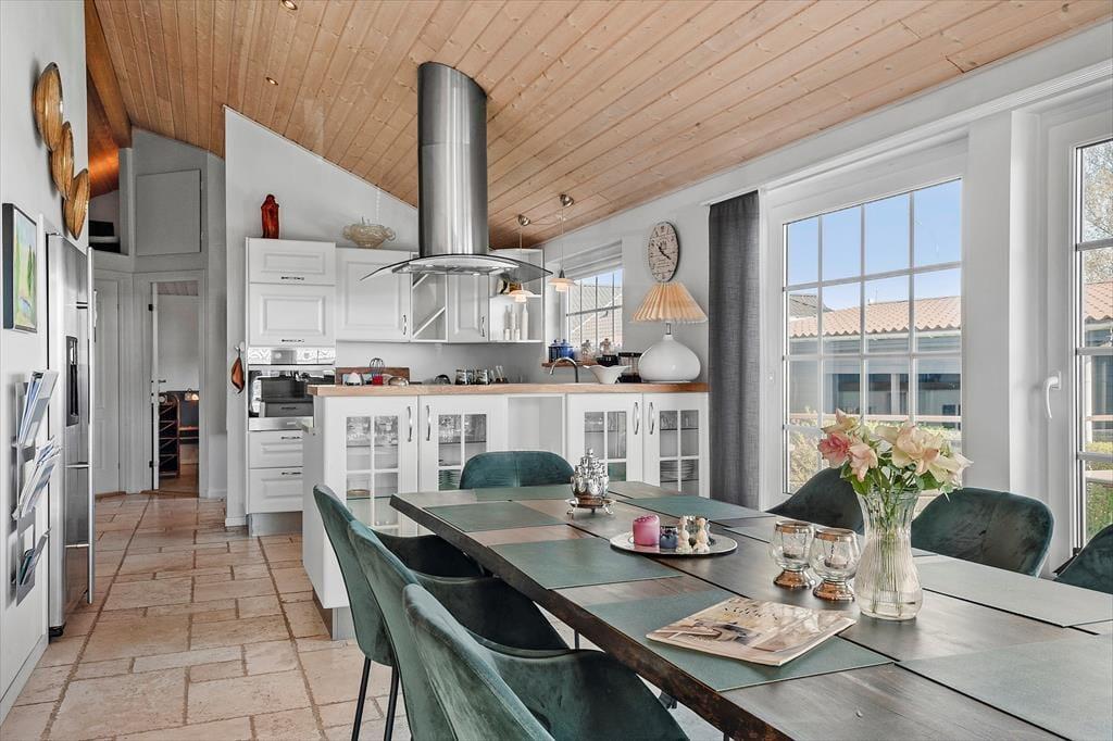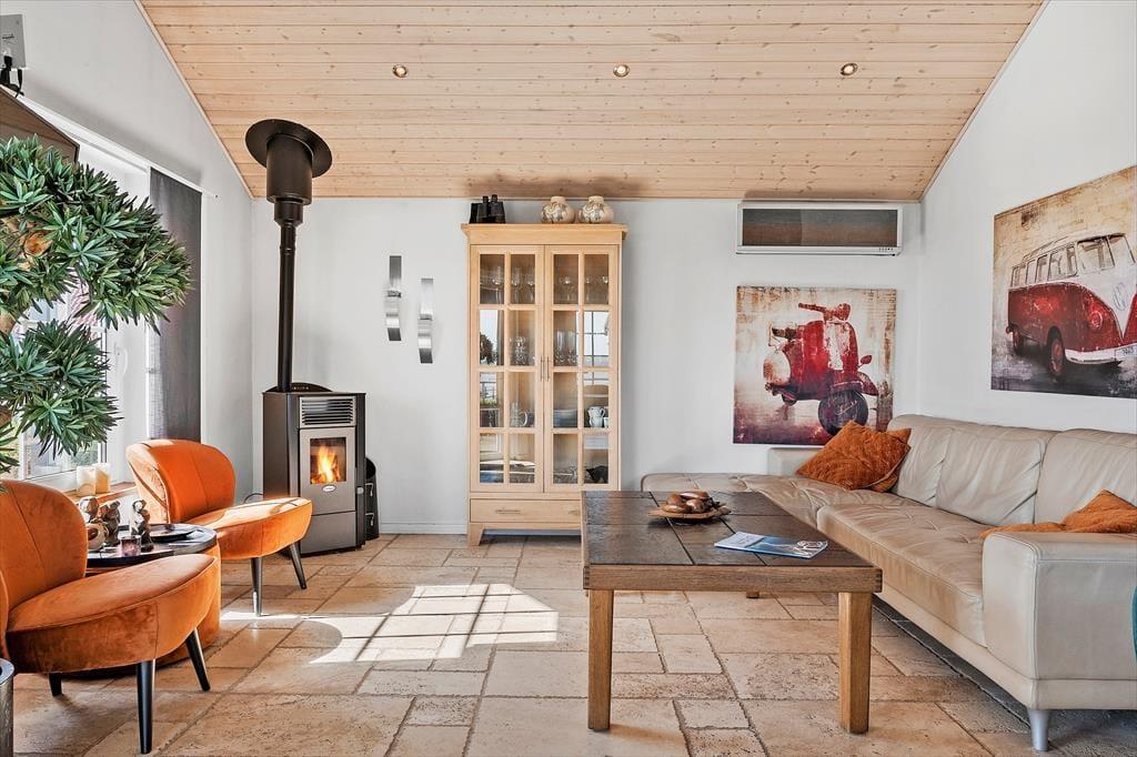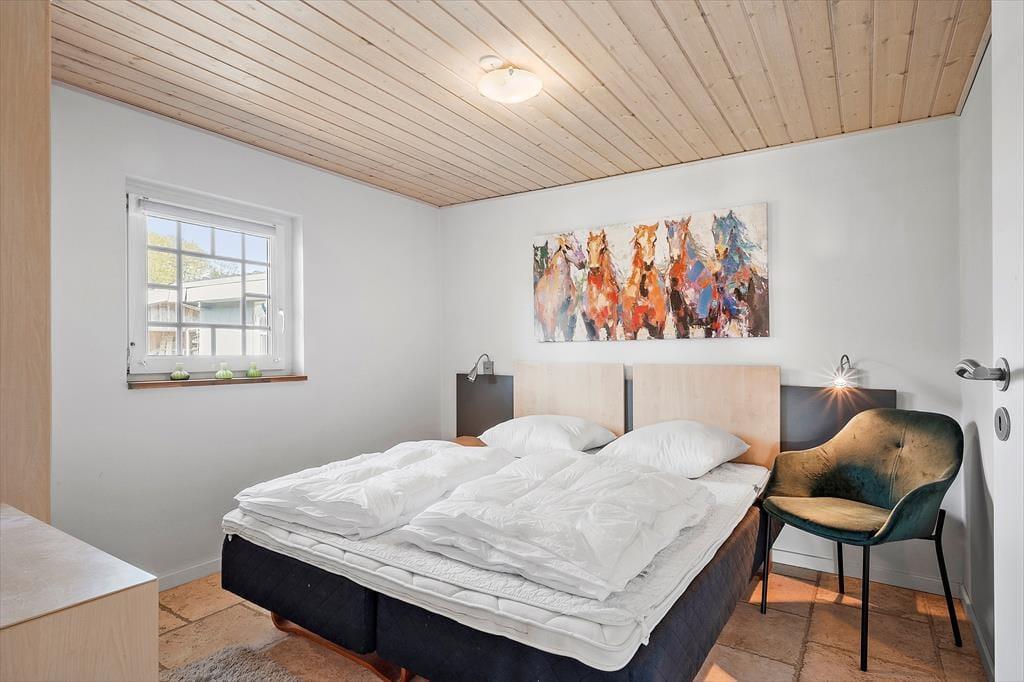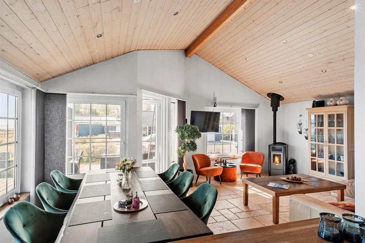 The inviting holiday home at Sellerup Strandvej 26 offers a bright and airy atmosphere with vaulted ceilings and large windows that let the sunlight stream in. The open connection between the kitchen and the living room creates a social hub where you can enjoy cozy dinners and relaxing evenings with family and friends. The tasteful décor and spacious living room invite peace and togetherness, with the view of the fjord always present in the background.