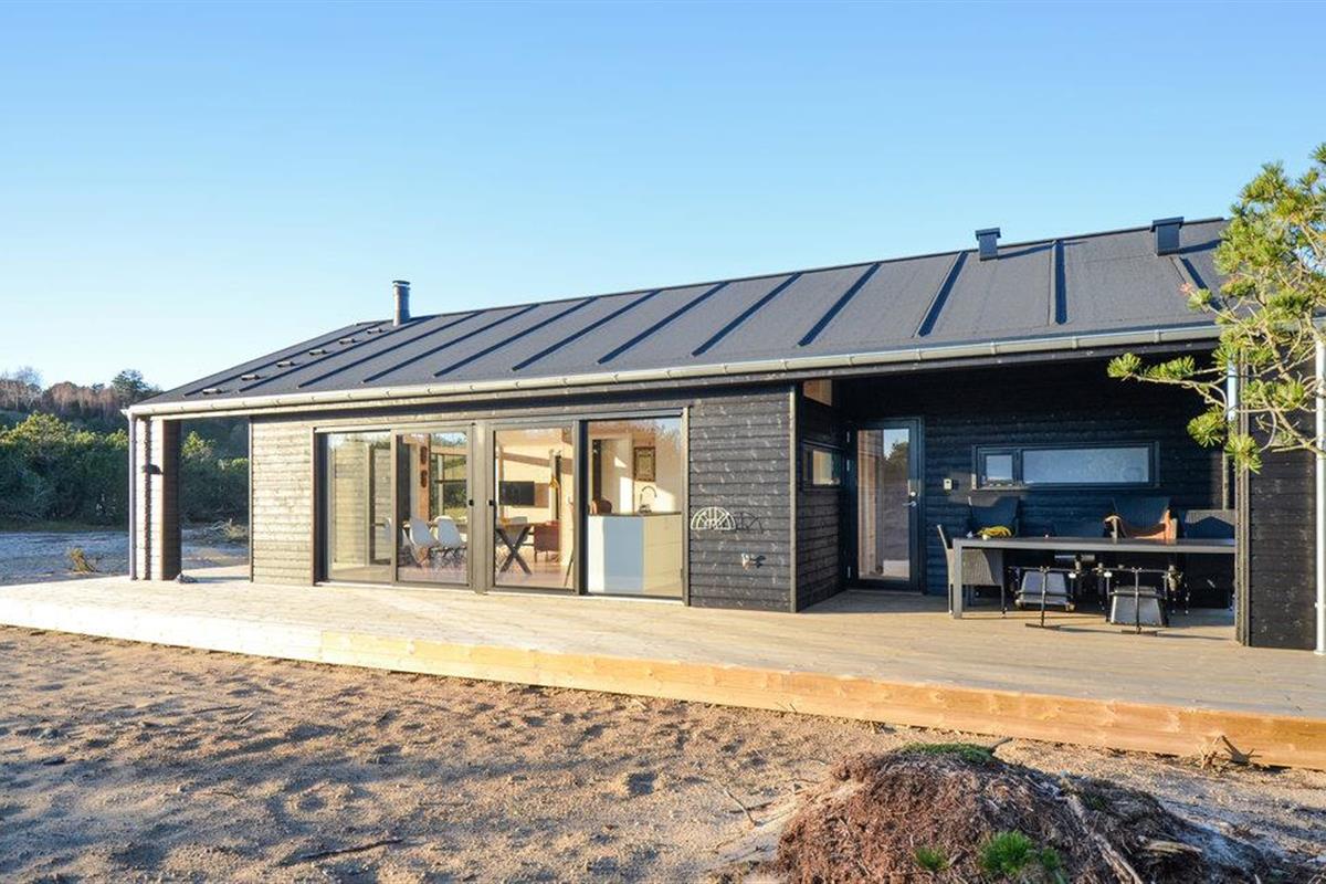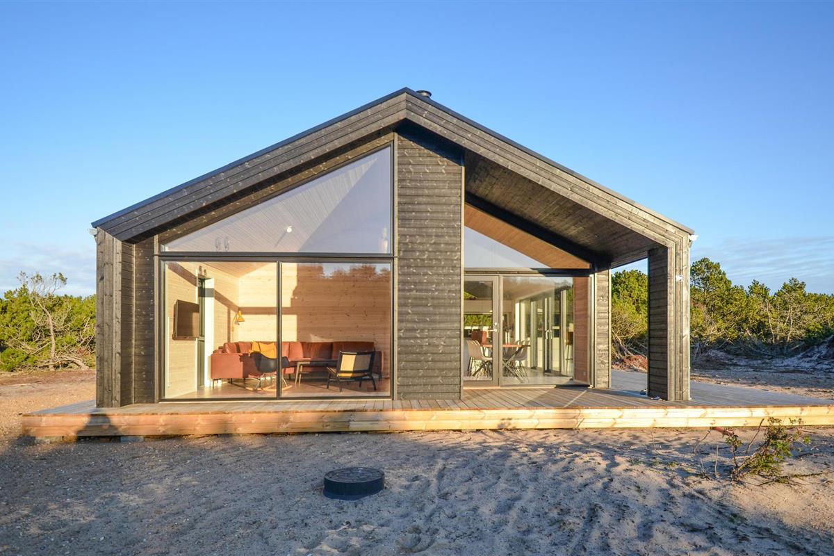 Modern houten vakantiehuis in Anholt met zonnig terras en dichtbij het strand.