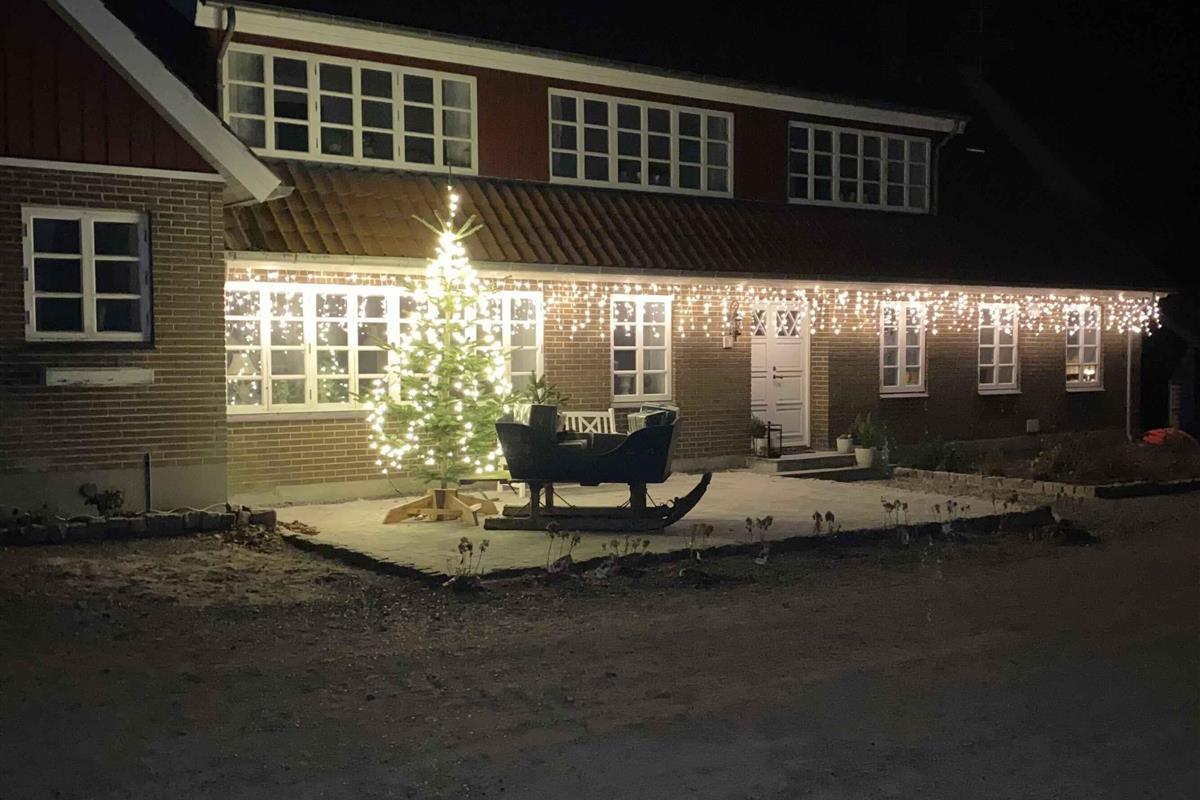 stor feriebolig, indrettet i badehotelstil overalt lige fra indretning til porcelæn, varmepumpe, værelser i hver sit værelse, grovkøkken ved siden af det almindelige køkken, udespa, shelter, stor terrasse 125 m2, bær- og urtehave som må benyttes