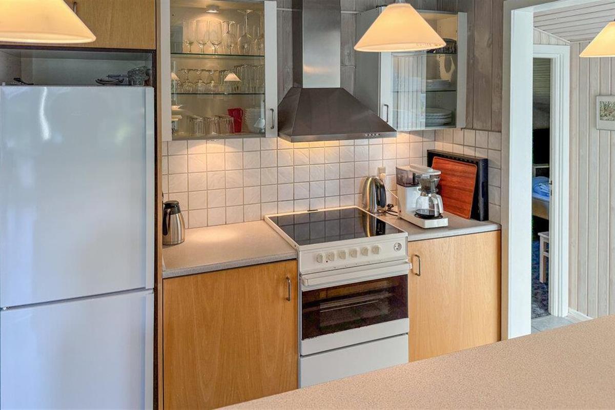 Geniet van wat vrije tijd in dit vakantiehuis, dat indruk maakt met zijn rustige ligging en lichte, vriendelijke sfeer. De open woon- en eetruimte met comfortabele stoelen nodigt uit tot ontspannen en gezellig samenzijn. Kijk samen een film, speel kaart of lees in alle rust. De aangrenzende keuken is praktisch en volledig uitgerust, zodat je comfortabel kunt koken en van je maaltijden kunt genieten aan de grote eettafel. Wanden met houten lambrisering, lichte kleuren en grote ramen creëren een warme, vriendelijke sfeer.