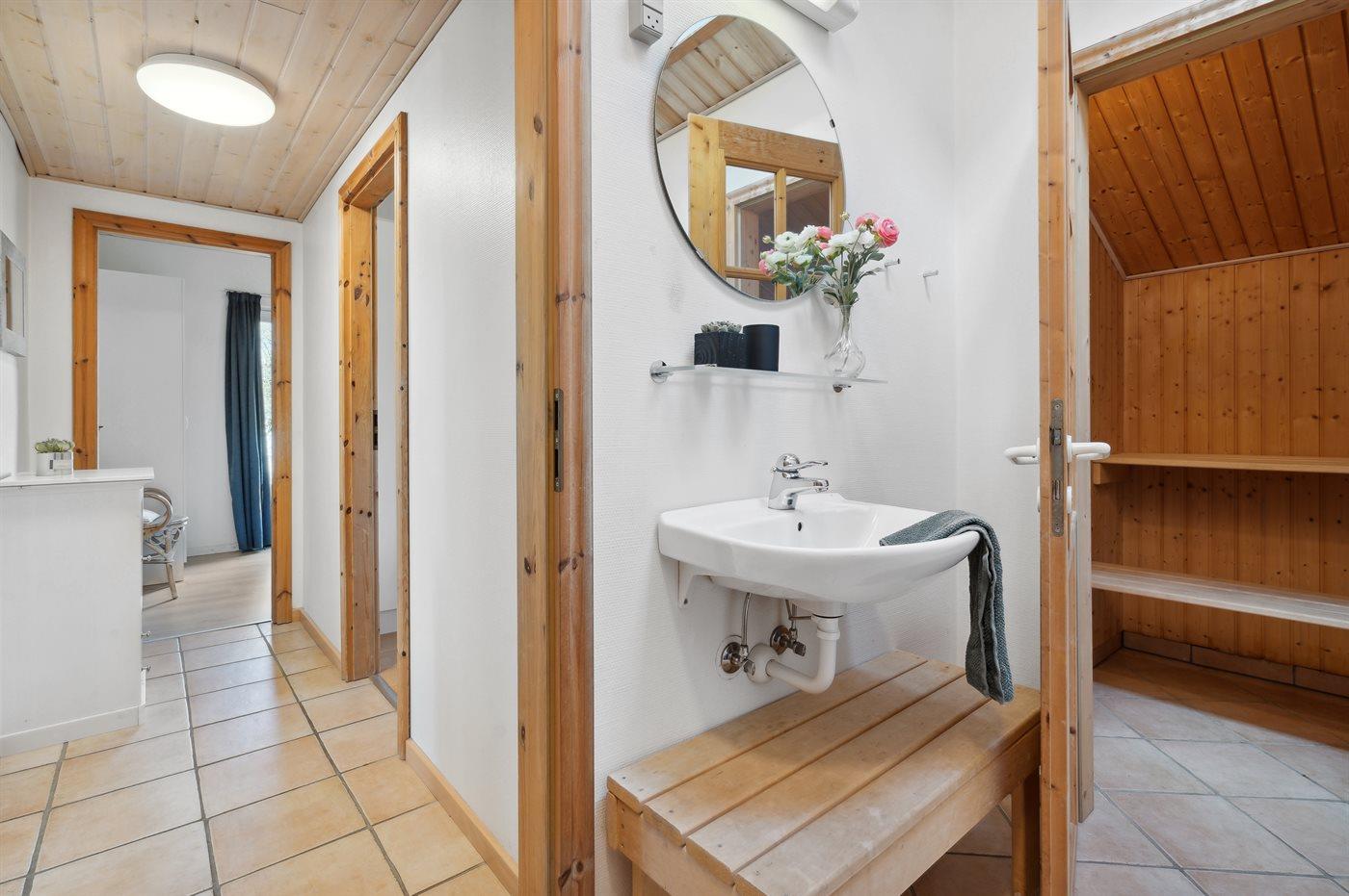 Er is 2 badkamers met douche en 2 toiletten. Er is vloerverwarming in 2 van de badkamers. De sauna biedt de gelegenheid tot ontspanning.