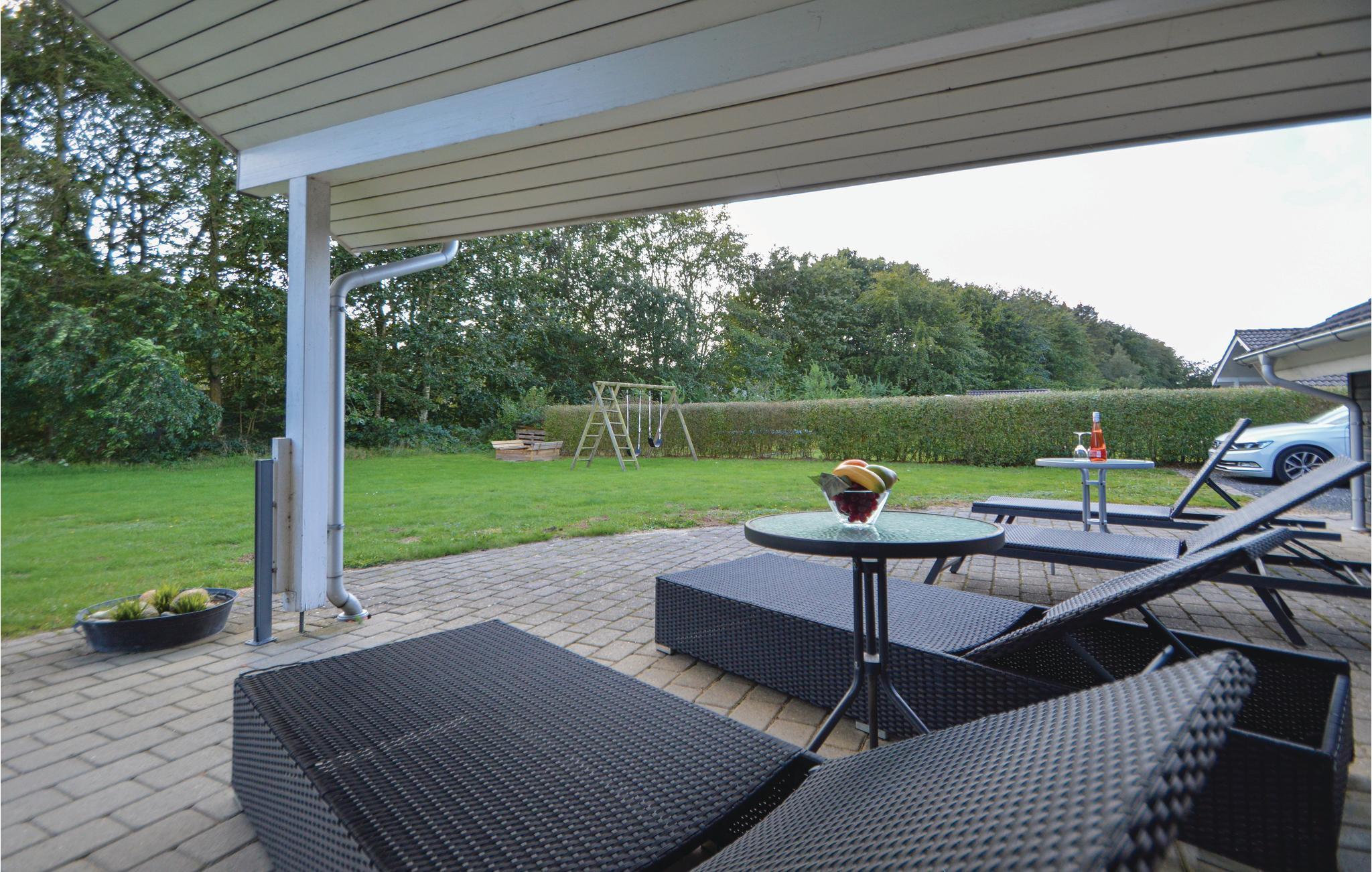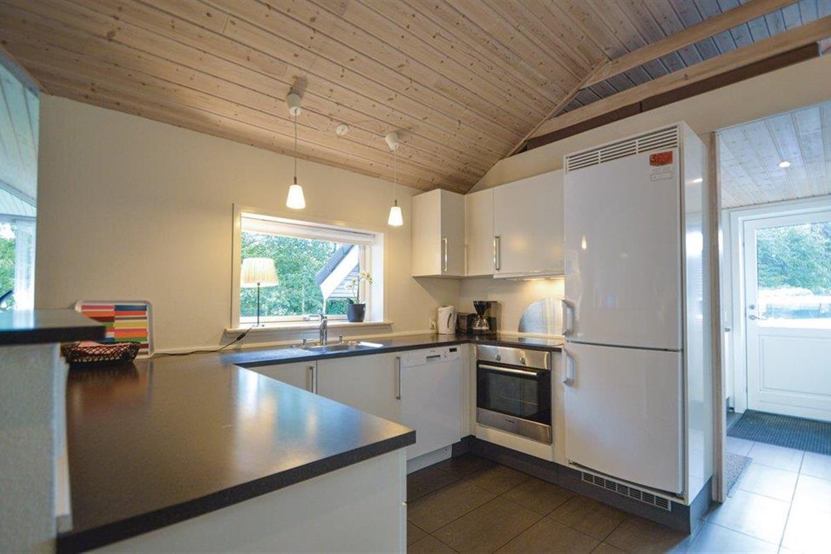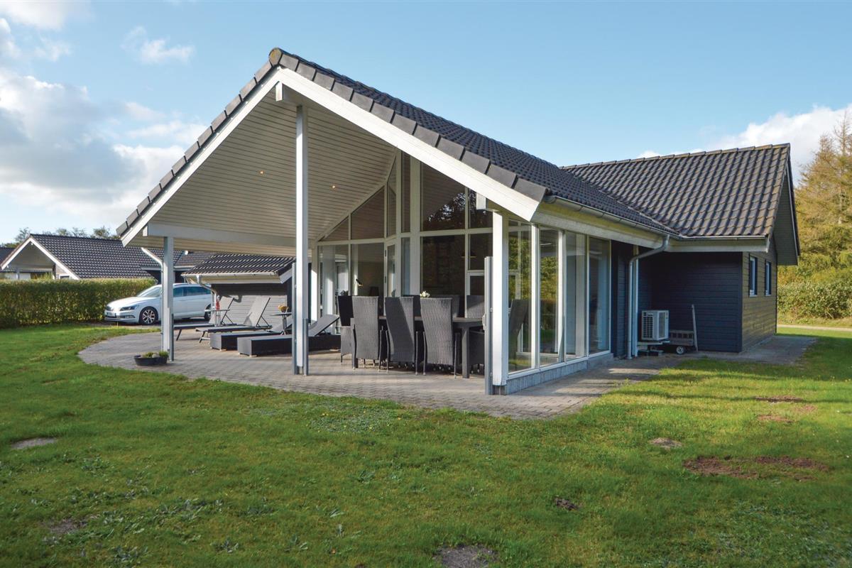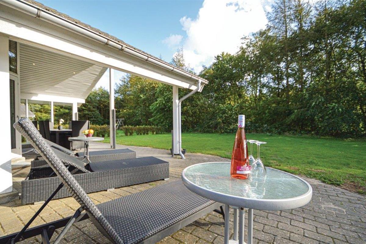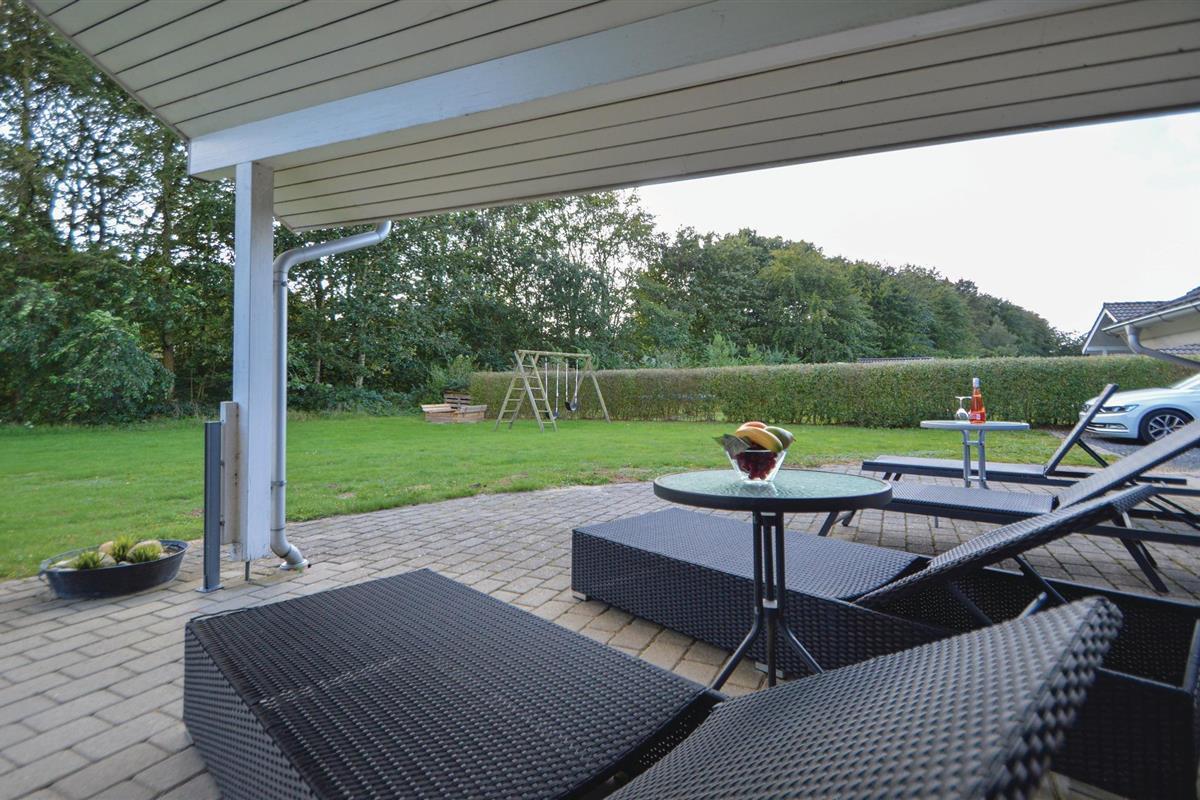 Het huis ligt op een grasveld met een hoge begroeiing richting het zuidwesten, wat een goed windscherm biedt. Hier kunt u genieten van echt lange zomeravonden en bijna de helft van het terras is zelfs overdekt.