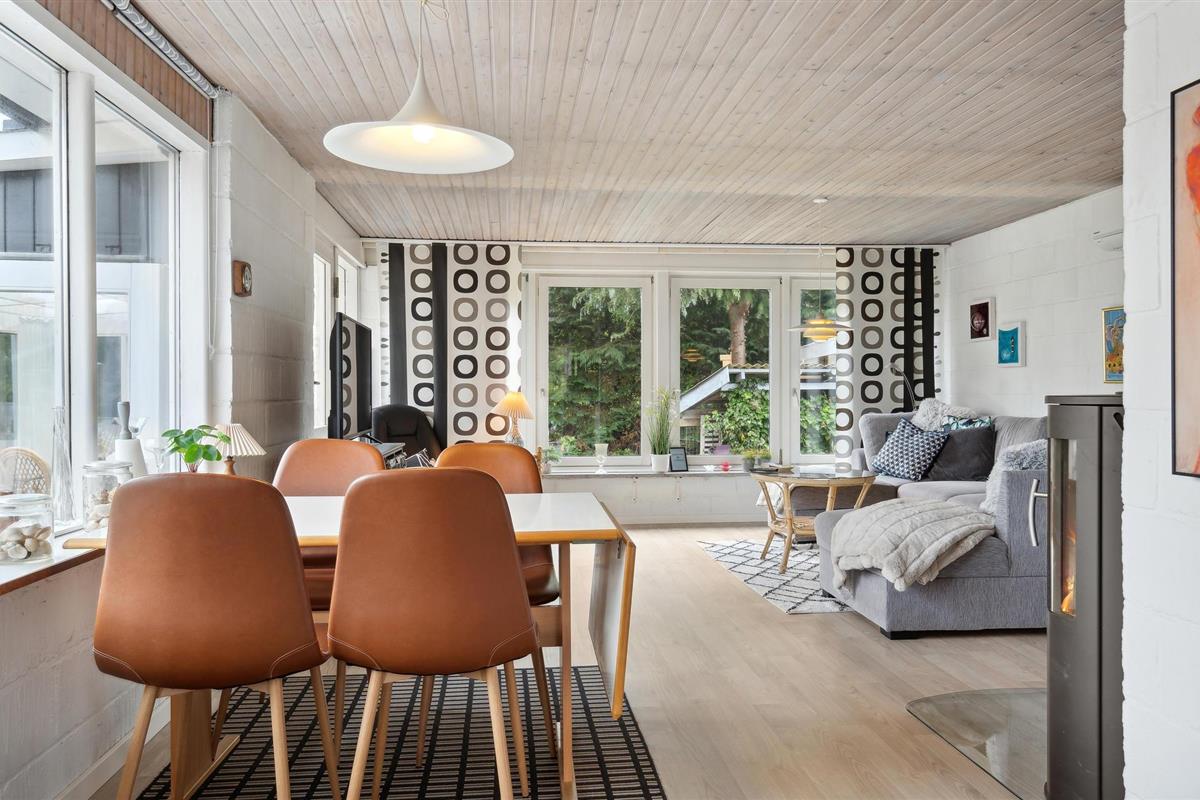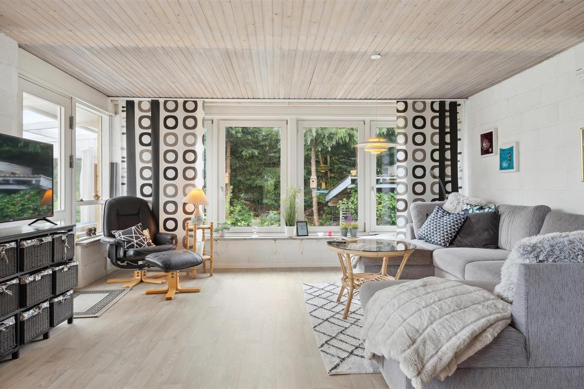 De woonkamer staat in open verbinding met de keuken, waar u tijdens het koken en afwassen kunt genieten van het uitzicht op de tuin.