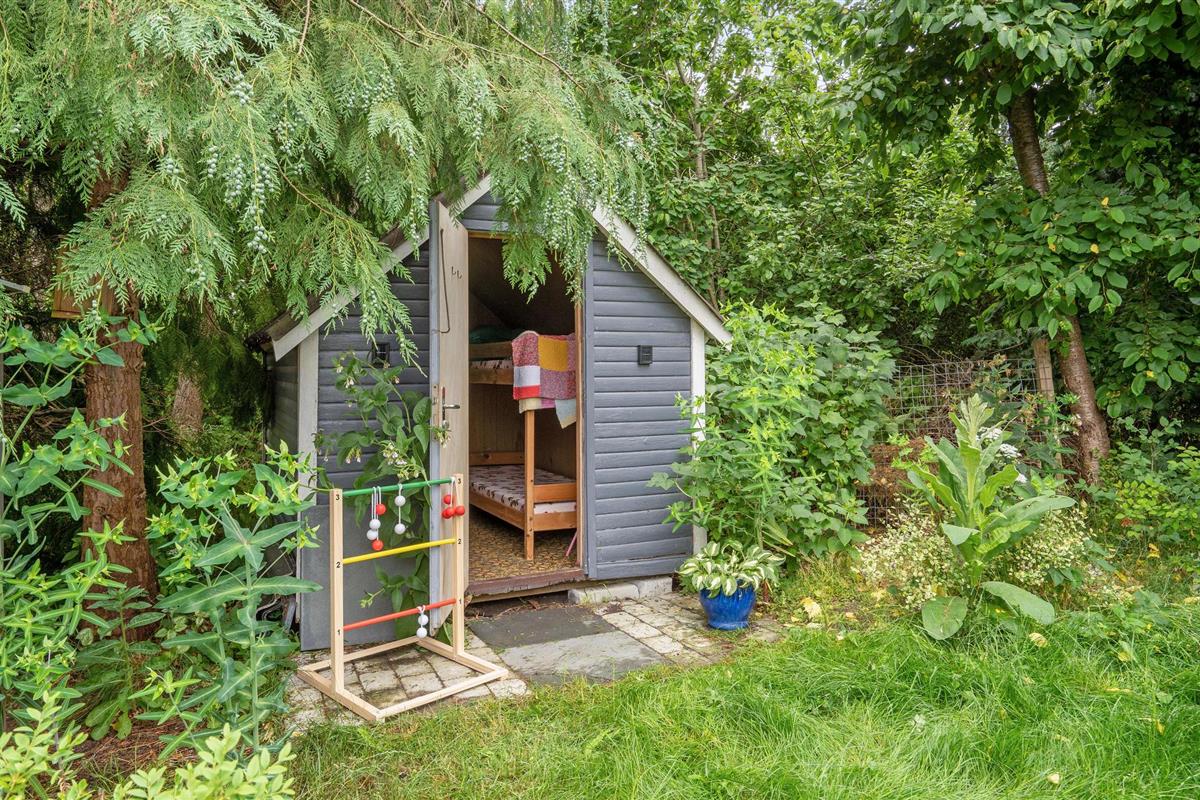 Het bijgebouw in de tuin bevat onder andere een stapelbed en speeltoestellen.