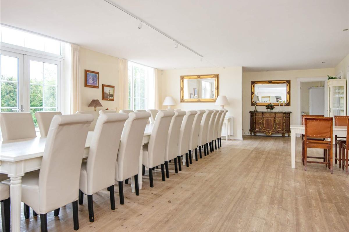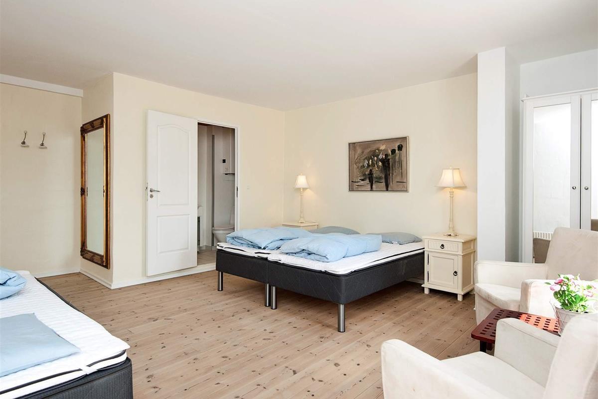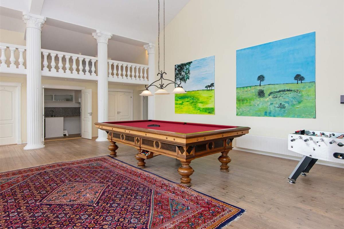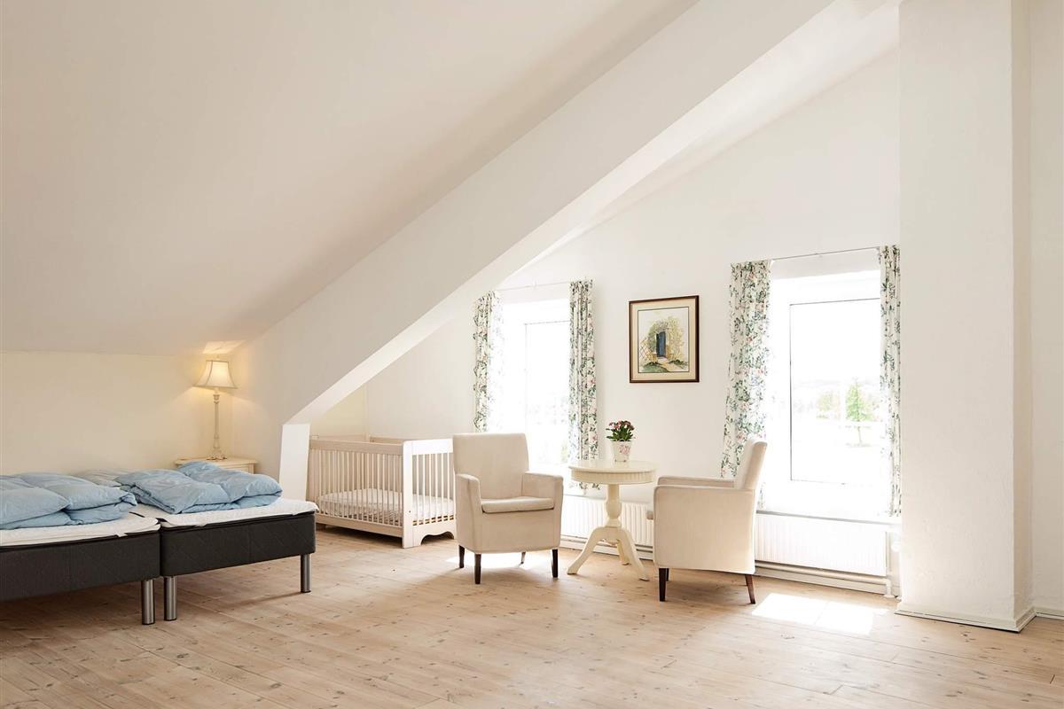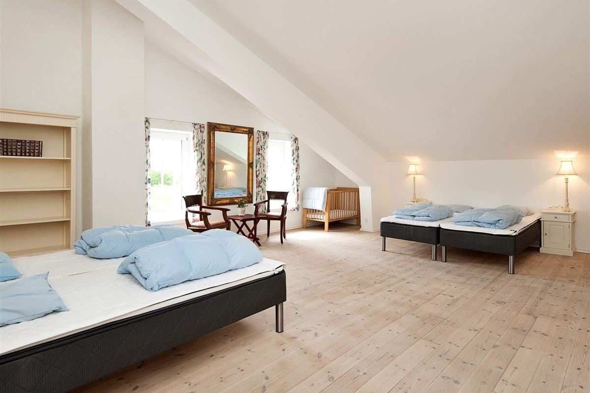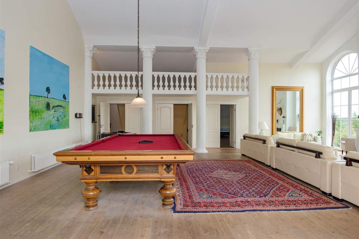 Oben im Dachgeschoss findet man einen 7 Meter hohen Saal mit Säulen, großen Fenstern und Aussicht zum See und dem Asbølholm Gutshaus. Zur Verfügung stehen auch zwei elektrische Kamine, eine Teeküche und ein Mahagoni Billardtisch, der einst im Schloss Valdemar stand. Weiterhin gibt es drei Schlafzimmer mit eigenem Bad, drei Schlafzimmer ohne Bad, ein Bad zum Saal hin sowie zwei extraordinäre Hemse mit Aussicht hinunter in den Saal. Eines der Zimmer hat ein Fenster zur Turnhalle.