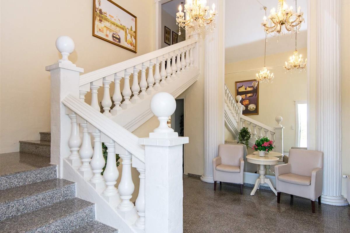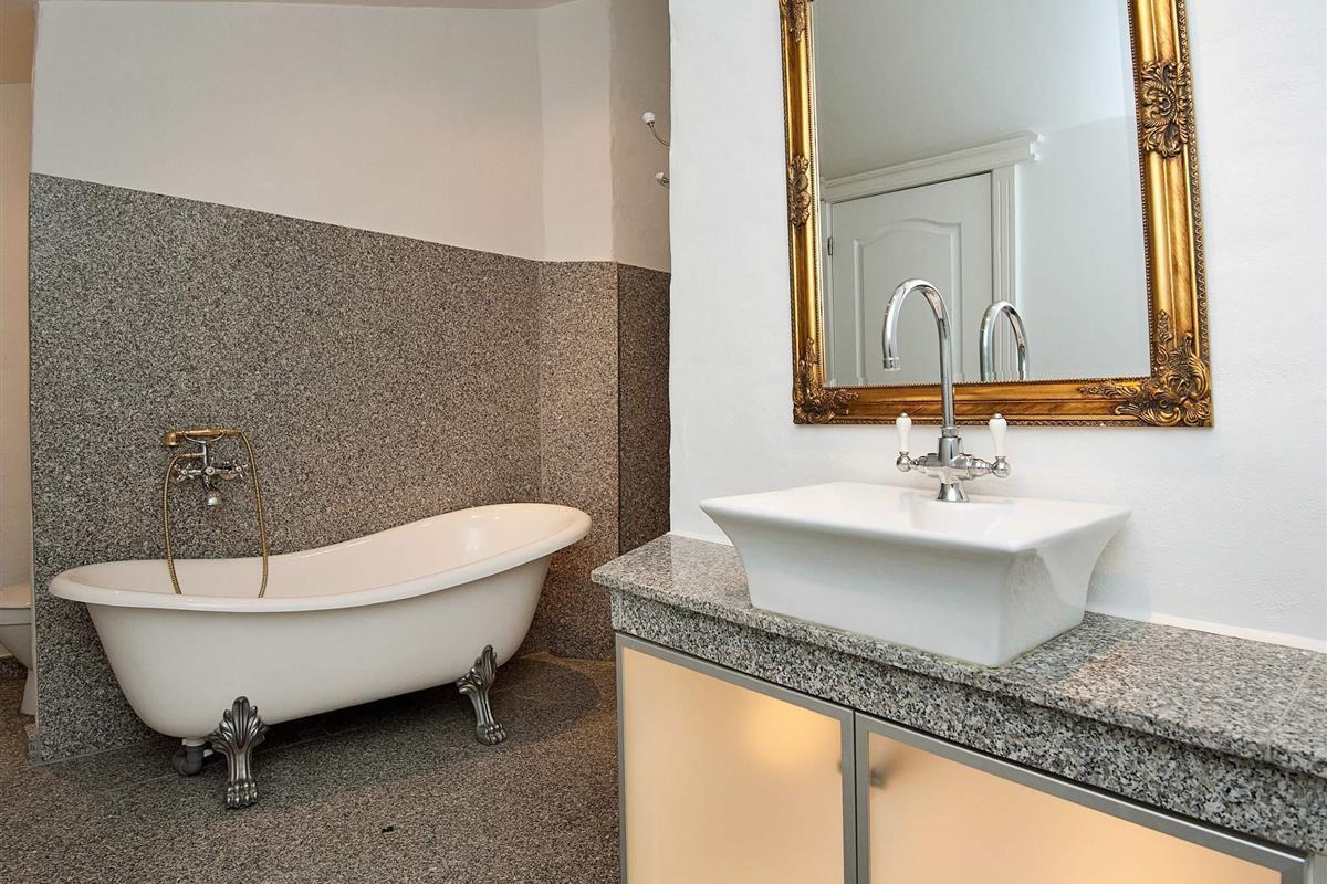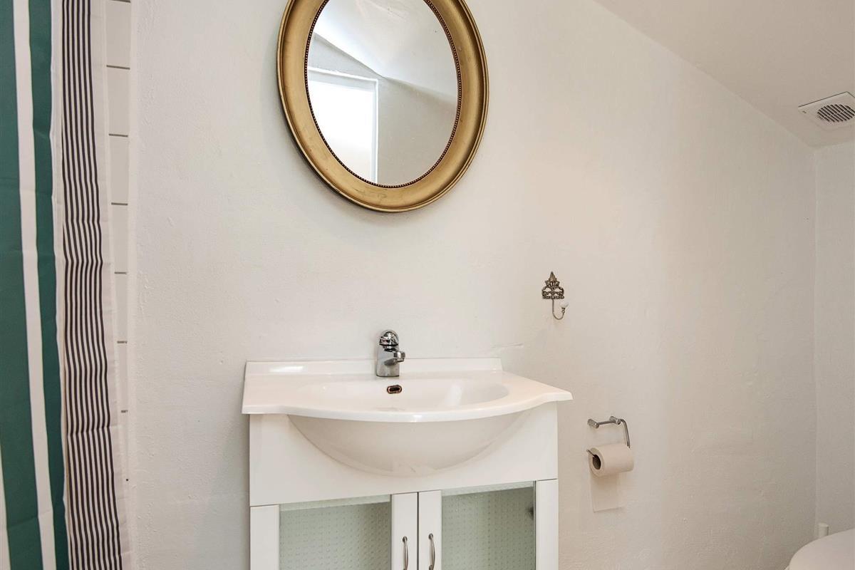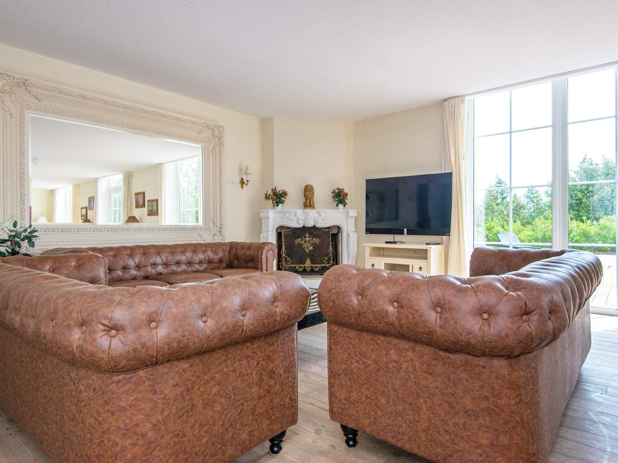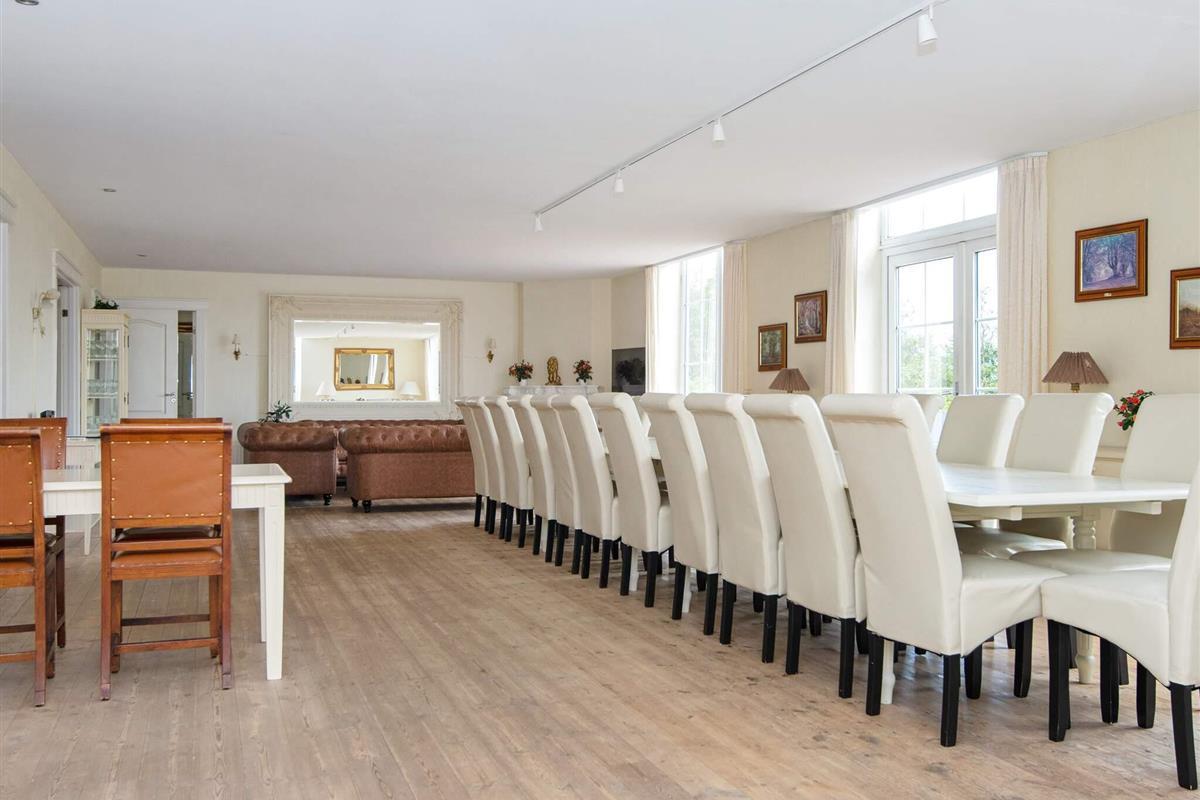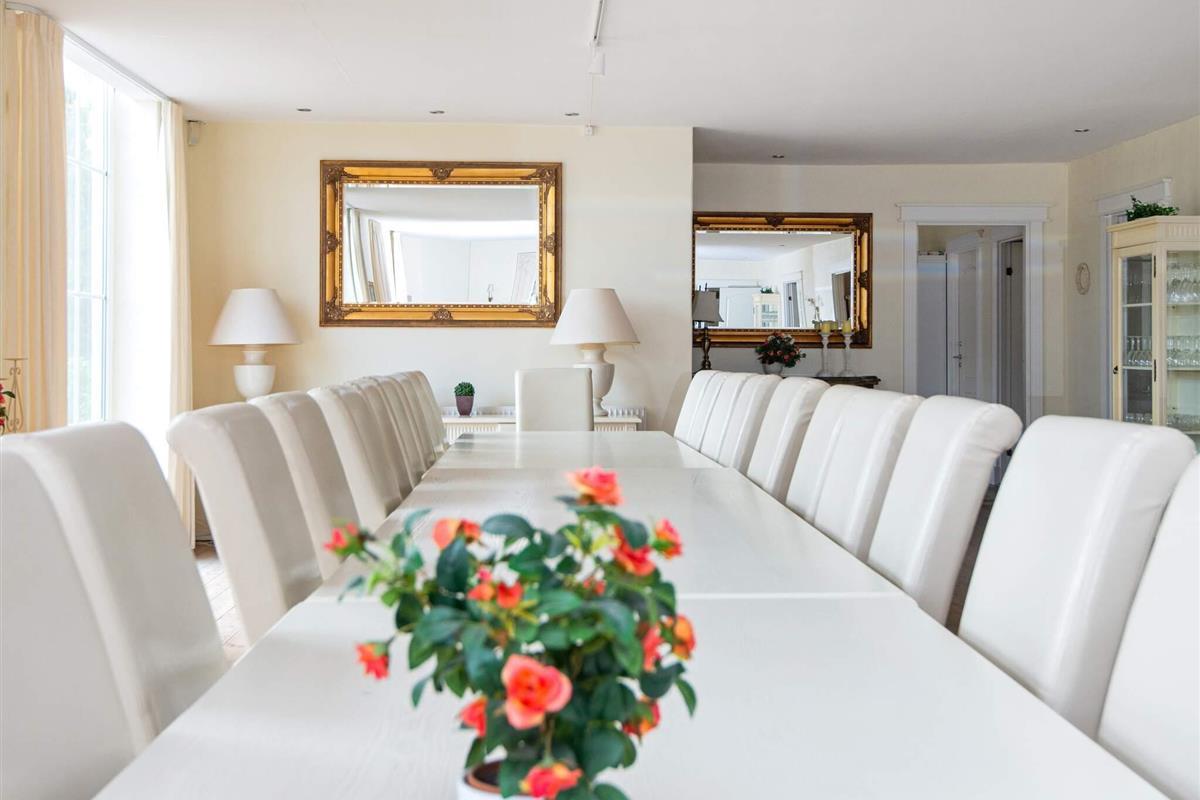 Oben im Dachgeschoss findet man einen 7 Meter hohen Saal mit Säulen, großen Fenstern und Aussicht zum See und dem Asbølholm Gutshaus. Zur Verfügung stehen auch zwei elektrische Kamine, eine Teeküche und ein Mahagoni Billardtisch, der einst im Schloss Valdemar stand. Weiterhin gibt es drei Schlafzimmer mit eigenem Bad, drei Schlafzimmer ohne Bad, ein Bad zum Saal hin sowie zwei extraordinäre Hemse mit Aussicht hinunter in den Saal. Eines der Zimmer hat ein Fenster zur Turnhalle.