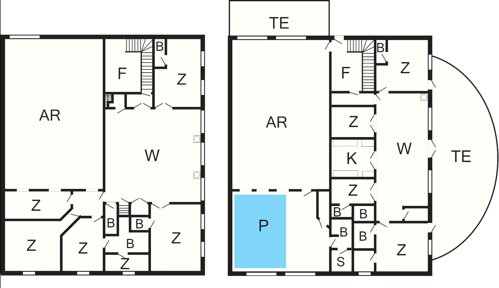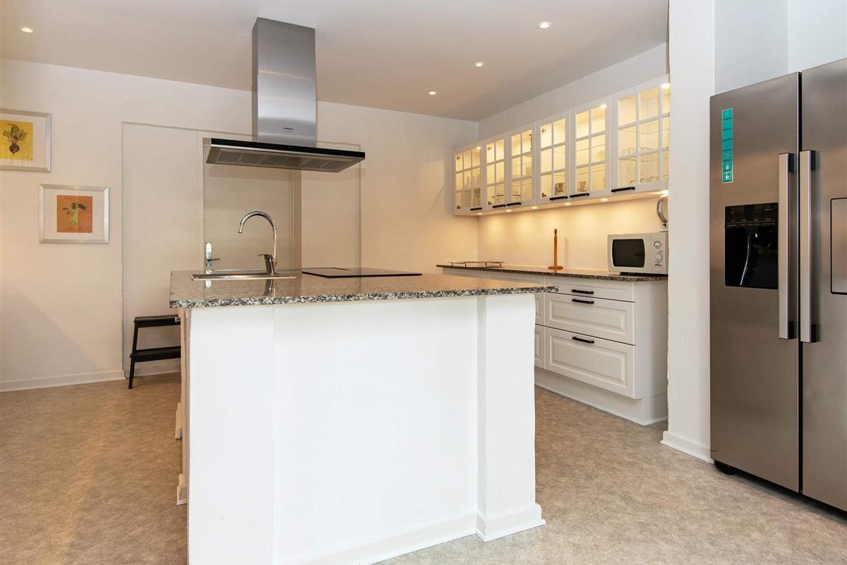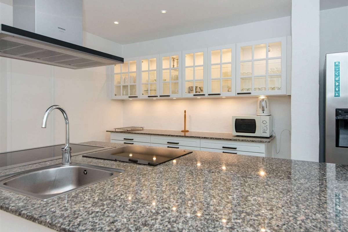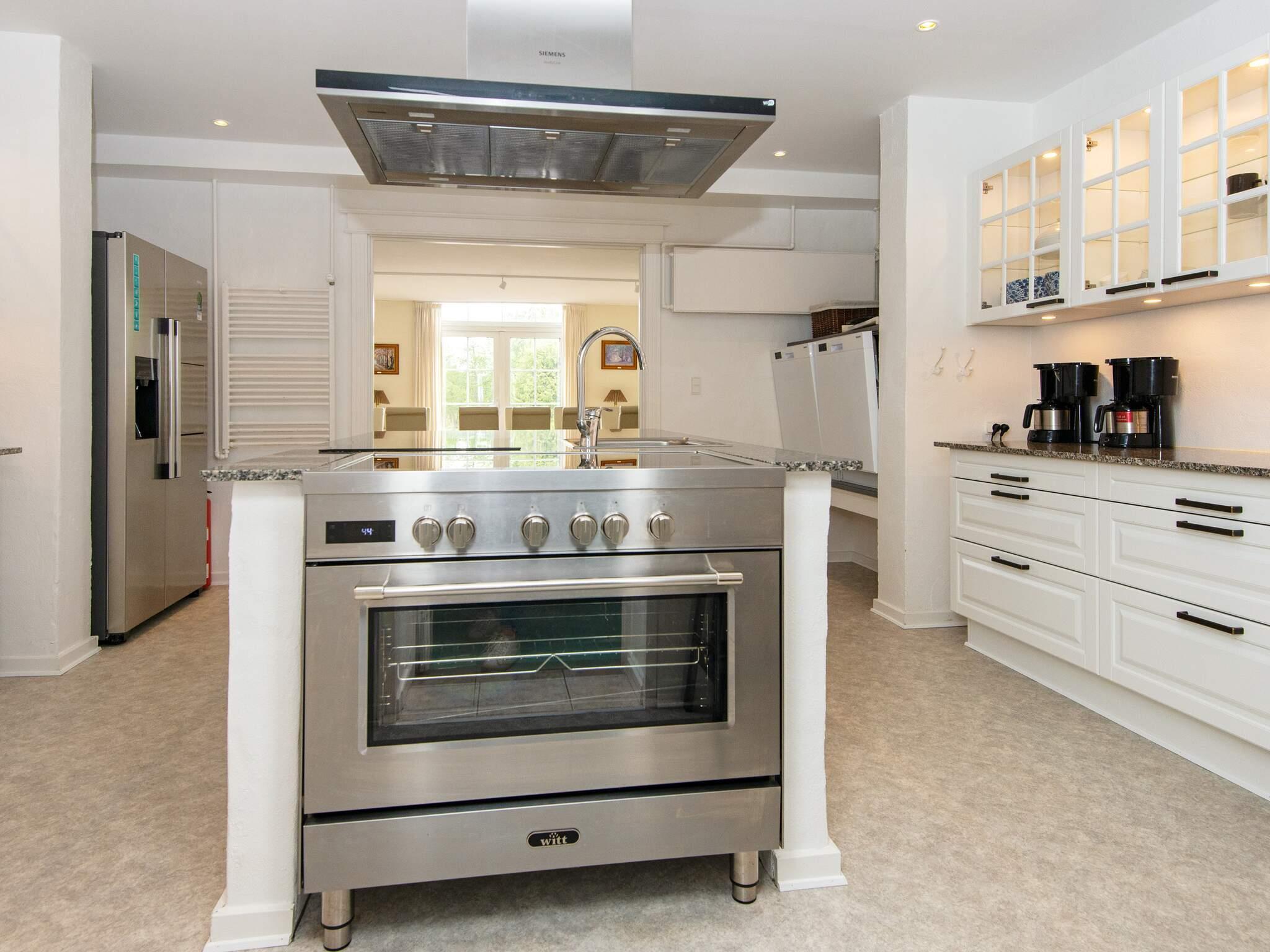 Neben dem Wohnzimmer liegt die praktisch eingerichtete Küche mit Kochinsel. Dort stehen zwei Elektroherde zur Verfügung. Im Erdgeschoss gibt es zudem drei Schlafzimmer mit zugehörigem Bad, ein Schlafzimmer ohne Bad und ein Badezimmer neben dem Esszimmer und dem Aktivitätsbereich.