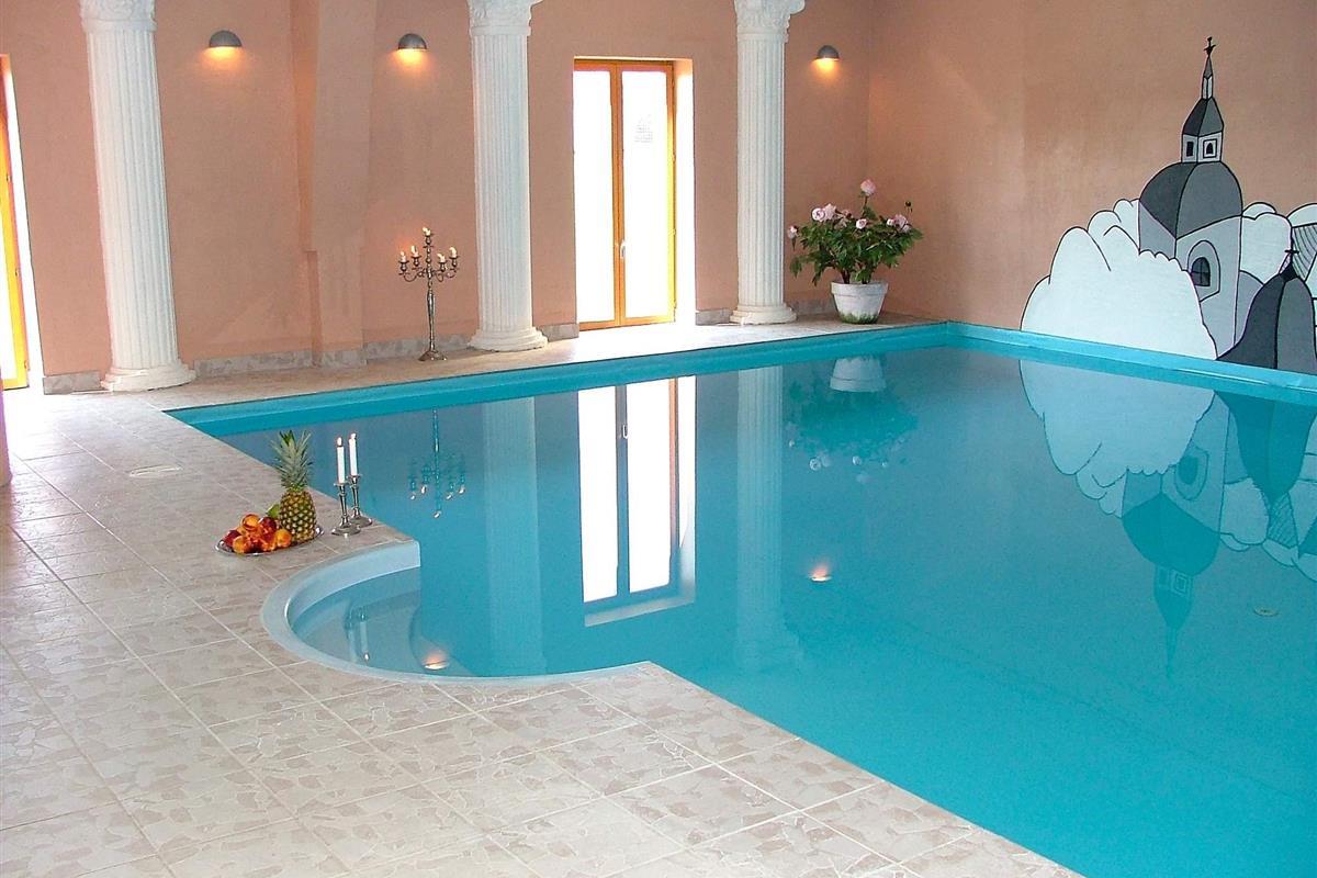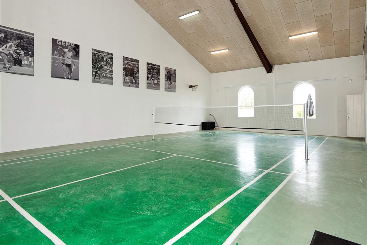 Der Aktivitätsbereich besteht aus einer Turnhalle mit Basketball- und Badmintonfeld sowie Schwimmbereich mit weißen Säulen, Swimmingpool, Sauna und Duschraum.