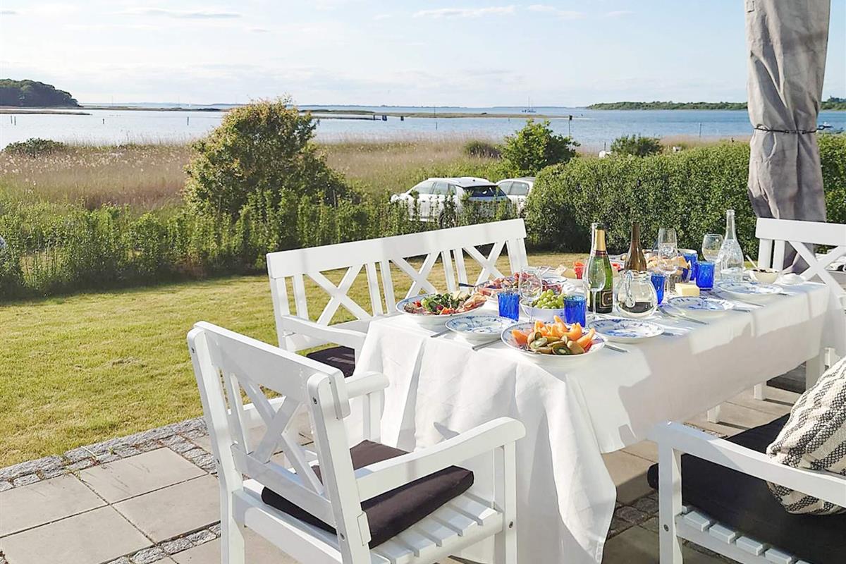 Der schöne Garten und die herrlichen Terrassenflächen mit bequemen Gartenmöbeln laden sowohl am Wasser als auch im nach Osten ausgerichteten Innenhof zum Aufenthalt im Freien ein.