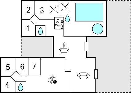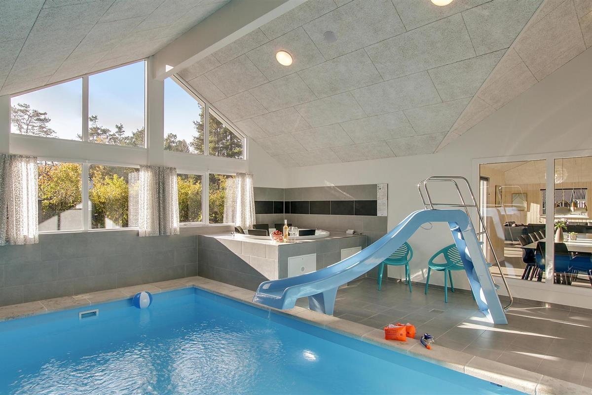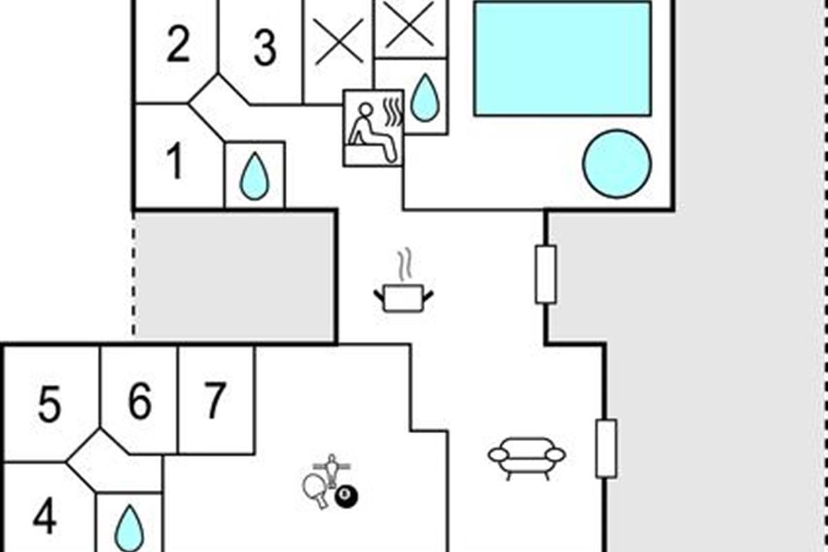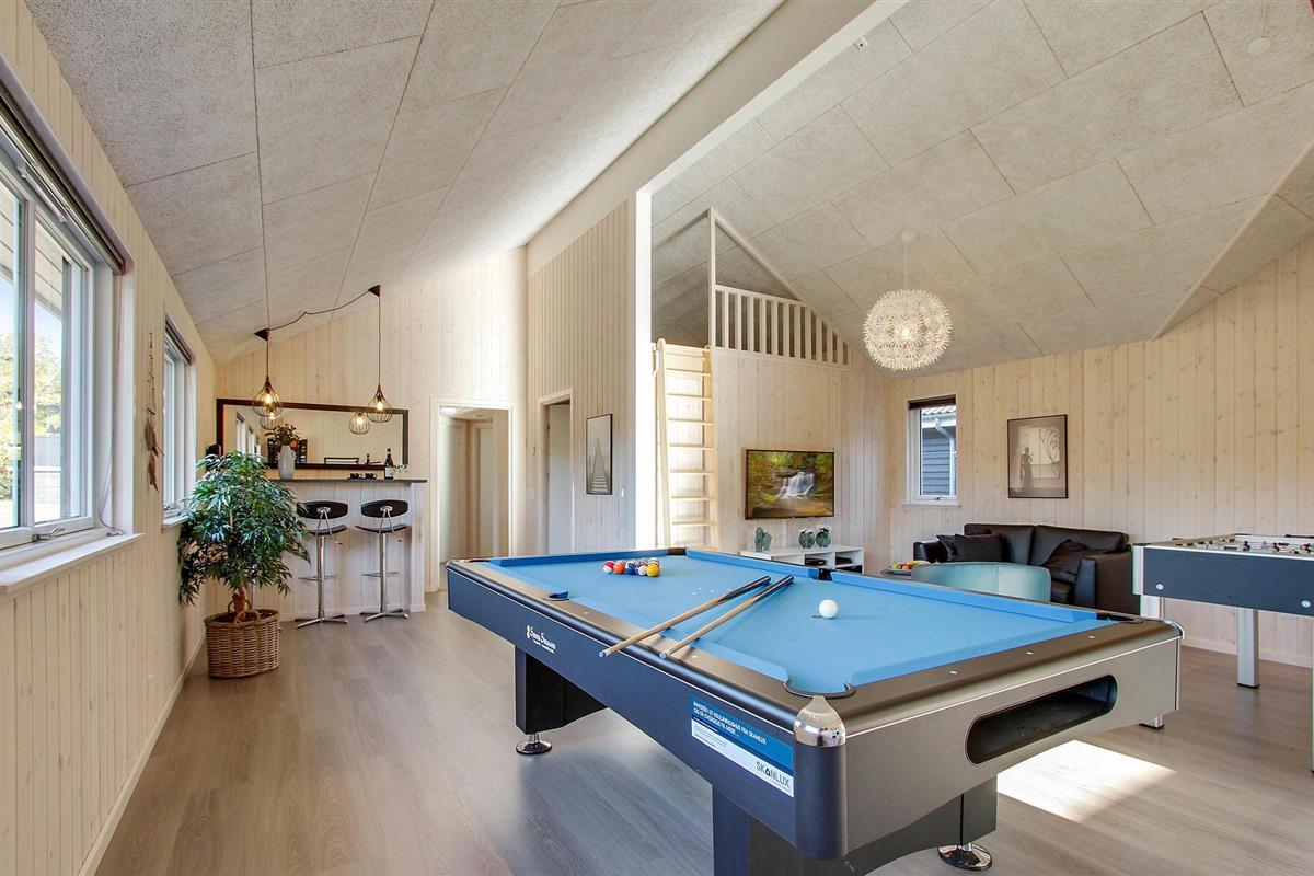 Interessant en mooi vakantiehuis, waar aandacht is besteed aan de kleinste details. Het huis is gemaakt voor een familievakantie, waarbij de kinderen bijvoorbeeld in het grote zwembad kunnen spelen. Hier vindt u ook de grote whirlpool en de rustgevende sauna. De activiteitenruimte daagt u uit tot familietoernooien in tafeltennis en biljart en in de kleine bar met koelkast kunt u uw eigen favoriete drankjes mixen. De grote mezzanine is erg gezellig en zeker populair bij de kinderen. De keuken is zeer goed uitgerust en aangepast aan de grootte van het huis, met twee fornuizen, twee vaatwassers en veel ruimte in de koelkast en vriezer. Het huis ligt in een prachtige omgeving met mooie natuur, het is maar een klein stukje rijden naar het strand. Een verbruikskorting en de eindschoonmaak worden samen met de overige verbruikskosten contant in het huis betaald. Beddengoed, handdoeken, kinderbed en kinderstoel kunnen gehuurd worden bij het plaatselijke kantoor.