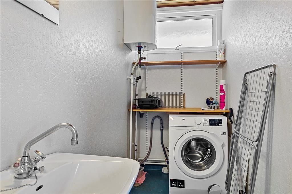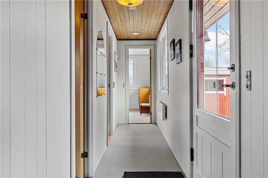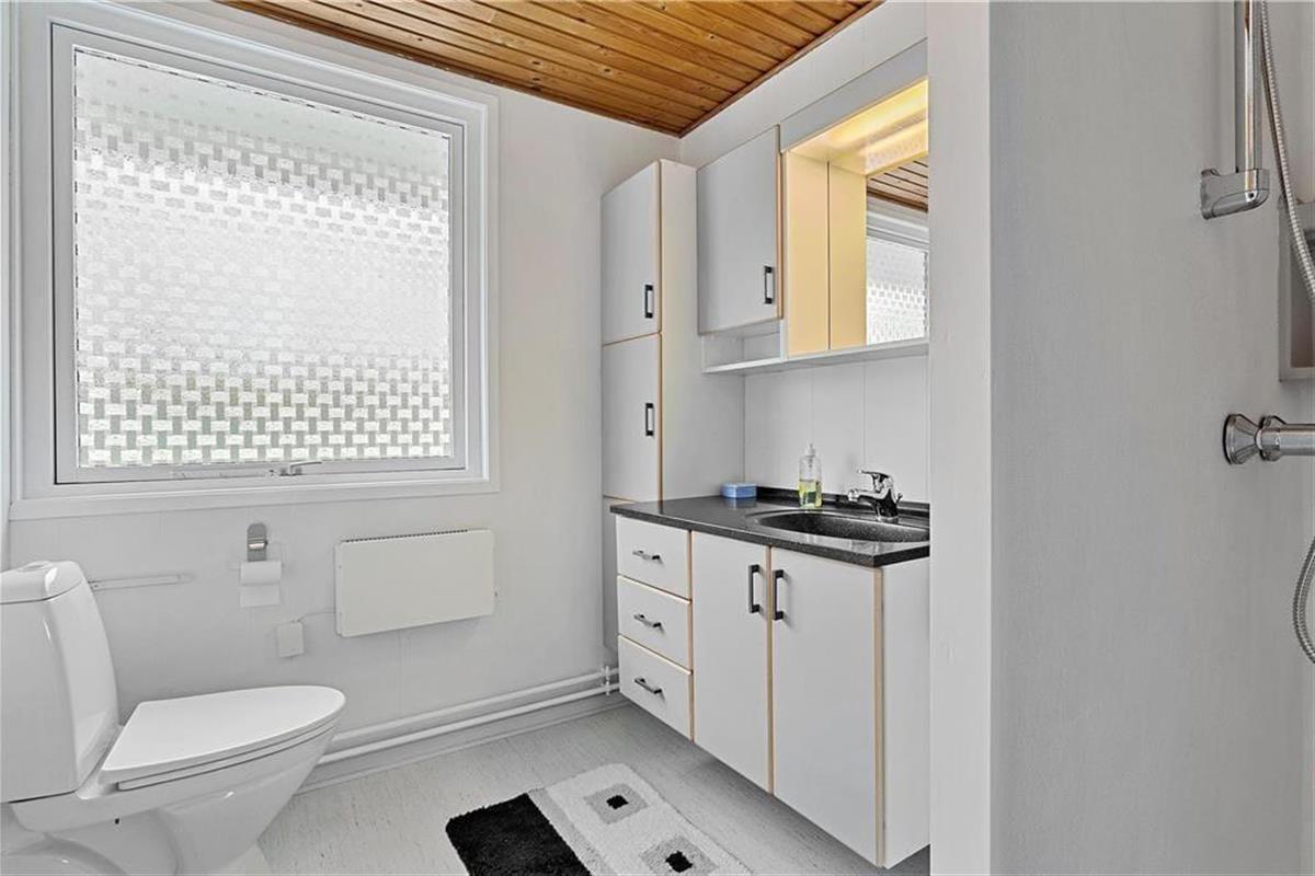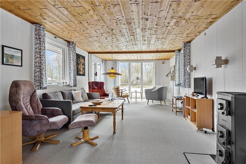 Das Ferienhaus ist mit einem geräumigen Wohnbereich ausgestattet, der aus einem offenen Wohnzimmer und einer Essküche besteht. Große Fenster lassen viel Tageslicht ins Innere und bieten gleichzeitig einen schönen Blick auf den grünen Garten. Das Wohnzimmer bietet Blick auf den Fjord, sodass Sie die Nähe zur Natur genießen können. Der Holzofen ist nicht angeschlossen und dient nur zur Dekoration. Die Küche wurde 2018 renoviert, sodass Sie gute Bedingungen beim Kochen genießen. Es gibt zwei Schlafzimmer, von denen das größere einen Blick auf das Wasser und direkten Zugang zum Garten bietet. Und als Ergänzung zu den Schlafzimmern gibt es im Wohnzimmer ein Schlafsofa. Ein Badezimmer mit Dusche ist ebenfalls Teil der Ausstattung.