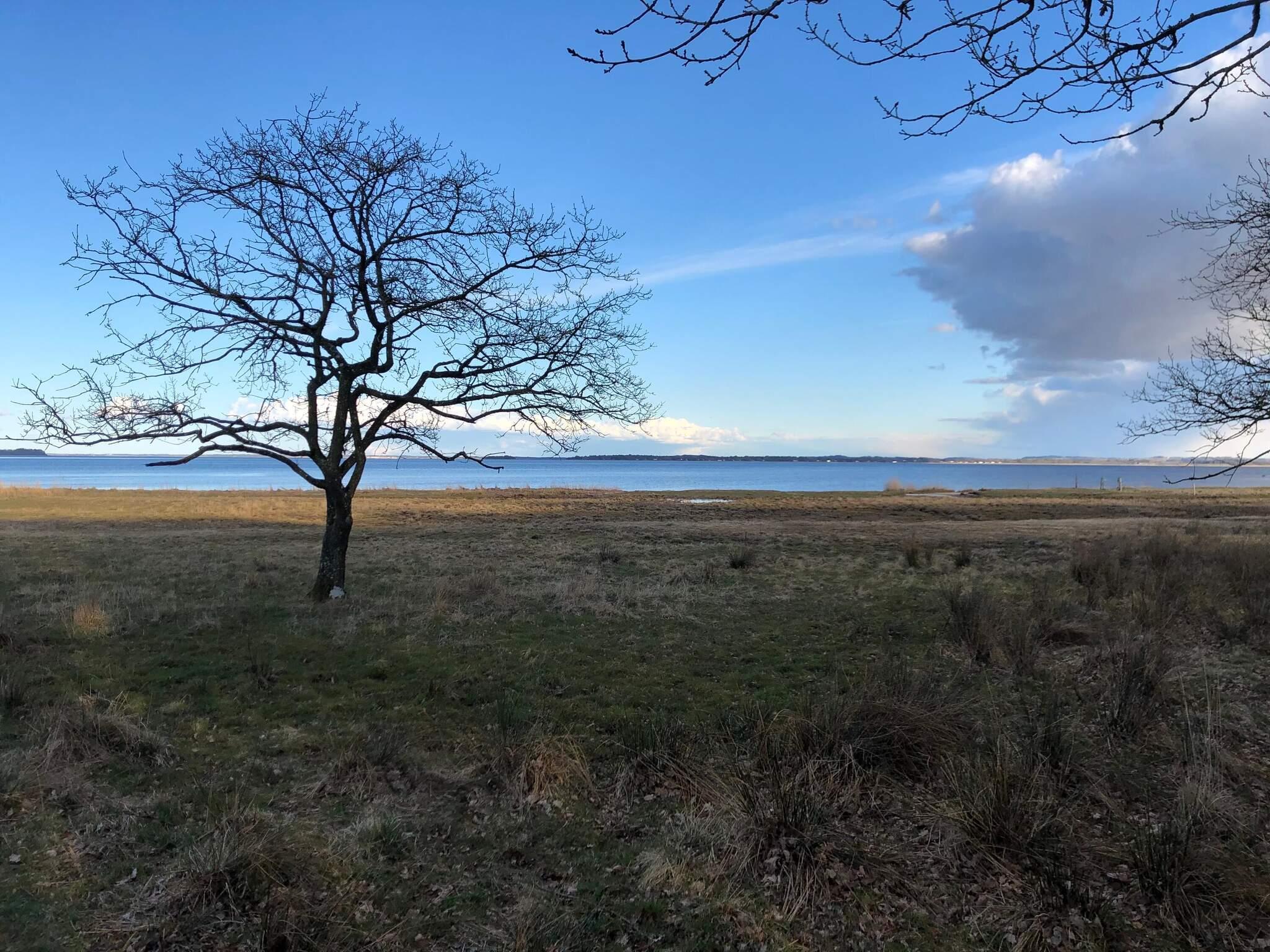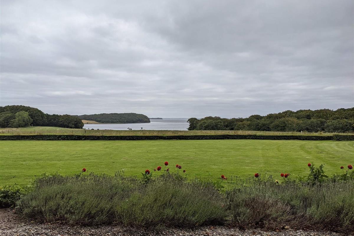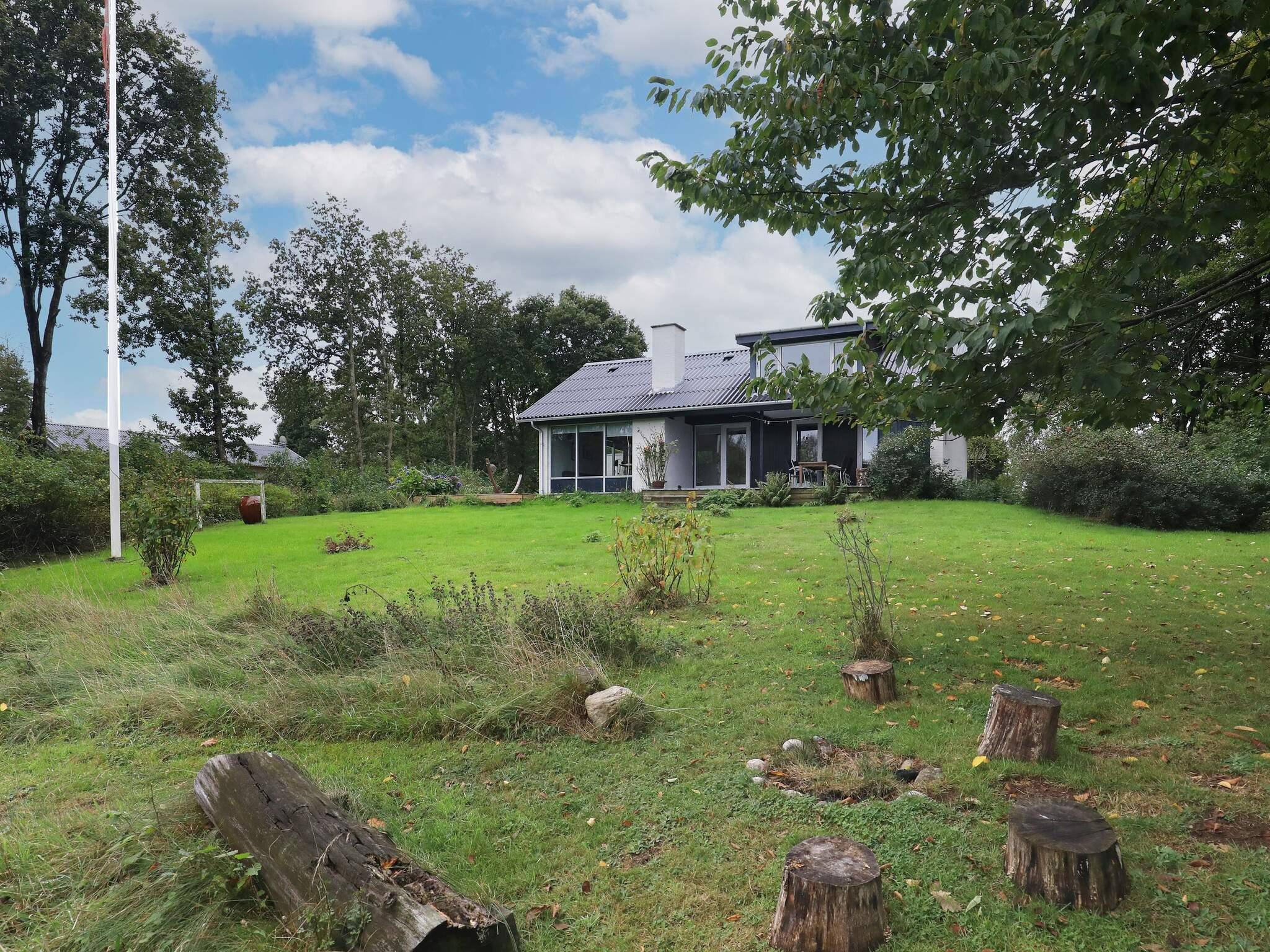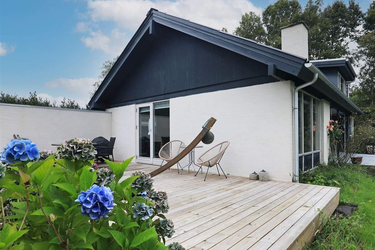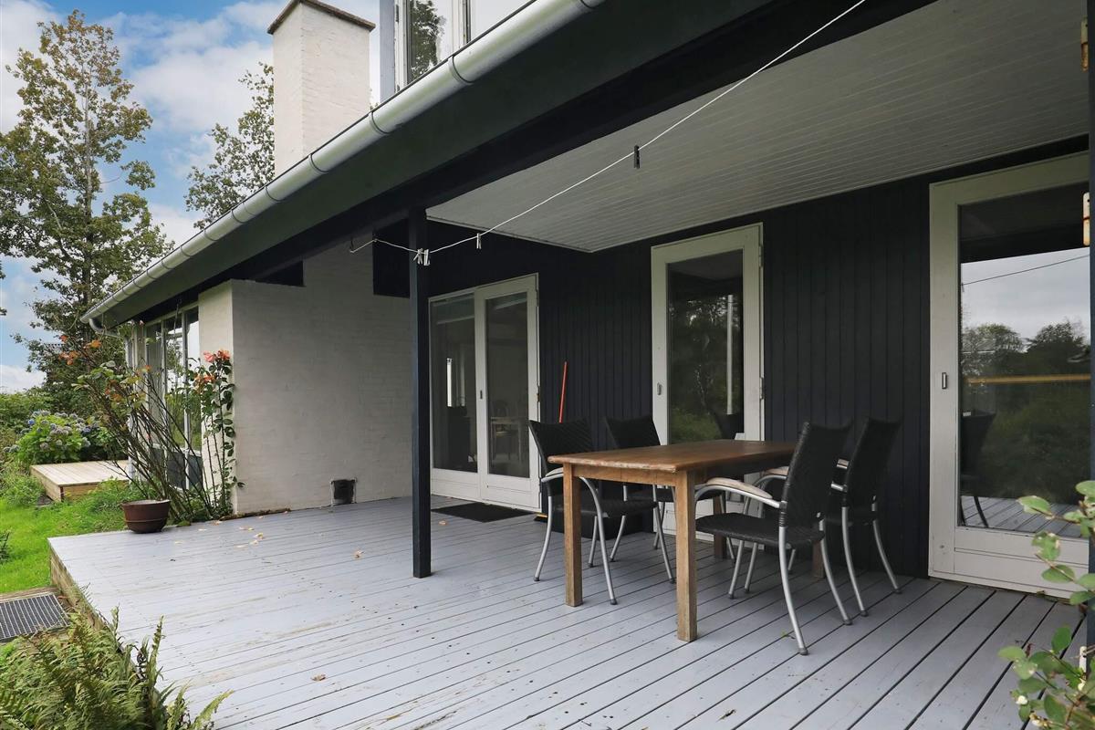 Sie wohnen hier auf einem weitläufigen Naturgrundstück mit Ausblick zum nahen Limfjord. Mehrere Holzterrassen im Außenbereich, eine davon teilweise überdacht.