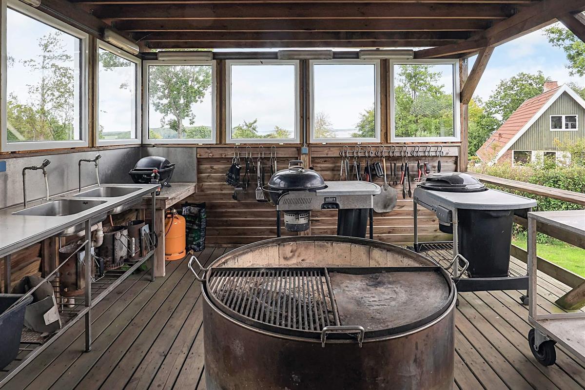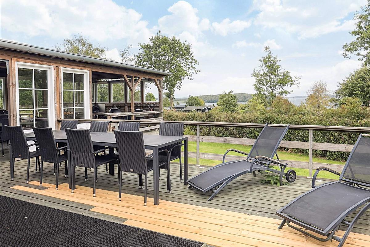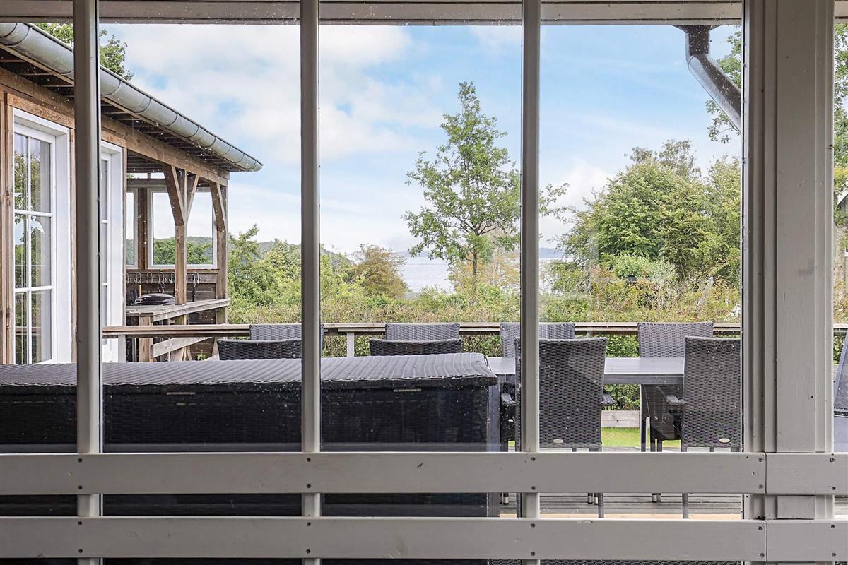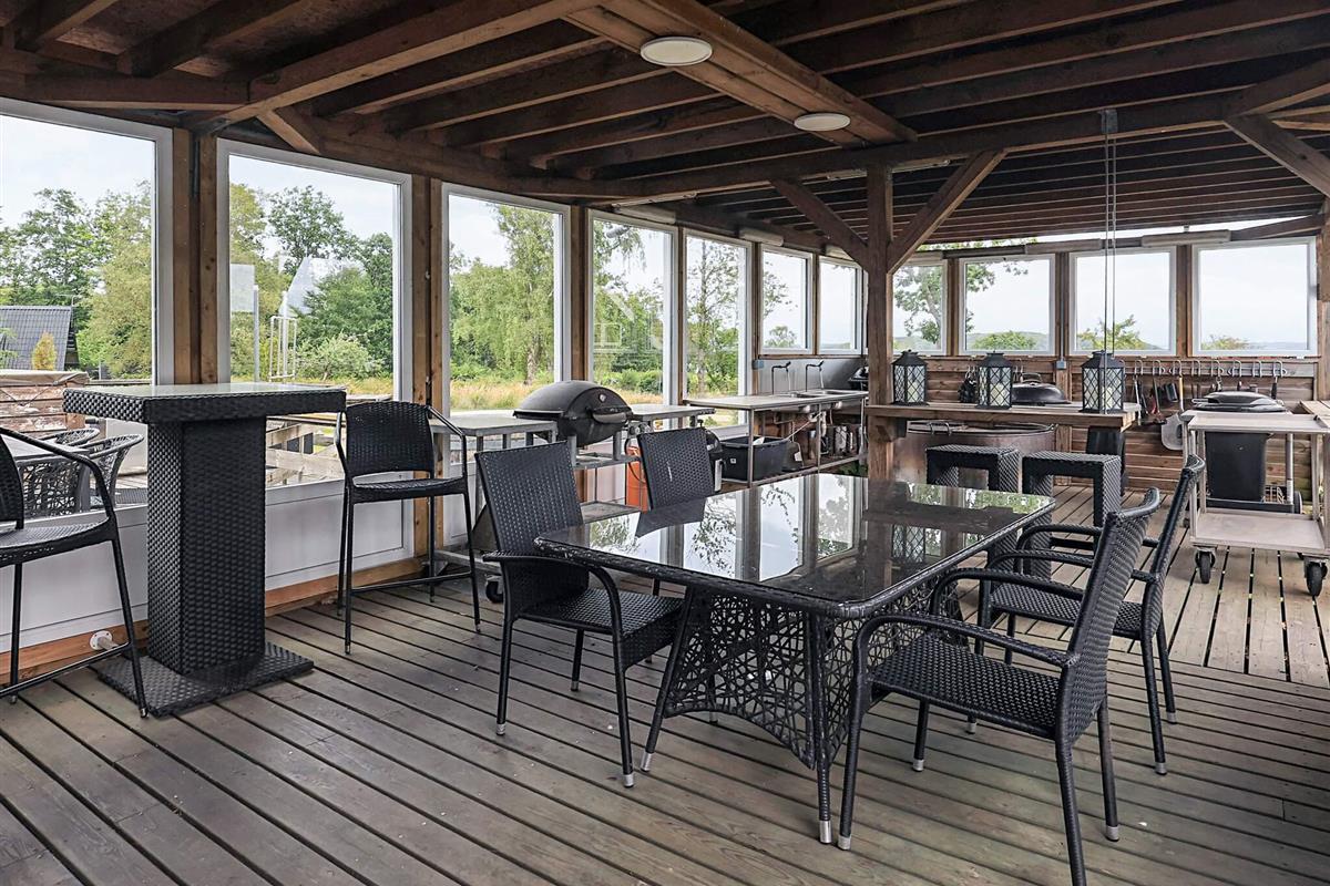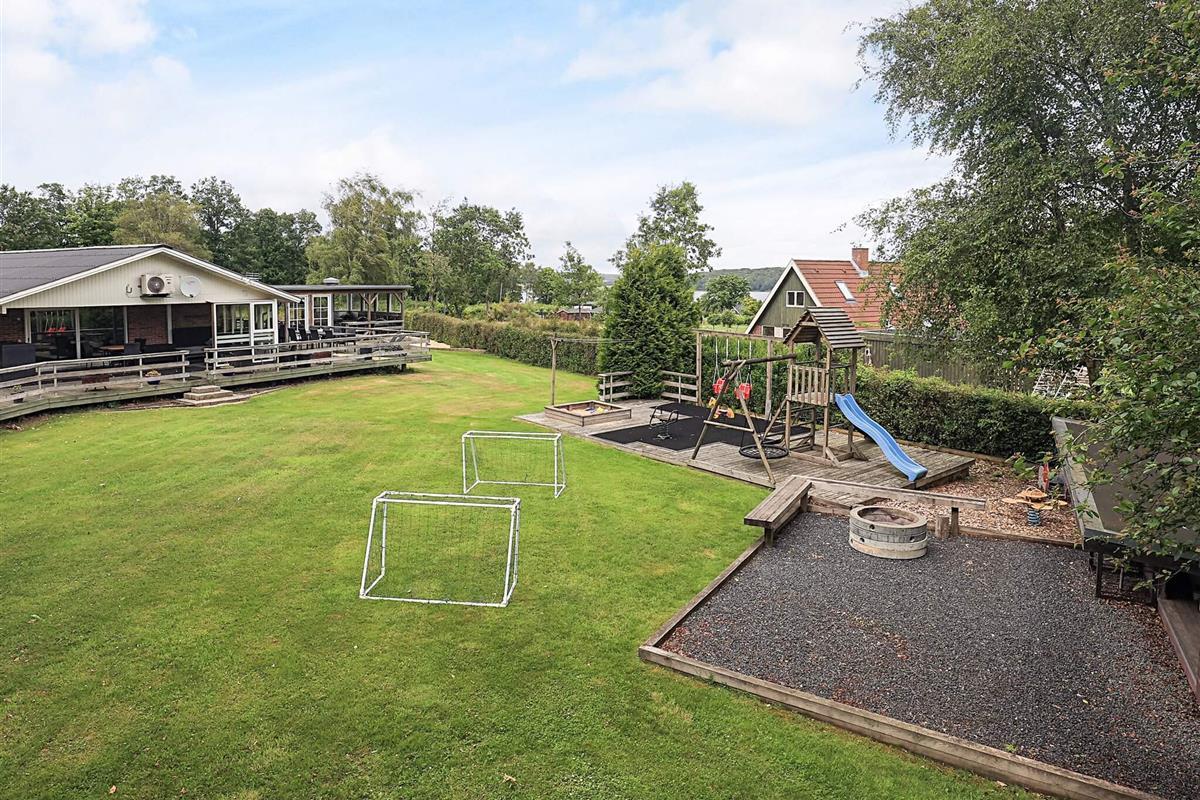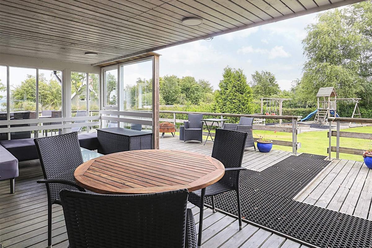eine 235 m² große Terrasse, wovon 50 m² überdacht sind und bietet Ihnen Aussicht auf den Fjord. Für die größeren Kinder ist ein isolierter Shelter vorhanden.