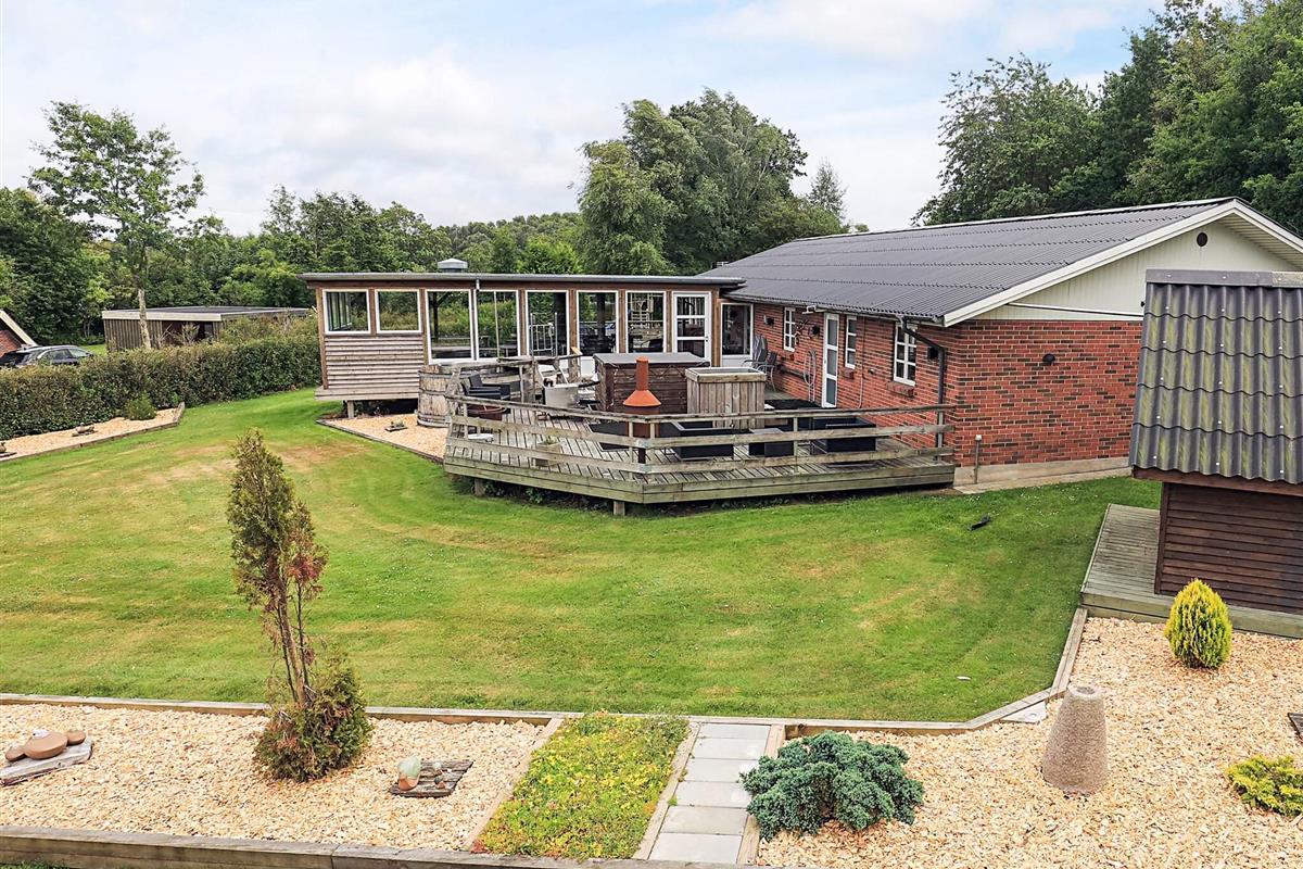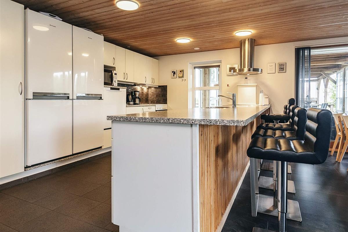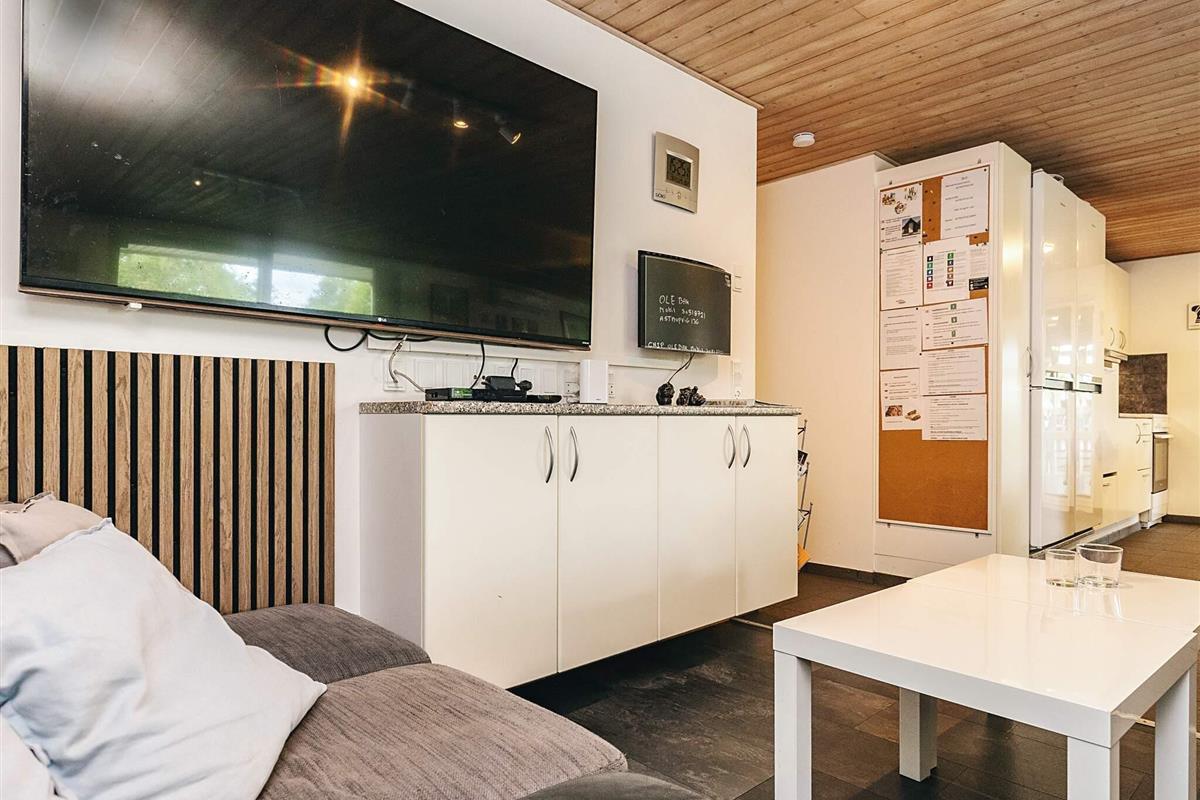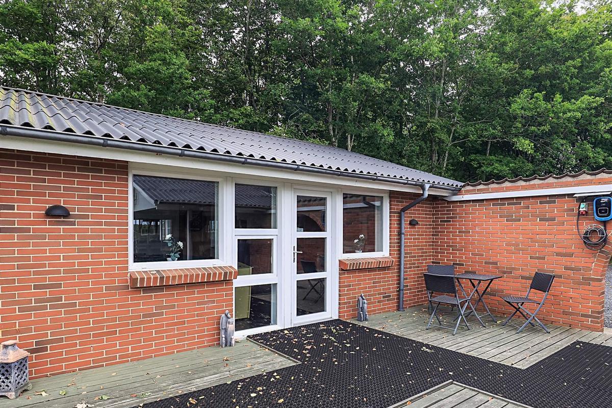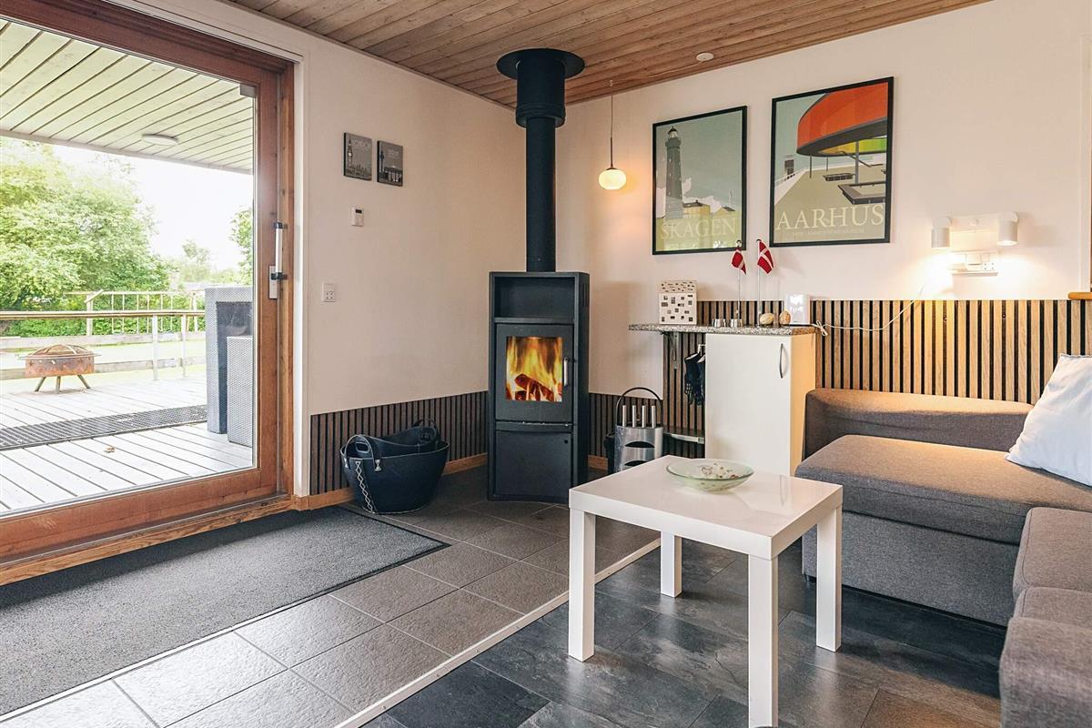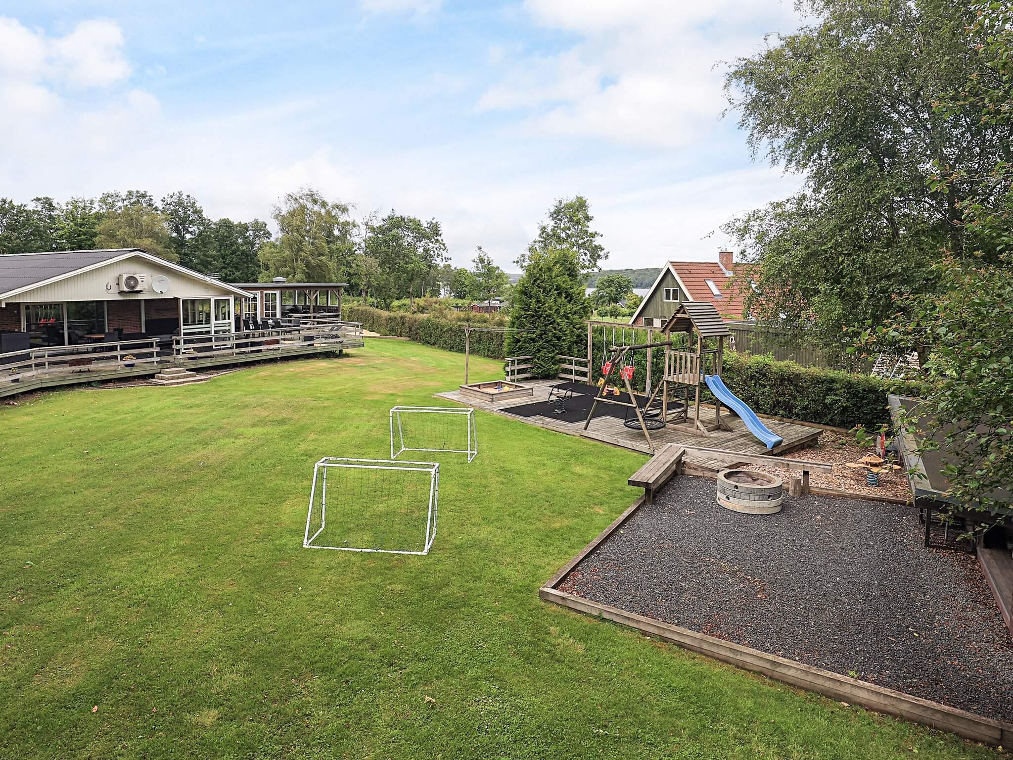 eine 235 m² große Terrasse, wovon 50 m² überdacht sind und bietet Ihnen Aussicht auf den Fjord. Für die größeren Kinder ist ein isolierter Shelter vorhanden.