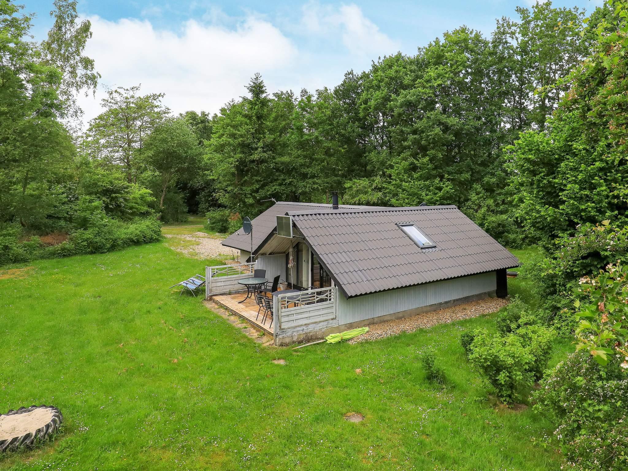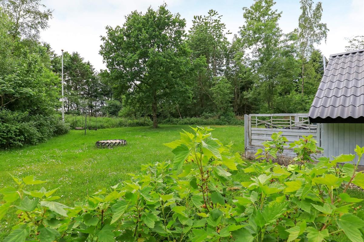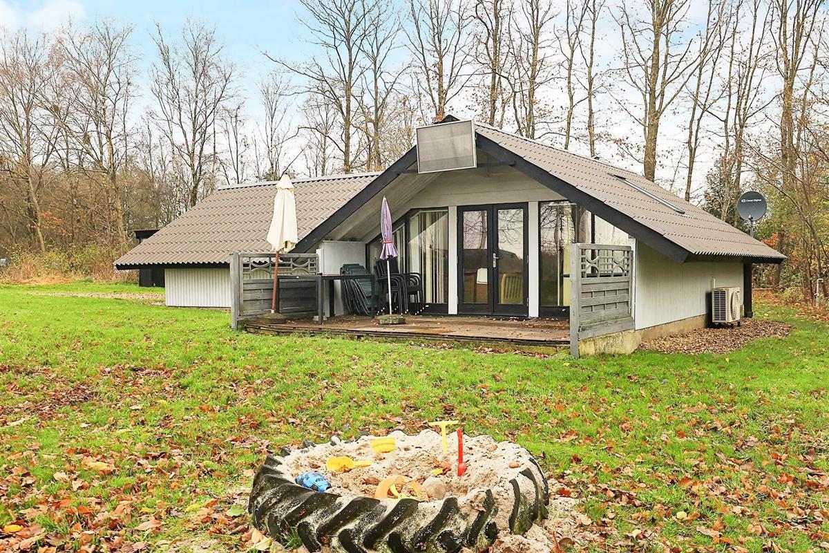 Traditionelles Ferienhaus auf einem weitläufigen, schön geschützten Naturgrundstück mit Rasenfläche unweit des Limfjordes. Zum Haus gehört u.a. eine teils überdachte Holzterrasse mit Sitzgelegenheiten für sonnige Tage.