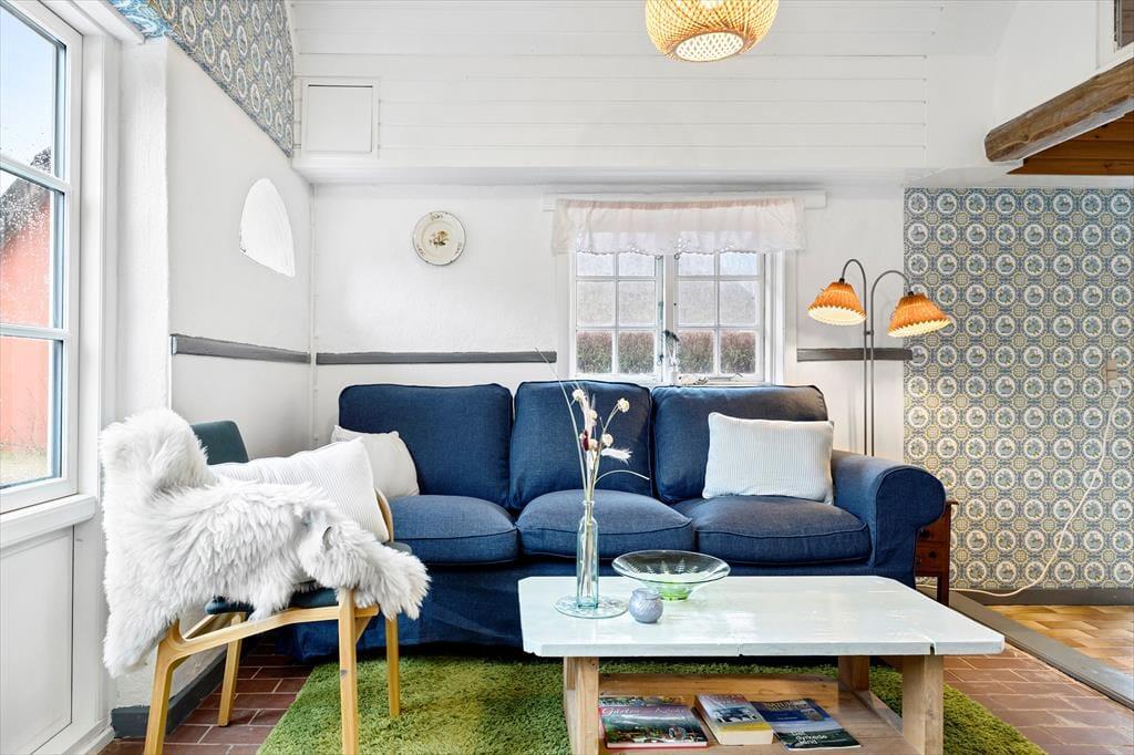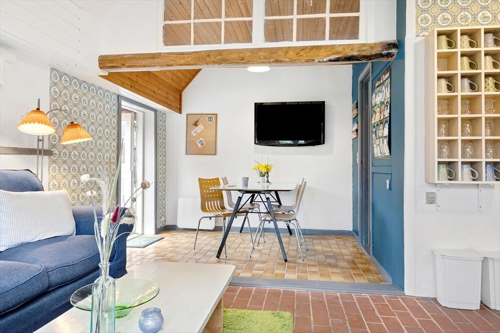 Das reetgedeckte, rote Ferienhaus, das 2024 gerade renoviert wurde, gehört zum Poppelgården-Anwesen. Das große Anwesen war ursprünglich ein Kommandantenhof und diente später sowohl als Bed & Breakfast als auch als Jugendherberge, was den speziellen Grundriss dieses Hauses erklärt. Im Bootsmannshaus findest du drei Schlafzimmer, die jeweils über ein eigenes Badezimmer und einen eigenen Eingang verfügen - hier habt ihr also eure Privatsphäre. Wenn du frühstücken, einen Kaffee trinken oder einfach nur mit dem Rest deiner Gruppe plaudern möchtest, befindet sich der Aufenthaltsraum am östlichen Ende des Hauses. Hier gibt es ein Sofa und einen Esstisch sowie eine schöne Küche. Außerdem gibt es an der Wand einen Flachbildfernseher, wenn du die Nachrichten verfolgen oder abends einen Film ansehen möchtest.