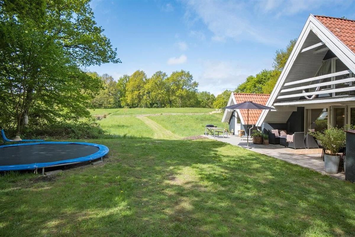 Er zijn verschillende terrasgedeeltes rond het huis met loungemeubels, eettafel, ligstoelen en barbecue. Maak het jezelf gemakkelijk onder de overdekte veranda of ontspan op het gazon. Een trampoline houdt de jongste gasten bezig. Er zijn ook verschillende zithoeken met uitzicht op zee.