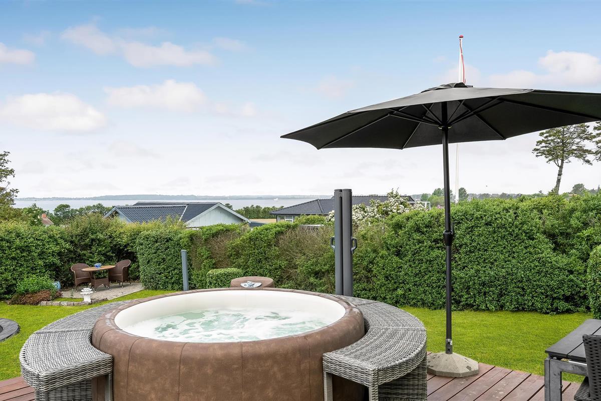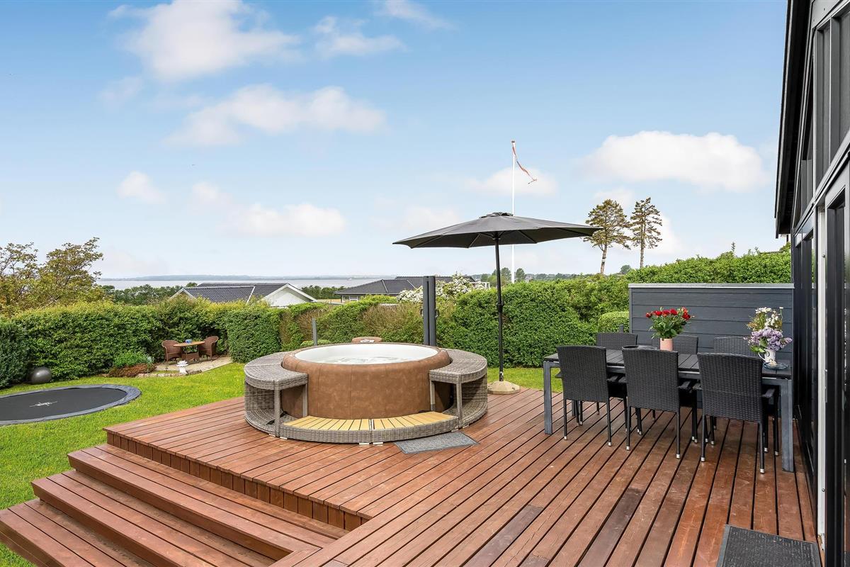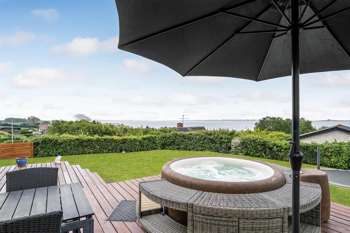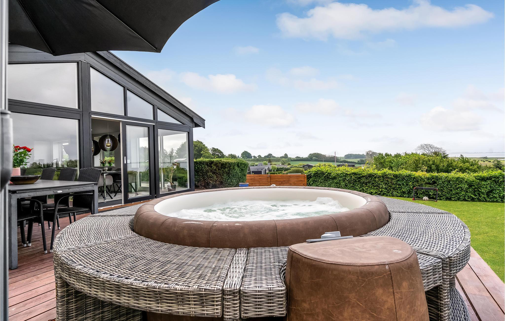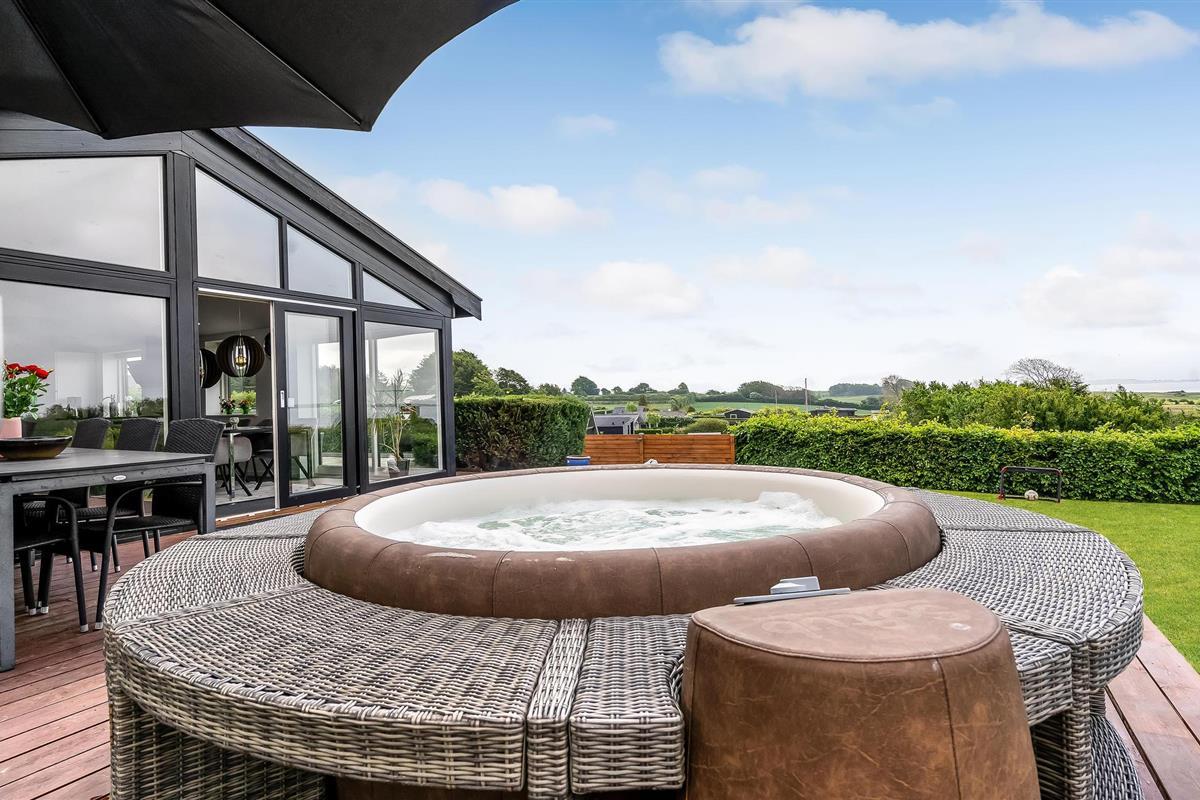 Geniet van een modern vakantiehuis met panoramisch uitzicht en een buitenwhirlpool nabij de zuidkust van Funen.