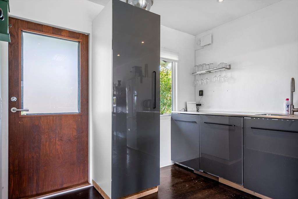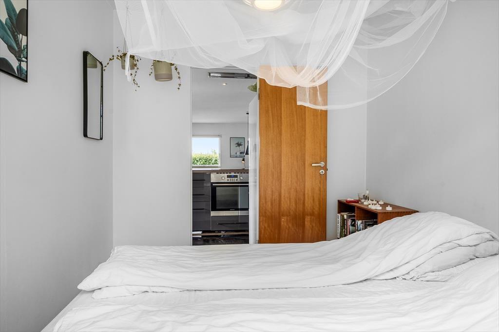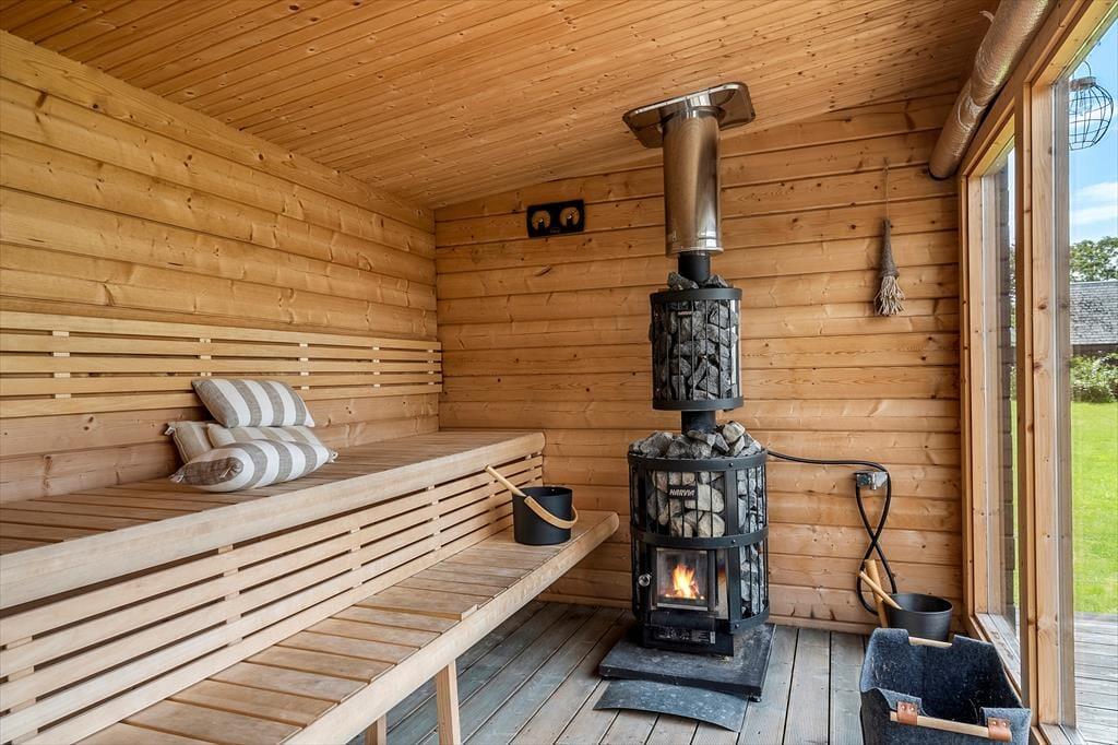 Hier befindet sich eine große, schöne Holzterrasse mit Gartenmöbeln, die teilweise überdacht ist und vom Wohnzimmer aus zugänglich ist. Auf der Terrasse befindet sich ein eingelassener Whirlpool, in dem Sie abends sitzen, die Sterne beobachten und die Ruhe genießen können. Es gibt einen großen Garten, in dem die Kinder herumtollen können, und alles lädt dazu ein, die warmen Tage und lauen Abende auf der Terrasse zu genießen. Im Garten befindet sich ein Anbau mit einer neuen Sauna, und nach einem Strandausflug können Sie den Sand unter der Außendusche abspülen.