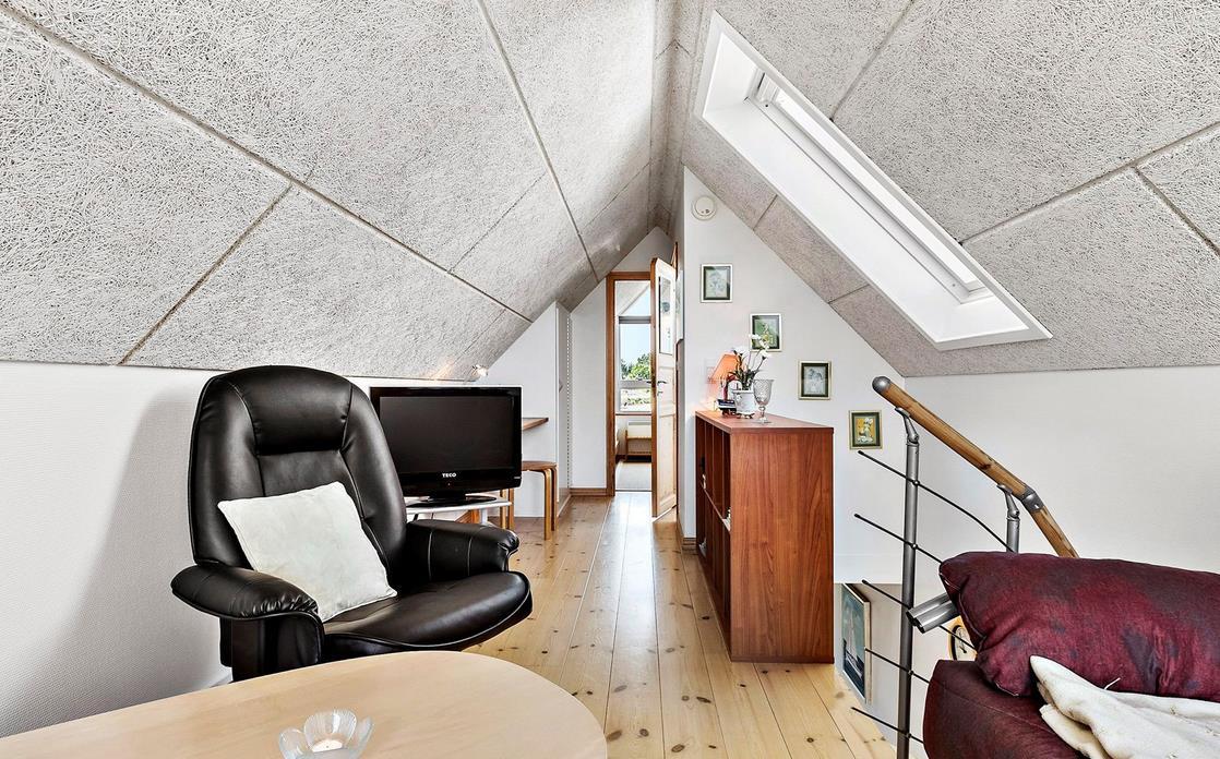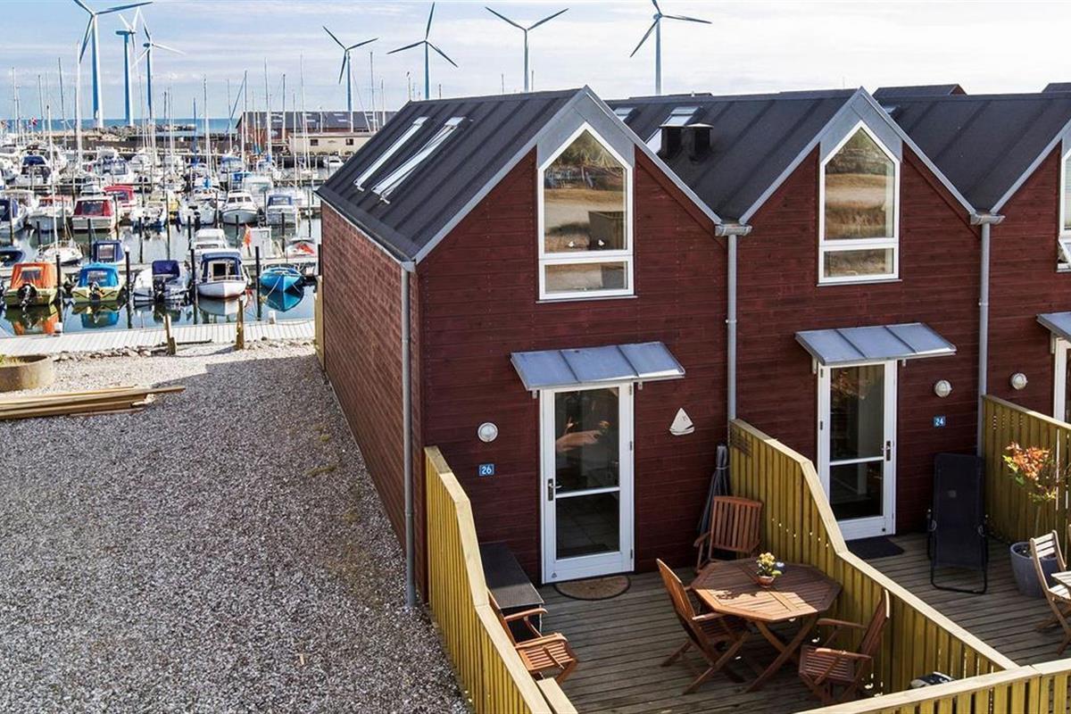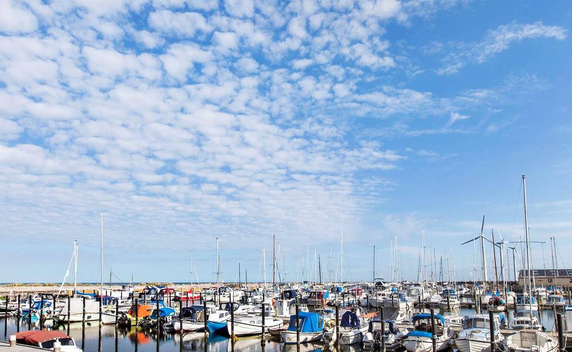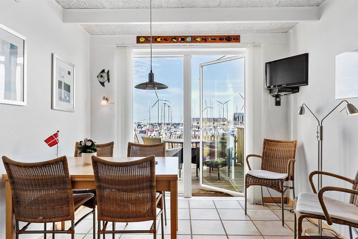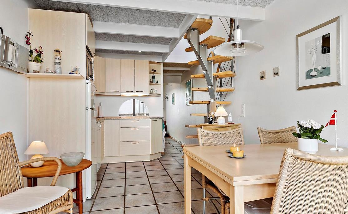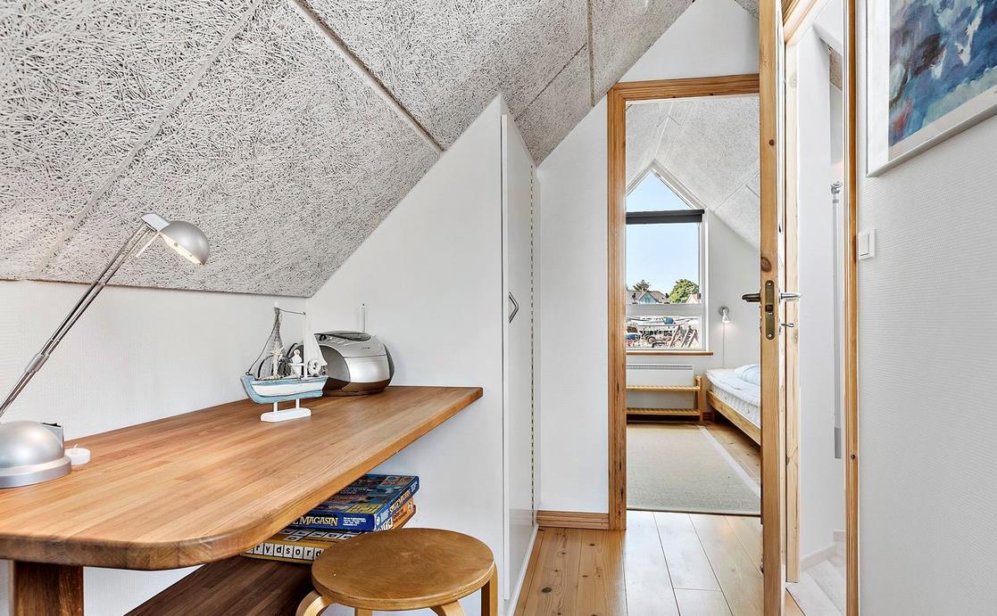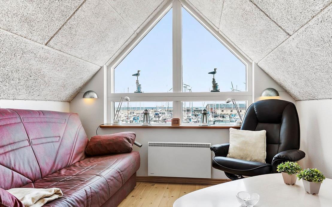 Upon entering through the hallway, you step into the bright open-plan living area with the lounge and kitchen, which leads out to the terrace overlooking the marina. The dining area comfortably seats four, and the space includes a TV with Danish (including TV2) and German channels, as well as a radio. The kitchen is well-appointed with ceramic cooktops, a microwave, and a fridge-freezer. A staircase leads up to a cozy loft area, which serves as a living/observation room, a bedroom with two single beds, and a small toilet. The spacious hallway also includes a "hidden" fold-out double bed, making the hallway function as a bedroom for two. Additionally, there is a charming bathroom with a shower niche. The entire house is equipped with underfloor heating and is well-insulated, making it suitable for year-round occupancy. Internet access is available.