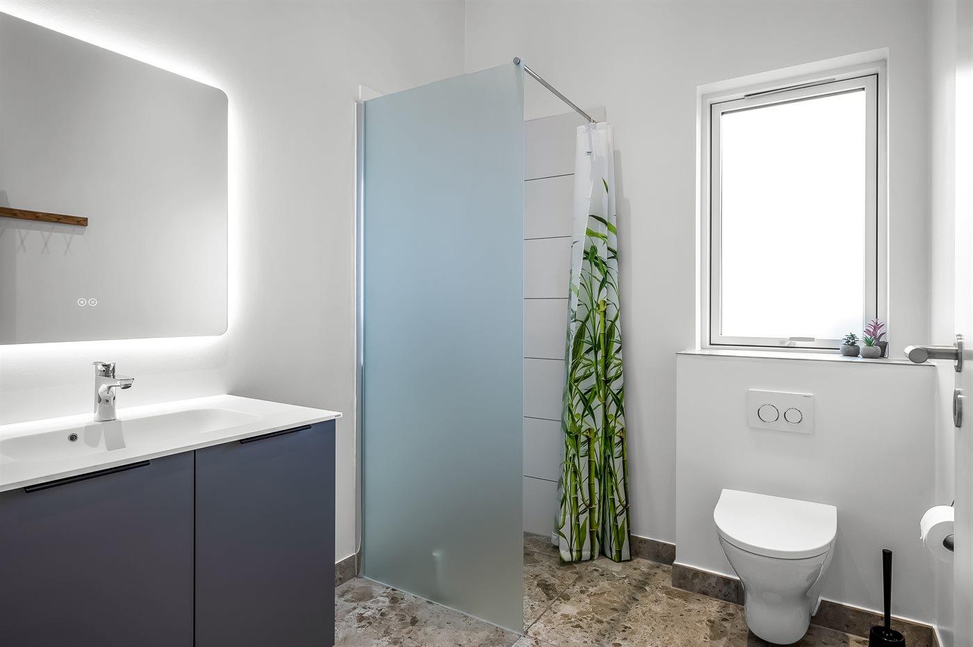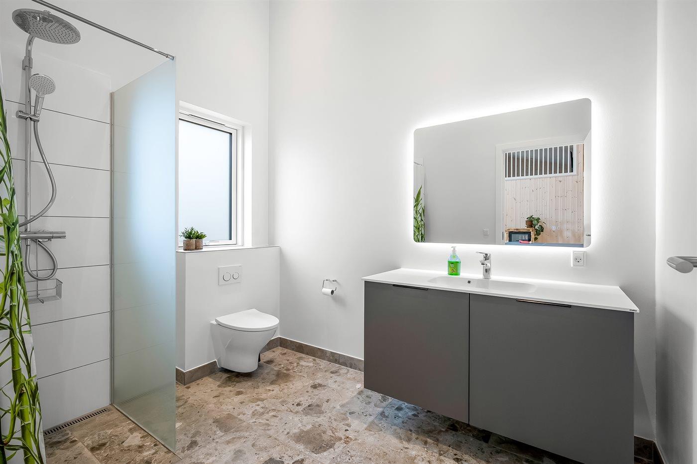 Er is 2 badkamers met douchehok en 2 toiletten. Er is vloerverwarming in 2 van de badkamers.